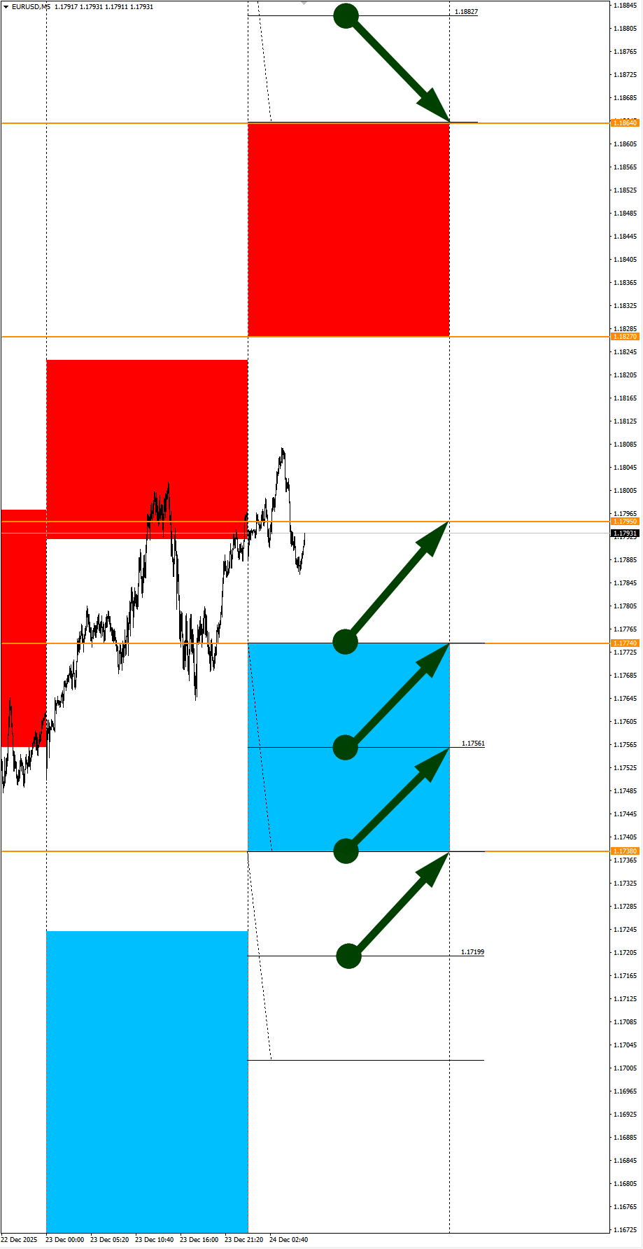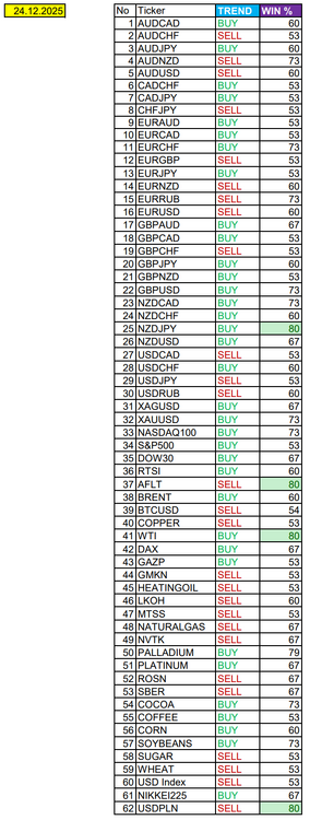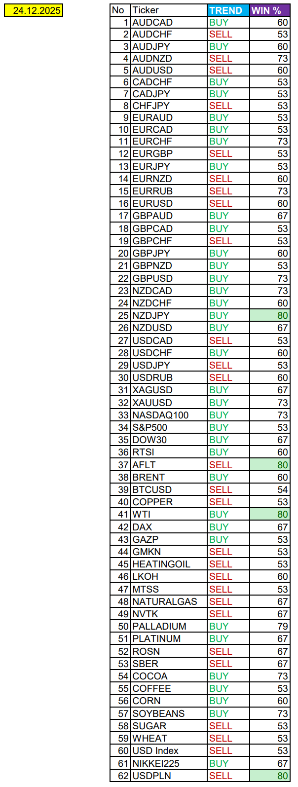 Сезонные тенденции и вероятности на среду 24.12.2025 Здравствуйте Уважаемые трейдеры! С Вами снова Александр Борских. Подготовил для Вас свежую информацию. Очередные сезонные тенденции на среду 24 декабря 2025 по основным мажорам финансовых рынков. Весь перечень анализируемых активов указан ниже в общем количестве 62 инструмента. Здесь Вы найдете активы рынка Форекс, популярные активы Московской биржи, не менее популярные активы Чикагской биржи СМЕ и мажор криптовалютного сегмента - Биткоин, за которым следуют все альткоины. Первый блок информации с зонами лимитных покупок и продаж. Данная информация включает в себя не только статистический показатель волатильности каждого актива, но и ближайшие опционные страйки с учетом премий за риск (Для верных расчетов рекомендуется просмотреть теоретическое видео в свободном доступе - Как использовать блок сезонности). А теперь сам блок информации №1: Второй блок информации с направленным вектором движения и вероятностями (внимательно обращаем внимание на цену открытия каждого актива. Обязательно для верных расчетов берем только цену открытия спотового актива). Как использовать вероятности в отношении цены открытия спотового актива - смотрим видео в открытом доступе (Как использовать блок сезонности). Данная информация с вероятностями поможет определить какова вероятность закрытия дня в отношении цены открытия этого же дня. А теперь сам блок информации №2: А теперь примеры построения блоков лимитных позиций и уточнение по сезонности с вероятностями отработки каждого актива по основным мажорам. По остальным активам, просмотрев теоретическое видео (Как использовать блок сезонности) - сможете построить лимитные блоки покупок и продаж самостоятельно. Ниже для примера продемонстрирую на сегодняшний день три основных мажора: Евро (EURUSD), Золото (XAUUSD), индекс НАСДАК (NASDAQ). EURUSD По Евро сегодня вероятность 60% к закрытию дня закрыть день ниже цены открытия дня 1,1795 Зона покупок 1,1774-1,1738 с целью 1,1795. Покупки в приоритете пока фон доллара США слабый Зона продаж 1,1827-1,1864. Но новые продажи ожидаем от уровня 1,18827 и выше с целью 1,1864. В продажах сокращаем торговый объем раза в 4, т.к. тренд восходящий XAUUSD По Золоту сегодня вероятность 73% к закрытию дня закрыть день выше цены открытия дня 4503,34 Зона покупок 4500,83-4496,76 с целью 4503,34. На азии отработали покупки от уровней 4494,89 с целью 4496,76; от уровня 4496,76 с целью 4498,82; от уровня 4498,82 с целью 4500,83. Часть покупок активна от уровня 4500,83 с ожидаемой целью 4503,34. Покупки в приоритете пока фон доллара США слабый Зона продаж 4512,85-4528,15. Но новые продажи ожидаем от уровня 4535,92 и выше с целью 4528,15. В продажах сокращаем торговый объем раза в 4, т.к. тренд восходящий! NASDAQ По индексу сегодня вероятность 73% к закрытию дня закрыть день выше цены открытия дня 25577,00 Зона покупок 25541,32-25416,00 с целью 25577,00. Покупки в приоритете пока фон доллара США слабый Зона продаж 25634,66-25883,50. Но новые продажи ожидаем от уровня 26008,76 и выше с целью 25883,50. В продажах сокращаем торговый объем раза в 4, т.к. тренд восходящий! А теперь новостная лента ожиданий аналитических агентств и разбор отдельных показателей на сегодняшний день, чего ожидать на основных торговых сессиях. Также укажем фон доллара США, сильный на текущий момент или же слабый. От фона доллара США будет зависеть направленное движение самой пары. НОВОСТИ сегодн