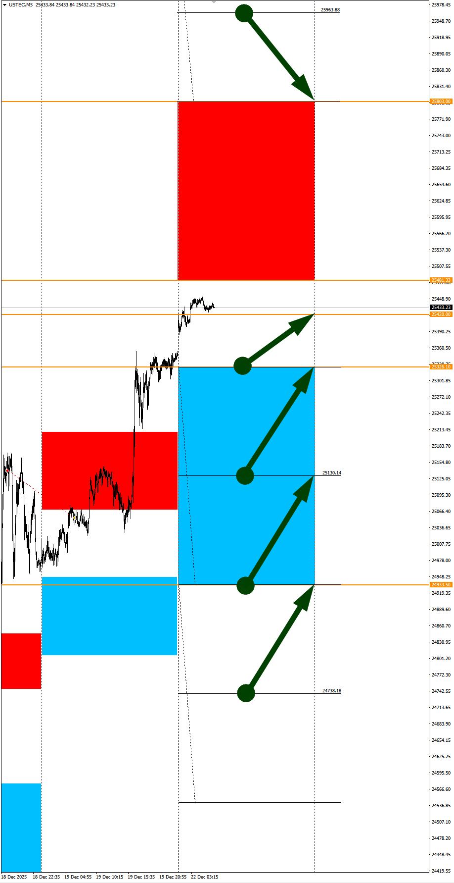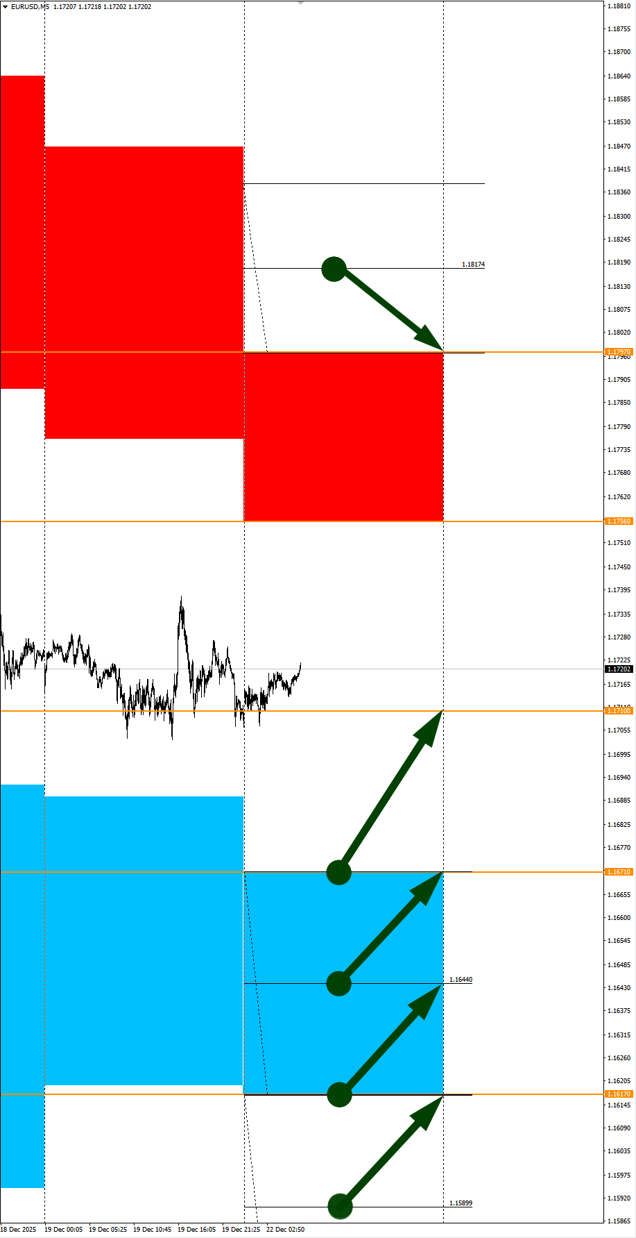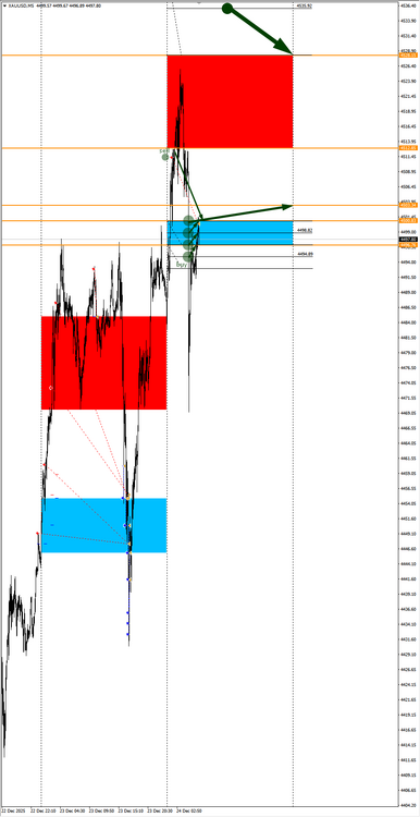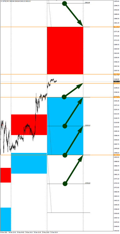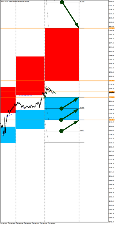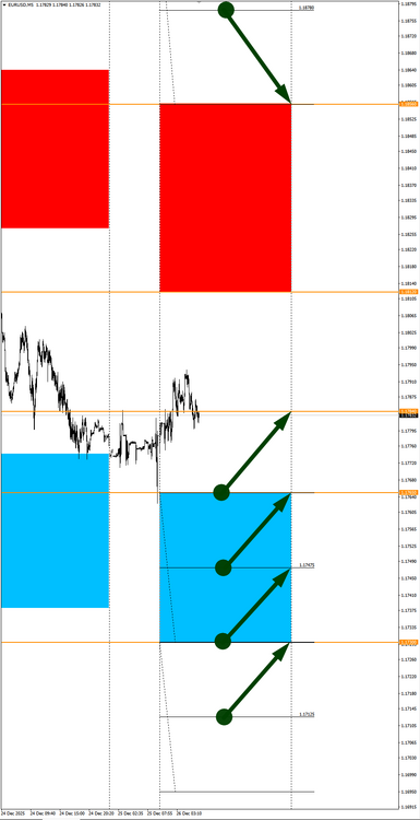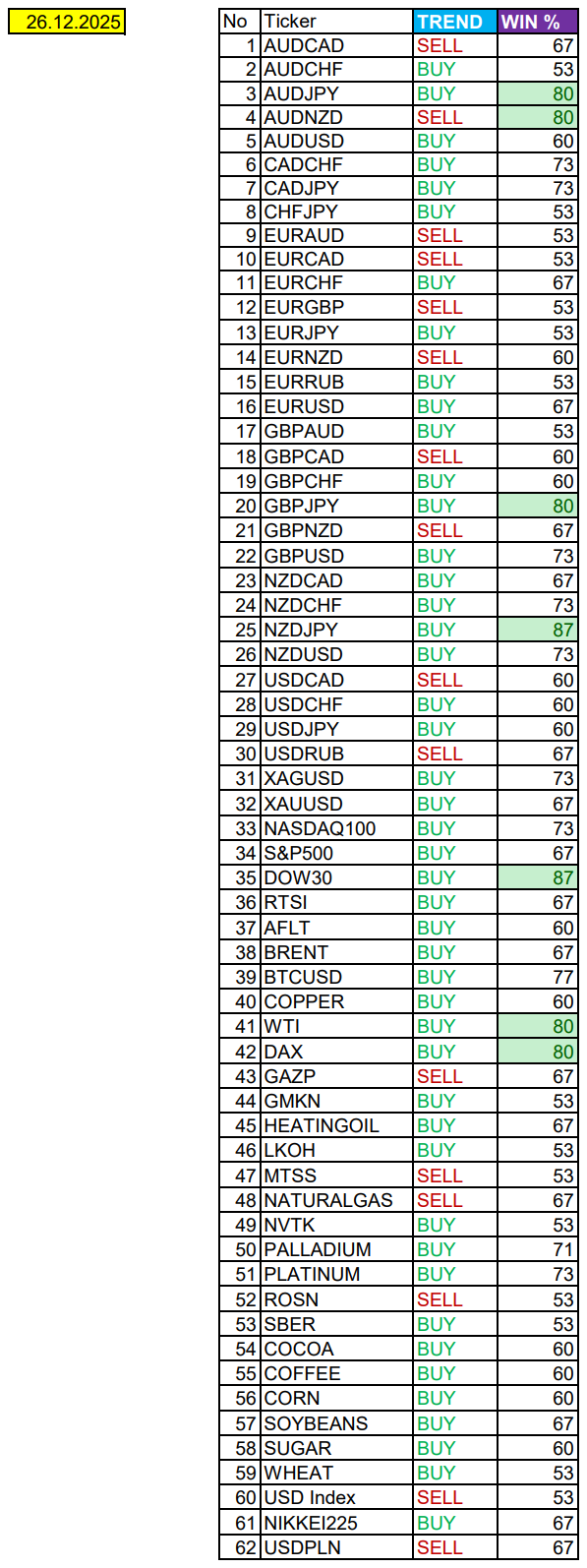 Сезонные тенденции и вероятности на пятницу 26.12.2025 Здравствуйте Уважаемые трейдеры! С Вами снова Александр Борских. Подготовил для Вас свежую информацию. Очередные сезонные тенденции на пятницу 26 декабря 2025 по основным мажорам финансовых рынков. Весь перечень анализируемых активов указан ниже в общем количестве 62 инструмента. Здесь Вы найдете активы рынка Форекс, популярные активы Московской биржи, не менее популярные активы Чикагской биржи СМЕ и мажор криптовалютного сегмента - Биткоин, за которым следуют все альткоины. Первый блок информации с зонами лимитных покупок и продаж. Данная информация включает в себя не только статистический показатель волатильности каждого актива, но и ближайшие опционные страйки с учетом премий за риск (Для верных расчетов рекомендуется просмотреть теоретическое видео в свободном доступе - Как использовать блок сезонности). А теперь сам блок информации №1: Второй блок информации с направленным вектором движения и вероятностями (внимательно обращаем внимание на цену открытия каждого актива. Обязательно для верных расчетов берем только цену открытия спотового актива). Как использовать вероятности в отношении цены открытия спотового актива - смотрим видео в открытом доступе (Как использовать блок сезонности). Данная информация с вероятностями поможет определить какова вероятность закрытия дня в отношении цены открытия этого же дня. А теперь сам блок информации №2: А теперь примеры построения блоков лимитных позиций и уточнение по сезонности с вероятностями отработки каждого актива по основным мажорам. По остальным активам, просмотрев теоретическое видео (Как использовать блок сезонности) - сможете построить лимитные блоки покупок и продаж самостоятельно. Ниже для примера продемонстрирую на сегодняшний день три основных мажора: Евро (EURUSD), Золото (XAUUSD), индекс НАСДАК (NASDAQ). EURUSD По Евро сегодня вероятность 67% к закрытию дня закрыть день выше цены открытия дня 1,1784 Зона покупок 1,1765-1,1730 с целью 1,1784. Покупки в приоритете пока фон доллара США слабый Зона продаж 1,1812-1,1856. Но новые продажи ожидаем от уровня 1,1878 и выше с целью 1,1856. В продажах сокращаем торговый объем раза в 4, т.к. тренд восходящий! XAUUSD По Золоту сегодня вероятность 67% к закрытию дня закрыть день выше цены открытия дня 4495,56 Зона покупок 4491,25-4485,91 с целью 4495,56. Все покупки от проекции 4483,28 до цели открытия 4495,56 отработали с открытия дня. Покупки в приоритете пока фон доллара США слабый Зона продаж 4506,02-4521,86. Но новые продажи ожидали от уровня 4529,83 и выше с целью 4521,86. Продажи от проекции 4529,83 до цели 4521,86 отработали с на азии. В продажах сокращаем торговый объем раза в 4, т.к. тренд восходящий! NASDAQ По индексу сегодня вероятность 73% к закрытию дня закрыть день выше цены открытия дня 25657,00 Зона покупок 25622,07-25477,75 с целью 25657,00. Часть покупок отработали с открытия дня от уровня 25622,07 с целью 25657,00. Новые покупки ожидаем от уровня 25550,04 и ниже с целями на графике. Покупки в приоритете пока фон доллара США слабый Зона продаж 25728,32-26065,00. Но новые продажи ожидаем от уровня 26233,56 и выше с целью 26065,00. В продажах сокращаем торговый объем раза в 4, т.к. тренд восходящий! А теперь новостная лента ожиданий аналитических агентств и разбор отдельных показателей на сегодняшний день, чего ожидать на основных торговых сессиях. Также укажем фон доллара США, сильный на текущий мо