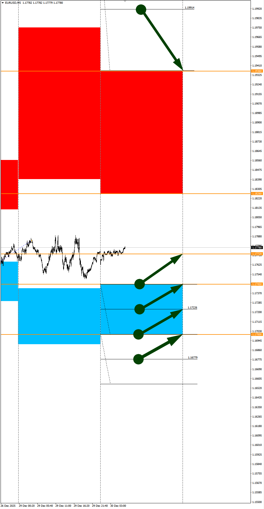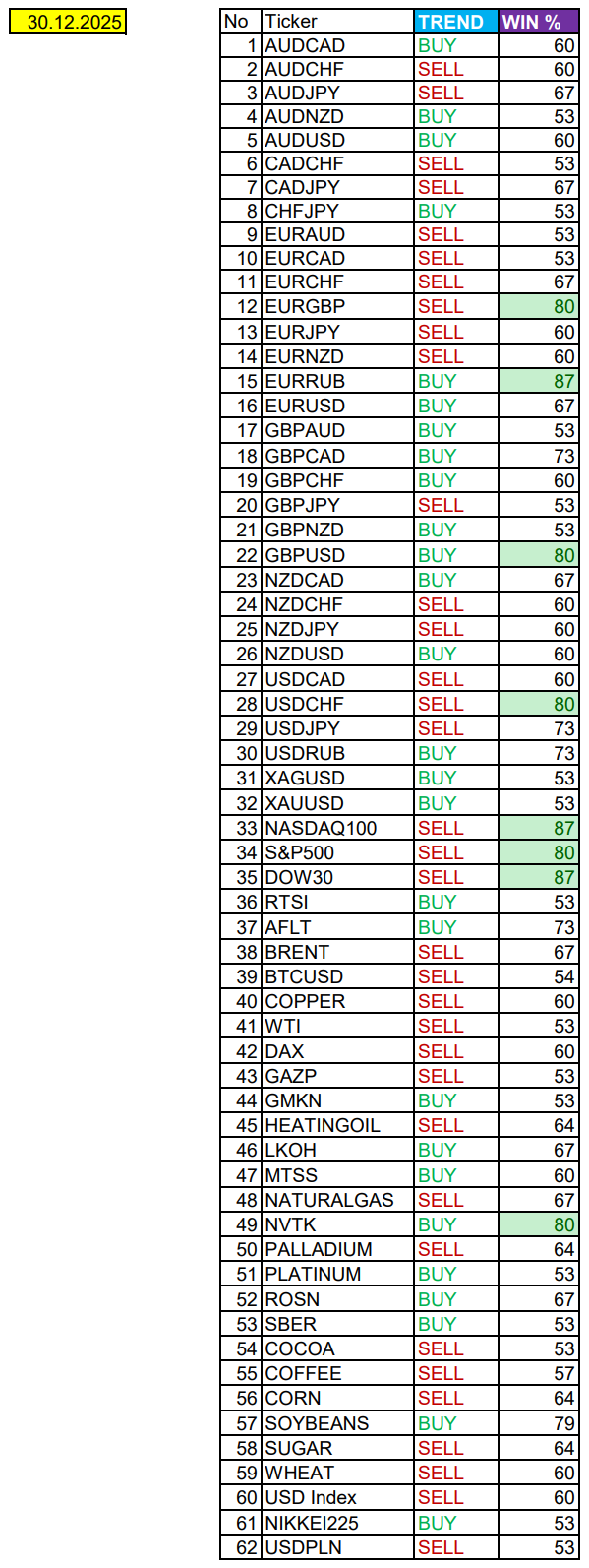 Сезонные тенденции и вероятности на вторник 30.12.2025 Здравствуйте Уважаемые трейдеры! С Вами снова Александр Борских. Подготовил для Вас свежую информацию. Очередные сезонные тенденции на вторник 30 декабря 2025 по основным мажорам финансовых рынков. Весь перечень анализируемых активов указан ниже в общем количестве 62 инструмента. Здесь Вы найдете активы рынка Форекс, популярные активы Московской биржи, не менее популярные активы Чикагской биржи СМЕ и мажор криптовалютного сегмента - Биткоин, за которым следуют все альткоины. Первый блок информации с зонами лимитных покупок и продаж. Данная информация включает в себя не только статистический показатель волатильности каждого актива, но и ближайшие опционные страйки с учетом премий за риск (Для верных расчетов рекомендуется просмотреть теоретическое видео в свободном доступе - Как использовать блок сезонности). А теперь сам блок информации №1: Второй блок информации с направленным вектором движения и вероятностями (внимательно обращаем внимание на цену открытия каждого актива. Обязательно для верных расчетов берем только цену открытия спотового актива). Как использовать вероятности в отношении цены открытия спотового актива - смотрим видео в открытом доступе (Как использовать блок сезонности). Данная информация с вероятностями поможет определить какова вероятность закрытия дня в отношении цены открытия этого же дня. А теперь сам блок информации №2: А теперь примеры построения блоков лимитных позиций и уточнение по сезонности с вероятностями отработки каждого актива по основным мажорам. По остальным активам, просмотрев теоретическое видео (Как использовать блок сезонности) - сможете построить лимитные блоки покупок и продаж самостоятельно. Ниже для примера продемонстрирую на сегодняшний день три основных мажора: Евро (EURUSD), Золото (XAUUSD), индекс НАСДАК (NASDAQ). EURUSD По Евро сегодня вероятность 67% к закрытию дня закрыть день выше цены открытия дня 1,1772 Зона покупок 1,1745-1,1700 с целью 1,1772. Покупки в приоритете пока фон доллара США слабый Зона продаж 1,1826-1,1936. Но новые продажи ожидаем от уровня 1,19914 и выше с целью 1,1936. В продажах сокращаем торговый объем раза в 4, т.к. тренд восходящий XAUUSD По Золоту сегодня вероятность 53% к закрытию дня закрыть день выше цены открытия дня 4343,76 Зона покупок 4336,39-4319,36 с целью 4343,76. Часть покупок отработали с открытия дня от уровня 4327,99 с целью 4336,39; от уровня 4336,39 с целью 4343,76. Новые покупки ожидаем от уровня 4319,36 и ниже с целями на графике. Покупки в приоритете пока фон доллара США слабый Зона продаж 4354,74-4379,13. Но новые продажи ожидаем от уровня 4391,43 и выше с целью 4379,13. В продажах сокращаем торговый объем раза в 4, т.к. тренд восходящий NASDAQ По индексу сегодня вероятность 87% к закрытию дня закрыть день ниже цены открытия дня 25491,00 Зона покупок 25405,55-25033,00 с целью 25491,00. Покупки в приоритете пока фон доллара США слабый Зона продаж 25517,68-25584,50. Но новые продажи ожидаем от уровня 25618,77 и выше с целью 25584,50. В продажах сокращаем торговый объем раза в 4, т.к. тренд восходящий А теперь новостная лента ожиданий аналитических агентств и разбор отдельных показателей на сегодняшний день, чего ожидать на основных торговых сессиях. Также укажем фон доллара США, сильный на текущий момент или же слабый. От фона доллара США будет зависеть направленное движение самой пары. НОВОСТИ сегодня: Фон д