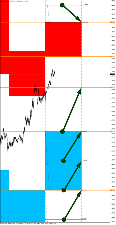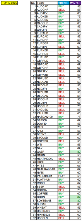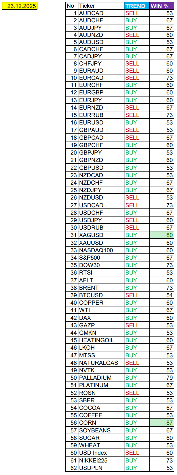 Сезонные тенденции и вероятности на вторник 23.12.2025 Здравствуйте Уважаемые трейдеры! С Вами снова Александр Борских. Подготовил для Вас свежую информацию. Очередные сезонные тенденции на вторник 23 декабря 2025 по основным мажорам финансовых рынков. Весь перечень анализируемых активов указан ниже в общем количестве 62 инструмента. Здесь Вы найдете активы рынка Форекс, популярные активы Московской биржи, не менее популярные активы Чикагской биржи СМЕ и мажор криптовалютного сегмента - Биткоин, за которым следуют все альткоины. Первый блок информации с зонами лимитных покупок и продаж. Данная информация включает в себя не только статистический показатель волатильности каждого актива, но и ближайшие опционные страйки с учетом премий за риск (Для верных расчетов рекомендуется просмотреть теоретическое видео в свободном доступе - Как использовать блок сезонности). А теперь сам блок информации №1: Второй блок информации с направленным вектором движения и вероятностями (внимательно обращаем внимание на цену открытия каждого актива. Обязательно для верных расчетов берем только цену открытия спотового актива). Как использовать вероятности в отношении цены открытия спотового актива - смотрим видео в открытом доступе (Как использовать блок сезонности). Данная информация с вероятностями поможет определить какова вероятность закрытия дня в отношении цены открытия этого же дня. А теперь сам блок информации №2: А теперь примеры построения блоков лимитных позиций и уточнение по сезонности с вероятностями отработки каждого актива по основным мажорам. По остальным активам, просмотрев теоретическое видео (Как использовать блок сезонности) - сможете построить лимитные блоки покупок и продаж самостоятельно. Ниже для примера продемонстрирую на сегодняшний день три основных мажора: Евро (EURUSD), Золото (XAUUSD), индекс НАСДАК (NASDAQ). EURUSD По Евро сегодня вероятность 53% к закрытию дня закрыть день выше цены открытия дня 1,1764 Зона покупок 1,1724-1,1671 с целью 1,1764. Покупки в приоритете пока фон доллара США слабый Зона продаж 1,1792-1,1823. Но новые продажи ожидаем от уровня 1,18385 и выше с целью 1,1823. В продажах сокращаем торговый объем раза в 4. т.к. тренд восходящий! XAUUSD По Золоту сегодня вероятность 60% к закрытию дня закрыть день выше цены открытия дня 4460,22 Зона покупок 4454,95-4445,95 с целью 4460,22. Покупки в приоритете пока фон доллара США слабый Зона продаж 4469,59-4485,03. Но продажи отработали от уровня 4492,97 с целью 4485,03. В продажах сокращаем торговый объем раза в 4, т.к. тренд восходящий! NASDAQ По индексу сегодня вероятность 60% к закрытию дня закрыть день выше цены открытия дня 25475,00 Зона покупок 25433,04-25330,25 с целью 25475,00. Покупки в приоритете пока фон доллара США слабый Зона продаж 25522,70-25685,75. Но новые продажи ожидаем от уровня 25767,93 и выше с целью 25685,75. В продажах сокращаем торговый объем раза в 4, т.к. тренд восходящий! А теперь новостная лента ожиданий аналитических агентств и разбор отдельных показателей на сегодняшний день, чего ожидать на основных торговых сессиях. Также укажем фон доллара США, сильный на текущий момент или же слабый. От фона доллара США будет зависеть направленное движение самой пары. НОВОСТИ сегодня: Фон доллара США слабый 10:00 МСК - ожидания частичного ослабления EUR *16:30 - данные по макроэкономической статистике США с задержкой 18:00 - ожидания укрепления доллара США USD Важ