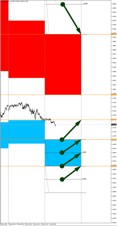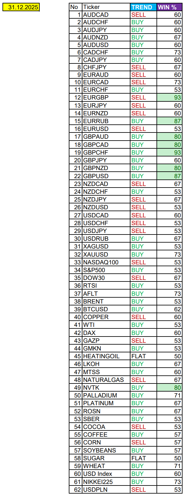 Сезонные тенденции и вероятности на пятницу 02.01.2026 Здравствуйте Уважаемые трейдеры! С Вами снова Александр Борских. Подготовил для Вас свежую информацию. Очередные сезонные тенденции на пятницу 02 января 2026 по основным мажорам финансовых рынков. Весь перечень анализируемых активов указан ниже в общем количестве 62 инструмента. Здесь Вы найдете активы рынка Форекс, популярные активы Московской биржи, не менее популярные активы Чикагской биржи СМЕ и мажор криптовалютного сегмента - Биткоин, за которым следуют все альткоины. Первый блок информации с зонами лимитных покупок и продаж. Данная информация включает в себя не только статистический показатель волатильности каждого актива, но и ближайшие опционные страйки с учетом премий за риск (Для верных расчетов рекомендуется просмотреть теоретическое видео в свободном доступе - Как использовать блок сезонности). А теперь сам блок информации №1: Второй блок информации с направленным вектором движения и вероятностями (внимательно обращаем внимание на цену открытия каждого актива. Обязательно для верных расчетов берем только цену открытия спотового актива). Как использовать вероятности в отношении цены открытия спотового актива - смотрим видео в открытом доступе (Как использовать блок сезонности). Данная информация с вероятностями поможет определить какова вероятность закрытия дня в отношении цены открытия этого же дня. А теперь сам блок информации №2: А теперь примеры построения блоков лимитных позиций и уточнение по сезонности с вероятностями отработки каждого актива по основным мажорам. По остальным активам, просмотрев теоретическое видео (Как использовать блок сезонности) - сможете построить лимитные блоки покупок и продаж самостоятельно. Ниже для примера продемонстрирую на сегодняшний день три основных мажора: Евро (EURUSD), Золото (XAUUSD), индекс НАСДАК (NASDAQ). EURUSD По Евро сегодня вероятность 73% к закрытию дня закрыть день ниже цены открытия дня 1,1751 Зона покупок 1,1698-1,1611 с целью 1,1751. Покупки в приоритете пока фон доллара США слабый Зона продаж 1,1787-1,1890. Но новые продажи ожидаем от уровня 1,19418 и выше с целью 1,1890. В продажах сокращаем торговый объем раза в 4, т.к. тренд восходящий XAUUSD По Золоту сегодня вероятность 67% к закрытию дня закрыть день выше цены открытия дня 4349,11 Зона покупок 4346,59-4335,16. Но новые покупки ожидали от уровня 4329,49 и ниже с целью 4335,16. С открытия рынка отработали покупки от уровня 4329,49 с целью 4335,16. В покупках сокращаем торговый объем раза в 4, т.к. баланс. Зона продаж 4359,21-4375,27. Но новые продажи ожидаем от уровня 4383,30 и выше с целью 4375,27. В продажах сокращаем торговый объем раза в 4, т.к. баланс NASDAQ По индексу сегодня вероятность 57% к закрытию дня закрыть день выше цены открытия дня 25291,00 Зона покупок 25210,27-24894,50 с целью 25291,00. Покупки в приоритете пока фон доллара США слабый Зона продаж 25334,82-25415,75. Но новые продажи ожидаем от уровня 25456,49 и выше с целью 25415,75. В продажах сокращаем торговый объем раза в 4, т.к. тренд восходящий А теперь новостная лента ожиданий аналитических агентств и разбор отдельных показателей на сегодняшний день, чего ожидать на основных торговых сессиях. Также укажем фон доллара США, сильный на текущий момент или же слабый. От фона доллара США будет зависеть направленное движение самой пары. НОВОСТИ сегодня: Фон доллара США слабый 10:00 МСК - ожидания частичного ослаб