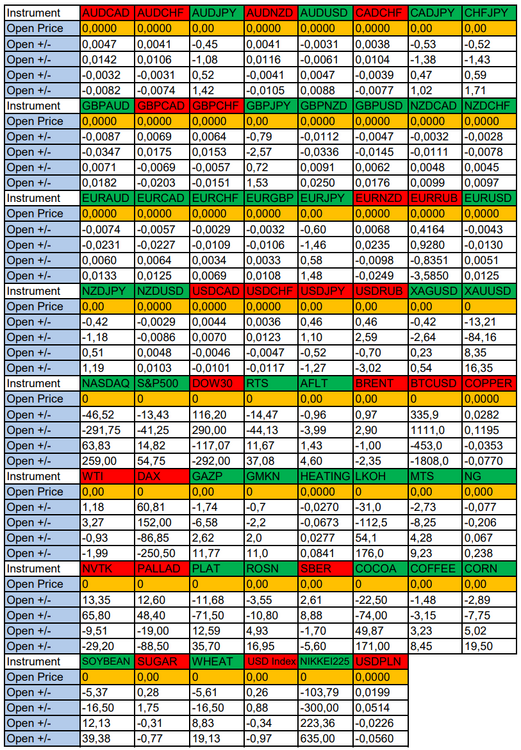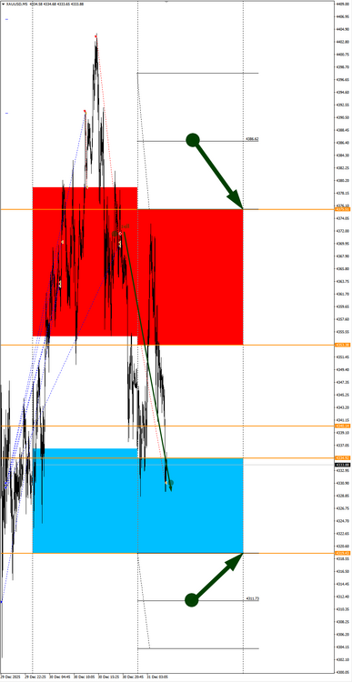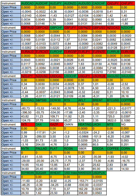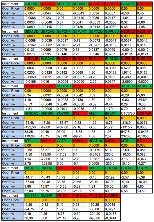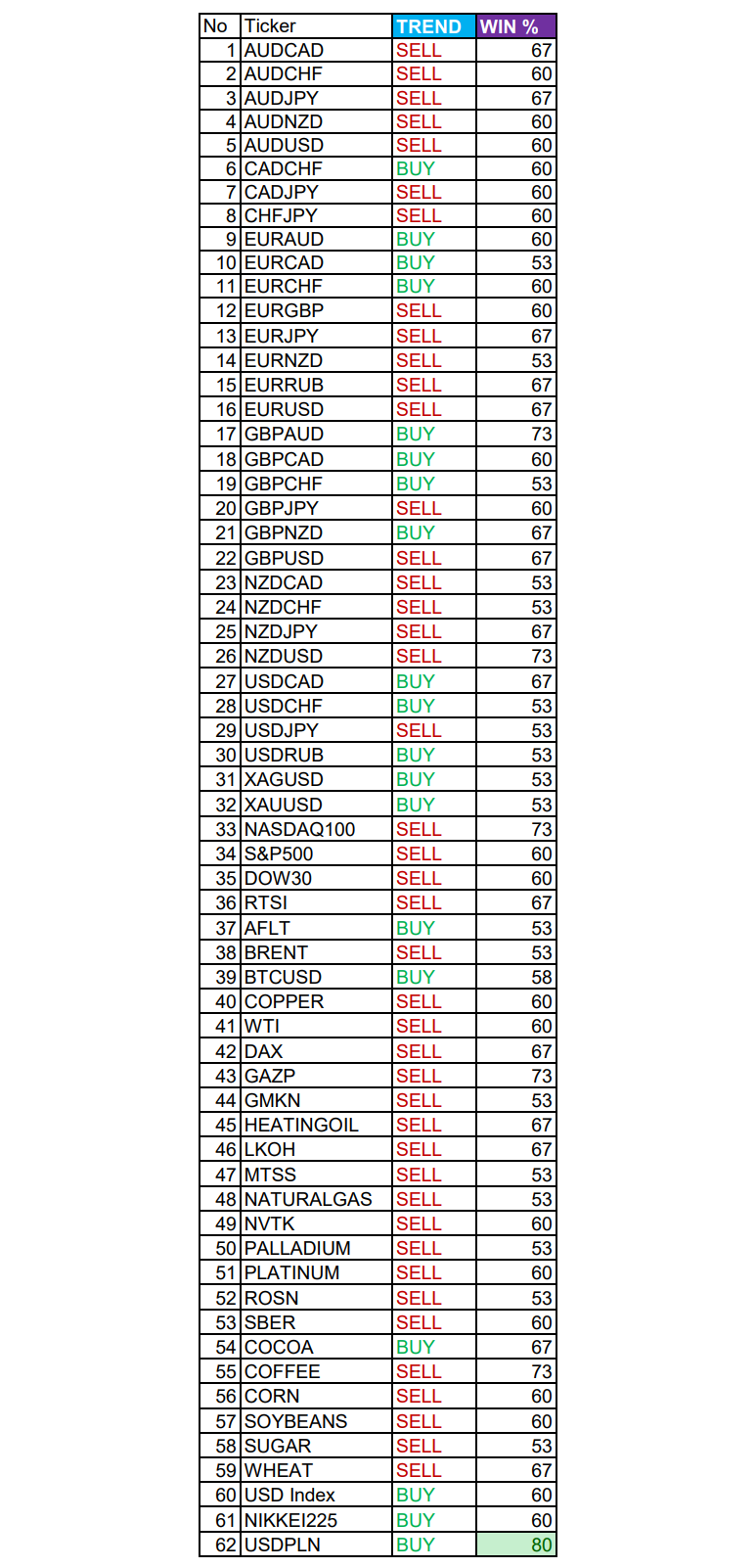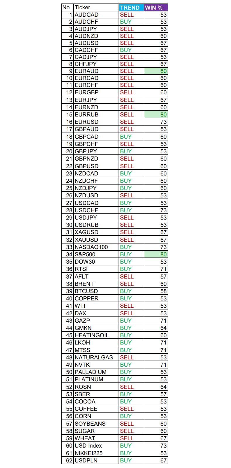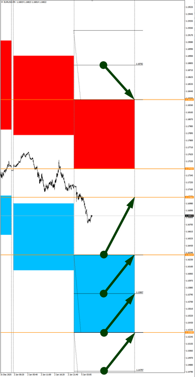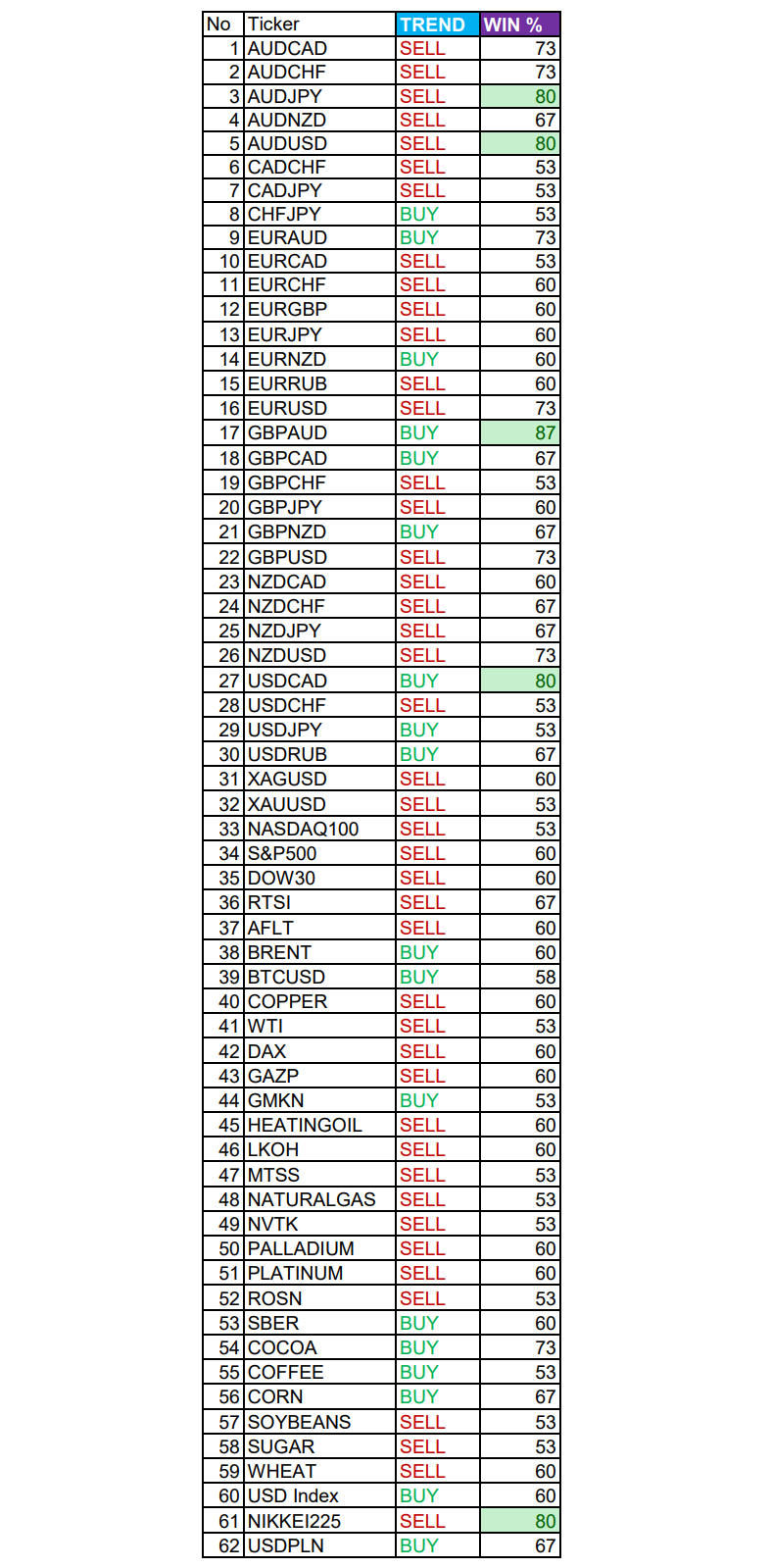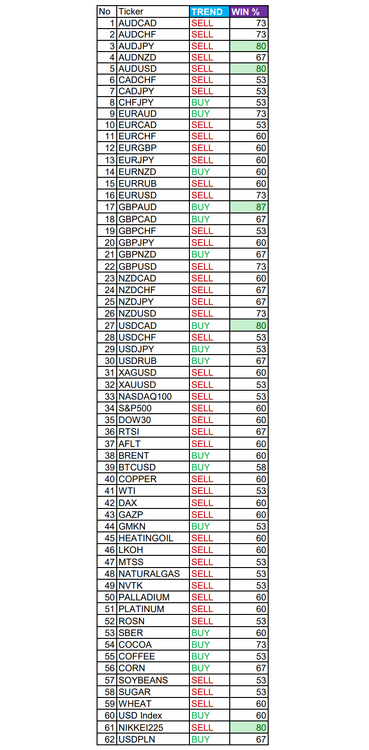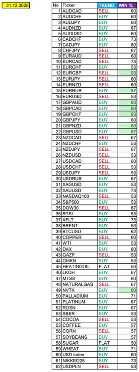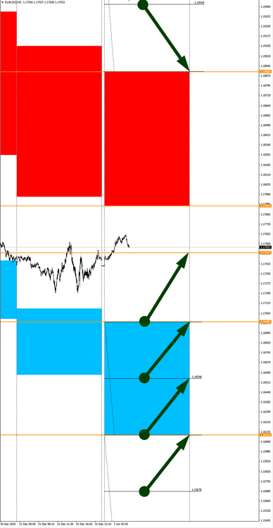 Сезонные тенденции и вероятности на понедельник 05.01.2026 Здравствуйте Уважаемые трейдеры! С Вами снова Александр Борских. Подготовил для Вас свежую информацию. Очередные сезонные тенденции на понедельник 05 января 2026 по основным мажорам финансовых рынков. Весь перечень анализируемых активов указан ниже в общем количестве 62 инструмента. Здесь Вы найдете активы рынка Форекс, популярные активы Московской биржи, не менее популярные активы Чикагской биржи СМЕ и мажор криптовалютного сегмента - Биткоин, за которым следуют все альткоины. Первый блок информации с зонами лимитных покупок и продаж. Данная информация включает в себя не только статистический показатель волатильности каждого актива, но и ближайшие опционные страйки с учетом премий за риск (Для верных расчетов рекомендуется просмотреть теоретическое видео в свободном доступе - Как использовать блок сезонности). А теперь сам блок информации №1: Второй блок информации с направленным вектором движения и вероятностями (внимательно обращаем внимание на цену открытия каждого актива. Обязательно для верных расчетов берем только цену открытия спотового актива). Как использовать вероятности в отношении цены открытия спотового актива - смотрим видео в открытом доступе (Как использовать блок сезонности). Данная информация с вероятностями поможет определить какова вероятность закрытия дня в отношении цены открытия этого же дня. А теперь сам блок информации №2: А теперь примеры построения блоков лимитных позиций и уточнение по сезонности с вероятностями отработки каждого актива по основным мажорам. По остальным активам, просмотрев теоретическое видео (Как использовать блок сезонности) - сможете построить лимитные блоки покупок и продаж самостоятельно. Ниже для примера продемонстрирую на сегодняшний день три основных мажора: Евро (EURUSD), Золото (XAUUSD), индекс НАСДАК (NASDAQ). EURUSD По Евро сегодня вероятность 67% к закрытию дня закрыть день ниже цены открытия дня 1,1706 Зона покупок 1,1631-1,1530 с целью 1,1706. Покупки в приоритете пока фон доллара США слабый Зона продаж 1,1743-1,1833. Но новые продажи ожидаем от уровня 1,1878 и выше с целью 1,1833. В продажах сокращаем торговый объем раза в 4, т.к. тренд восходящий XAUUSD По Золоту сегодня вероятность 53% к закрытию дня закрыть день выше цены открытия дня 4372,37 Зона покупок 4360,45-4335,35. Но новые покупки ожидаем от уровня 4322,82 и ниже с целью 4335,35. В покупках сокращаем торговый объем раза в 4, т.к. баланс Зона продаж 4383,73-4396,71. Но новые продажи ожидали от уровня 4403,26 с целью 4396,71 - отработали с открытия рынка на азии. В продажах сокращаем торговый объем раза в 4, т.к. баланс NASDAQ По индексу сегодня вероятность 53% к закрытию дня закрыть день выше цены открытия дня 25261,00 Зона покупок 25173,15-24748,75 с целью 25261,00. Покупки в приоритете пока фон доллара США слабый Зона продаж 25313,87-25554,25. Но новые продажи ожидаем от уровня 25675,76 и выше с целью 25554,25. В продажах сокращаем торговый объем раза в 4, т.к. тренд восходящий А теперь новостная лента ожиданий аналитических агентств и разбор отдельных показателей на сегодняшний день, чего ожидать на основных торговых сессиях. Также укажем фон доллара США, сильный на текущий момент или же слабый. От фона доллара США будет зависеть направленное движение самой пары. НОВОСТИ сегодня: Фон доллара США слабый 10:30 МСК - ожидания частичного укрепления CHF 14:00 - ожидания час