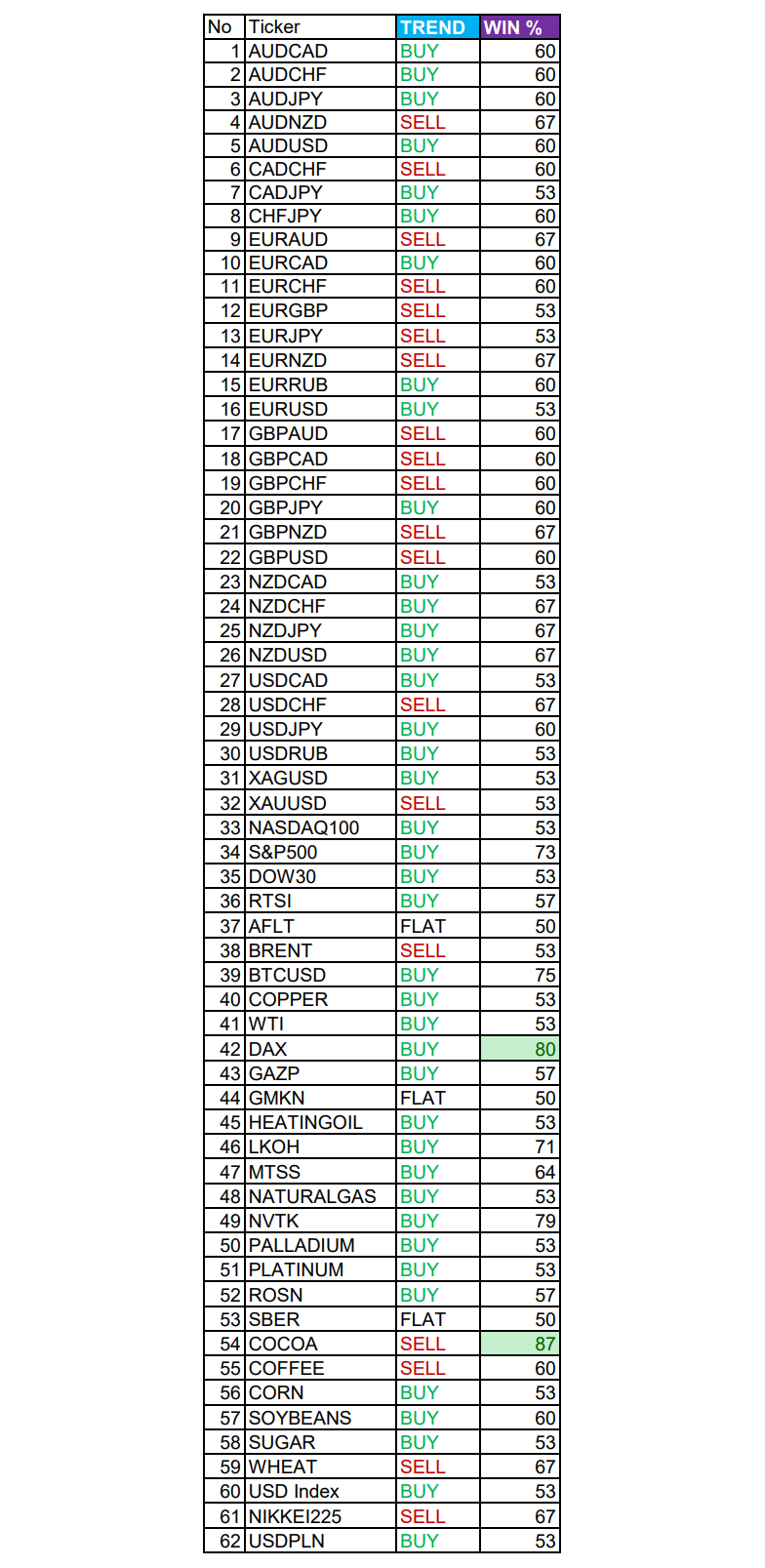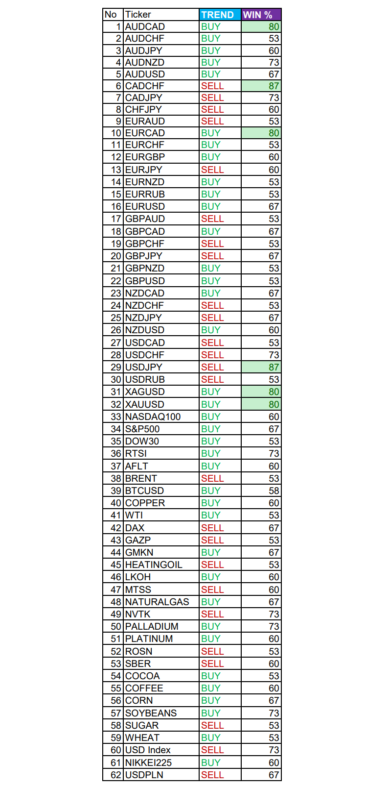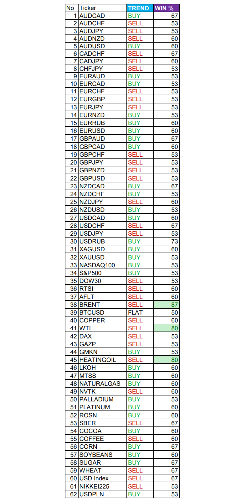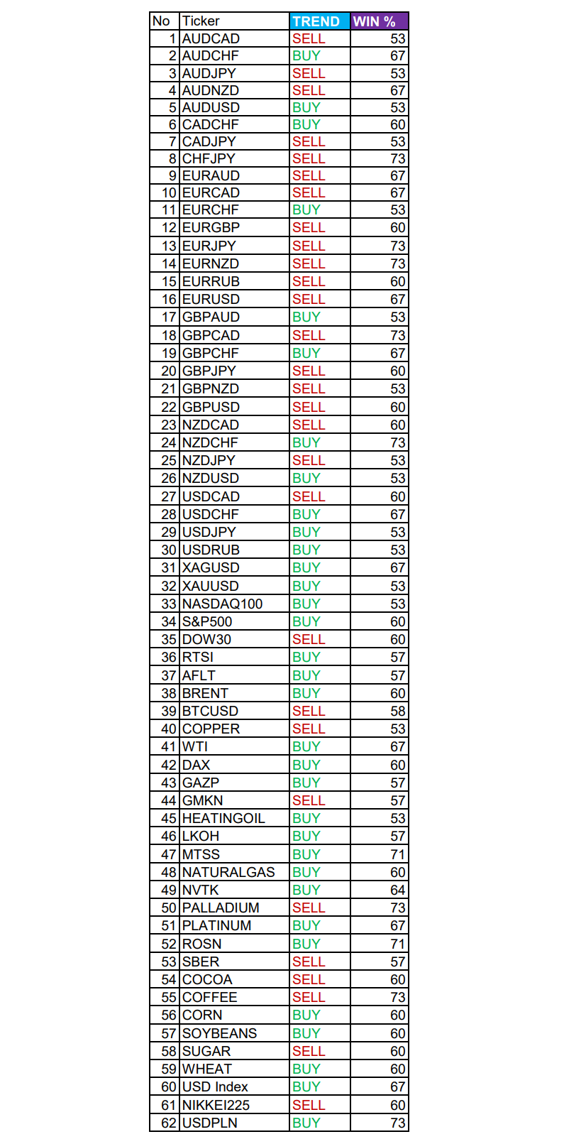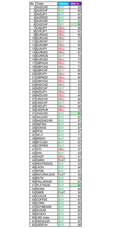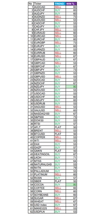 Сезонные тенденции и вероятности на вторник 13.01.2026 Здравствуйте Уважаемые трейдеры! С Вами снова Александр Борских. Подготовил для Вас свежую информацию. Очередные сезонные тенденции на вторник 13 января 2026 по основным мажорам финансовых рынков. Весь перечень анализируемых активов указан ниже в общем количестве 62 инструмента. Здесь Вы найдете активы рынка Форекс, популярные активы Московской биржи, не менее популярные активы Чикагской биржи СМЕ и мажор криптовалютного сегмента - Биткоин, за которым следуют все альткоины. Первый блок информации с зонами лимитных покупок и продаж. Данная информация включает в себя не только статистический показатель волатильности каждого актива, но и ближайшие опционные страйки с учетом премий за риск (Для верных расчетов рекомендуется просмотреть теоретическое видео в свободном доступе - Как использовать блок сезонности). А теперь сам блок информации №1: Второй блок информации с направленным вектором движения и вероятностями (внимательно обращаем внимание на цену открытия каждого актива. Обязательно для верных расчетов берем только цену открытия спотового актива). Как использовать вероятности в отношении цены открытия спотового актива - смотрим видео в открытом доступе (Как использовать блок сезонности). Данная информация с вероятностями поможет определить какова вероятность закрытия дня в отношении цены открытия этого же дня. А теперь сам блок информации №2: А теперь примеры построения блоков лимитных позиций и уточнение по сезонности с вероятностями отработки каждого актива по основным мажорам. По остальным активам, просмотрев теоретическое видео (Как использовать блок сезонности) - сможете построить лимитные блоки покупок и продаж самостоятельно. Ниже для примера продемонстрирую на сегодняшний день три основных мажора: Евро (EURUSD), Золото (XAUUSD), индекс НАСДАК (NASDAQ). EURUSD По Евро сегодня вероятность 60% к закрытию дня закрыть день выше цены открытия дня 1,1668 Зона покупок 1,1619-1,1468 с целью 1,1668. Покупки в приоритете пока фон доллара США слабый Зона продаж 1,1731-1,1922. Но новые продажи ожидаем от уровня 1,2018 и выше с целью 1,1922. В продажах сокращаем торговый объем раза в 4, т.к. тренд восходящий XAUUSD По Золоту сегодня вероятность 53% к закрытию дня закрыть день выше цены открытия дня 4599,84 Зона покупок 4589,89-4575,24. Но новые покупки ожидаем от уровня 4568,10 и ниже с целью 4575,24. В покупках сокращаем торговый объем раза в 4, т.к. баланс Зона продаж 4609,37-4633,89. Но новые продажи ожидаем от уровня 4646,15 и выше с целью 4633,89. В продажах сокращаем торговый объем раза в 4, т.к. баланс NASDAQ По индексу сегодня вероятность 53% к закрытию дня закрыть день выше цены открытия дня 25725,00 Зона покупок 25638,98-25282,25 с целью 25725,00. Покупки в приоритете пока фон доллара США слабый Зона продаж 25773,13-25845,50. Но новые продажи ожидаем от уровня 25882,06 и выше с целью 25845,50. В продажах сокращаем торговый объем раза в 4, т.к. тренд восходящий А теперь новостная лента ожиданий аналитических агентств и разбор отдельных показателей на сегодняшний день, чего ожидать на основных торговых сессиях. Также укажем фон доллара США, сильный на текущий момент или же слабый. От фона доллара США будет зависеть направленное движение самой пары. НОВОСТИ сегодня: Фон доллара США слабый 16:30 МСК - ожидания укрепления доллара США USD 16:30 - ожидания частичного ослабления CAD 18:00 - ожидания осл