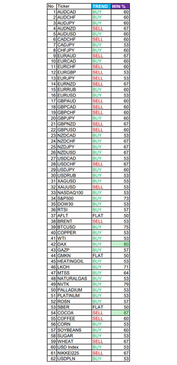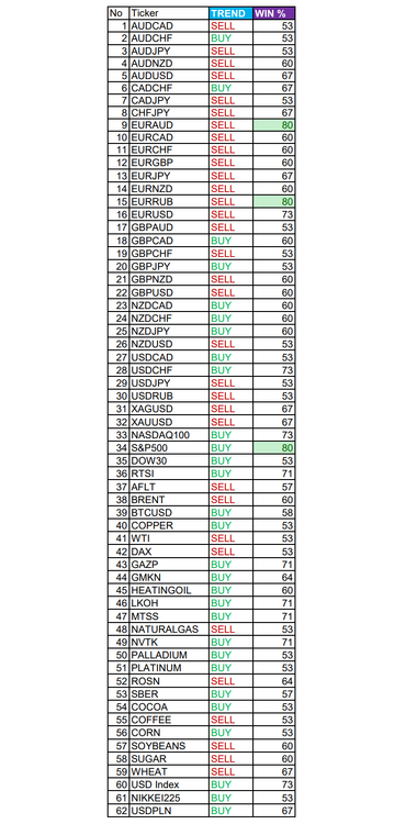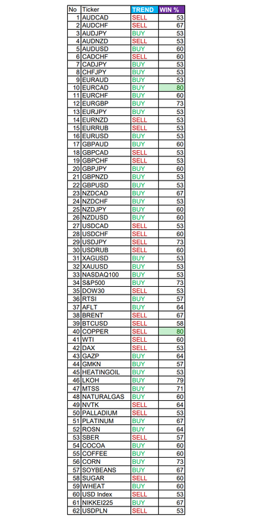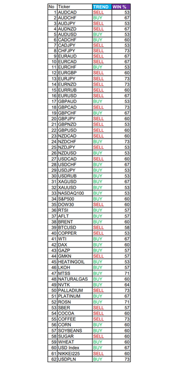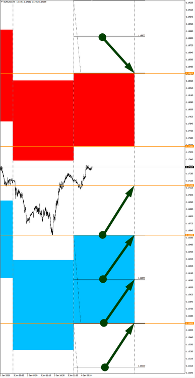 Сезонные тенденции и вероятности на вторник 06.01.2026 Здравствуйте Уважаемые трейдеры! С Вами снова Александр Борских. Подготовил для Вас свежую информацию. Очередные сезонные тенденции на вторник 06 января 2026 по основным мажорам финансовых рынков. Весь перечень анализируемых активов указан ниже в общем количестве 62 инструмента. Здесь Вы найдете активы рынка Форекс, популярные активы Московской биржи, не менее популярные активы Чикагской биржи СМЕ и мажор криптовалютного сегмента - Биткоин, за которым следуют все альткоины. Первый блок информации с зонами лимитных покупок и продаж. Данная информация включает в себя не только статистический показатель волатильности каждого актива, но и ближайшие опционные страйки с учетом премий за риск (Для верных расчетов рекомендуется просмотреть теоретическое видео в свободном доступе - Как использовать блок сезонности). А теперь сам блок информации №1: Второй блок информации с направленным вектором движения и вероятностями (внимательно обращаем внимание на цену открытия каждого актива. Обязательно для верных расчетов берем только цену открытия спотового актива). Как использовать вероятности в отношении цены открытия спотового актива - смотрим видео в открытом доступе (Как использовать блок сезонности). Данная информация с вероятностями поможет определить какова вероятность закрытия дня в отношении цены открытия этого же дня. А теперь сам блок информации №2: А теперь примеры построения блоков лимитных позиций и уточнение по сезонности с вероятностями отработки каждого актива по основным мажорам. По остальным активам, просмотрев теоретическое видео (Как использовать блок сезонности) - сможете построить лимитные блоки покупок и продаж самостоятельно. Ниже для примера продемонстрирую на сегодняшний день три основных мажора: Евро (EURUSD), Золото (XAUUSD), индекс НАСДАК (NASDAQ). EURUSD По Евро сегодня вероятность 53% к закрытию дня закрыть день выше цены открытия дня 1,1715 Зона покупок 1,1659-1,1560 с целью 1,1715. Покупки в приоритете пока фон доллара США слабый Зона продаж 1,1759-1,1841. Но новые продажи ожидаем от уровня 1,18822 и выше с целью 1,1841. В продажах сокращаем торговый объем раза в 4, т.к. тренд восходящий XAUUSD По Золоту сегодня вероятность 53% к закрытию дня закрыть день ниже цены открытия дня 4440,55 Зона продаж 4452,50-4477,65. Но новые продажи ожидаем от уровня 4490,40 и выше с целью 4477,65. В продажах сокращаем торговый объем раза в 4, т.к. баланс Зона покупок 4425,77-4391,36. Но новые покупки ожидаем от уровня 4374,24 и ниже с целью 4391,36. В покупках сокращаем торговый объем раза в 4, т.к. баланс NASDAQ По индексу сегодня вероятность 53% к закрытию дня закрыть день выше цены открытия дня 25373,00 Зона покупок 25308,30-25064,00 с целью 25373,00. Покупки в приоритете пока фон доллара США слабый Зона продаж 25450,14-25700,00. Но новые продажи ожидаем от уровня 25825,03 и выше с целью 25700,00. В продажах сокращаем торговый объем раза в 4, т.к. тренд восходящий А теперь новостная лента ожиданий аналитических агентств и разбор отдельных показателей на сегодняшний день, чего ожидать на основных торговых сессиях. Также укажем фон доллара США, сильный на текущий момент или же слабый. От фона доллара США будет зависеть направленное движение самой пары. НОВОСТИ сегодня: Фон доллара США слабый 10:45 МСК - ожидание частичного укрепления EUR 11:15 - ожидание частичного ослабления EUR 11:45 - ожидание час