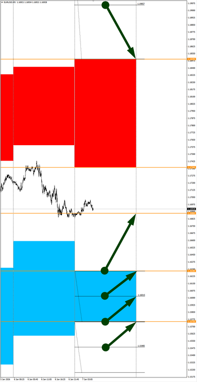 Сезонные тенденции и вероятности на среду 07.01.2026 Здравствуйте Уважаемые трейдеры! С Вами снова Александр Борских. Подготовил для Вас свежую информацию. Очередные сезонные тенденции на среду 07 января 2026 по основным мажорам финансовых рынков. Весь перечень анализируемых активов указан ниже в общем количестве 62 инструмента. Здесь Вы найдете активы рынка Форекс, популярные активы Московской биржи, не менее популярные активы Чикагской биржи СМЕ и мажор криптовалютного сегмента - Биткоин, за которым следуют все альткоины. Первый блок информации с зонами лимитных покупок и продаж. Данная информация включает в себя не только статистический показатель волатильности каждого актива, но и ближайшие опционные страйки с учетом премий за риск (Для верных расчетов рекомендуется просмотреть теоретическое видео в свободном доступе - Как использовать блок сезонности). А теперь сам блок информации №1: Второй блок информации с направленным вектором движения и вероятностями (внимательно обращаем внимание на цену открытия каждого актива. Обязательно для верных расчетов берем только цену открытия спотового актива). Как использовать вероятности в отношении цены открытия спотового актива - смотрим видео в открытом доступе (Как использовать блок сезонности). Данная информация с вероятностями поможет определить какова вероятность закрытия дня в отношении цены открытия этого же дня. А теперь сам блок информации №2: А теперь примеры построения блоков лимитных позиций и уточнение по сезонности с вероятностями отработки каждого актива по основным мажорам. По остальным активам, просмотрев теоретическое видео (Как использовать блок сезонности) - сможете построить лимитные блоки покупок и продаж самостоятельно. Ниже для примера продемонстрирую на сегодняшний день три основных мажора: Евро (EURUSD), Золото (XAUUSD), индекс НАСДАК (NASDAQ). EURUSD По Евро сегодня вероятность 67% к закрытию дня закрыть день ниже цены открытия дня 1,1688 Зона покупок 1,1628-1,1575 с целью 1,1688. Покупки в приоритете пока фон доллара США слабый Зона продаж 1,1736-1,1849. Но новые продажи ожидаем от уровня 1,19057 и выше с целью 1,1849. В продажах сокращаем торговый объем раза в 4, т.к. тренд восходящий XAUUSD По Золоту сегодня вероятность 60% к закрытию дня закрыть день ниже цены открытия дня 4493,39 Зона покупок 4482,94-4474,19. Но новые покупки ожидали от уровня 4469,90 и ниже с целью 4474,19 - на азии покупки отработали. В покупках сокращаем торговый объем раза в 4, т.к. баланс Зона продаж 4503,09-4530,49. Но новые продажи ожидаем от уровня 4544,24 и выше с целью 4530,49. В продажах сокращаем торговый объем раза в 4, т.к. баланс NASDAQ По индексу сегодня вероятность 67% к закрытию дня закрыть день выше цены открытия дня 25633,00 Зона покупок 25581,95-25341,25 с целью 25633,00. Покупки в приоритете пока фон доллара США слабый Зона продаж 25708,89-25960,00. Но новые продажи ожидаем от уровня 26086,35 и выше с целью 25960,00. В продажах сокращаем торговый объем раза в 4, т.к. тренд восходящий А теперь новостная лента ожиданий аналитических агентств и разбор отдельных показателей на сегодняшний день, чего ожидать на основных торговых сессиях. Также укажем фон доллара США, сильный на текущий момент или же слабый. От фона доллара США будет зависеть направленное движение самой пары. НОВОСТИ сегодня: Фон доллара США слабый 10:00 МСК - ожидания частичного укрепления EUR 11:55 - ожидания частичного ослабл