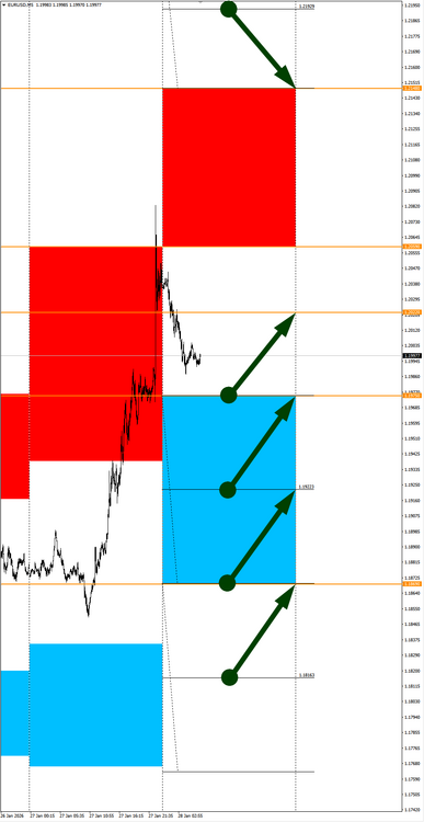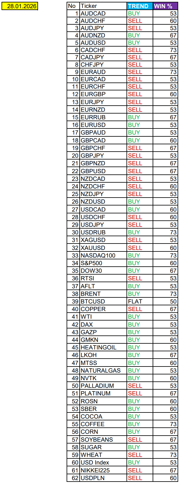 Сезонные тенденции и вероятности на среду 28.01.2026 Здравствуйте Уважаемые трейдеры! С Вами снова Александр Борских. Подготовил для Вас свежую информацию. Очередные сезонные тенденции на среду 28 января 2026 по основным мажорам финансовых рынков. Весь перечень анализируемых активов указан ниже в общем количестве 62 инструмента. Здесь Вы найдете активы рынка Форекс, популярные активы Московской биржи, не менее популярные активы Чикагской биржи СМЕ и мажор криптовалютного сегмента - Биткоин, за которым следуют все альткоины. Первый блок информации с зонами лимитных покупок и продаж. Данная информация включает в себя не только статистический показатель волатильности каждого актива, но и ближайшие опционные страйки с учетом премий за риск (Для верных расчетов рекомендуется просмотреть теоретическое видео в свободном доступе - Как использовать блок сезонности). А теперь сам блок информации №1: Второй блок информации с направленным вектором движения и вероятностями (внимательно обращаем внимание на цену открытия каждого актива. Обязательно для верных расчетов берем только цену открытия спотового актива). Как использовать вероятности в отношении цены открытия спотового актива - смотрим видео в открытом доступе (Как использовать блок сезонности). Данная информация с вероятностями поможет определить какова вероятность закрытия дня в отношении цены открытия этого же дня. А теперь сам блок информации №2: А теперь примеры построения блоков лимитных позиций и уточнение по сезонности с вероятностями отработки каждого актива по основным мажорам. По остальным активам, просмотрев теоретическое видео (Как использовать блок сезонности) - сможете построить лимитные блоки покупок и продаж самостоятельно. Ниже для примера продемонстрирую на сегодняшний день три основных мажора: Евро (EURUSD), Золото (XAUUSD), индекс НАСДАК (NASDAQ). EURUSD По Евро сегодня вероятность 53% к закрытию дня закрыть день выше цены открытия дня 1,2022 Зона покупок 1,1975-1,1869 с целью 1,2022. Покупки в приоритете пока фон доллара США слабый Зона продаж 1,2059-1,2148. Но новые продажи ожидаем от уровня 1,21929 и выше с целью 1,2148. В продажах сокращаем торговый объем раза в 4, т.к. тренд восходящий! XAUUSD По Золоту сегодня вероятность 60% к закрытию дня закрыть день ниже цены открытия дня 5171,67 Зона покупок 5162,67-5154,61. Но новые покупки ожидаем от уровня 5150,77 и ниже с целью 5154,61. В покупках сокращаем торговый объем раза в 4, т.к. баланс Зона продаж 5180,76-5205,93. Но новые продажи ожидали от уровня 5218,70 с целью 5205,93 - отработали на азии. В продажах сокращаем торговый объем раза в 4, т.к. баланс. С малыми депозитами рекомендую игнорировать продажи в период эскалации конфликта на Ближнем Востоке! NASDAQ По индексу сегодня вероятность 73% к закрытию дня закрыть день выше цены открытия дня 25974,00 Зона покупок 25891,25-25637,25 с целью 25974,00. Покупки в приоритете пока фон доллара США слабый Зона продаж 26086,80-26315,50. Но новые продажи ожидаем от уровня 26429,94 и выше с целью 26315,50. В продажах сокращаем торговый объем раза в 4, т.к. тренд восходящий! А теперь новостная лента ожиданий аналитических агентств и разбор отдельных показателей на сегодняшний день, чего ожидать на основных торговых сессиях. Также укажем фон доллара США, сильный на текущий момент или же слабый. От фона доллара США будет зависеть направленное движение самой пары. НОВОСТИ сегодня: Фон дол