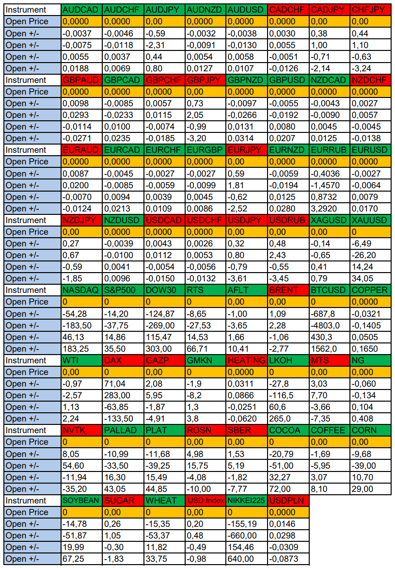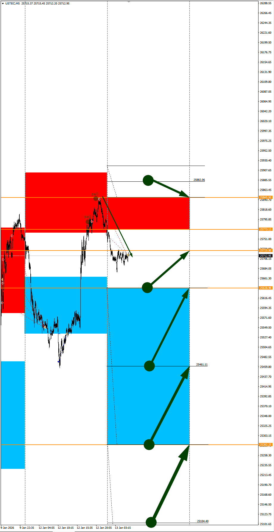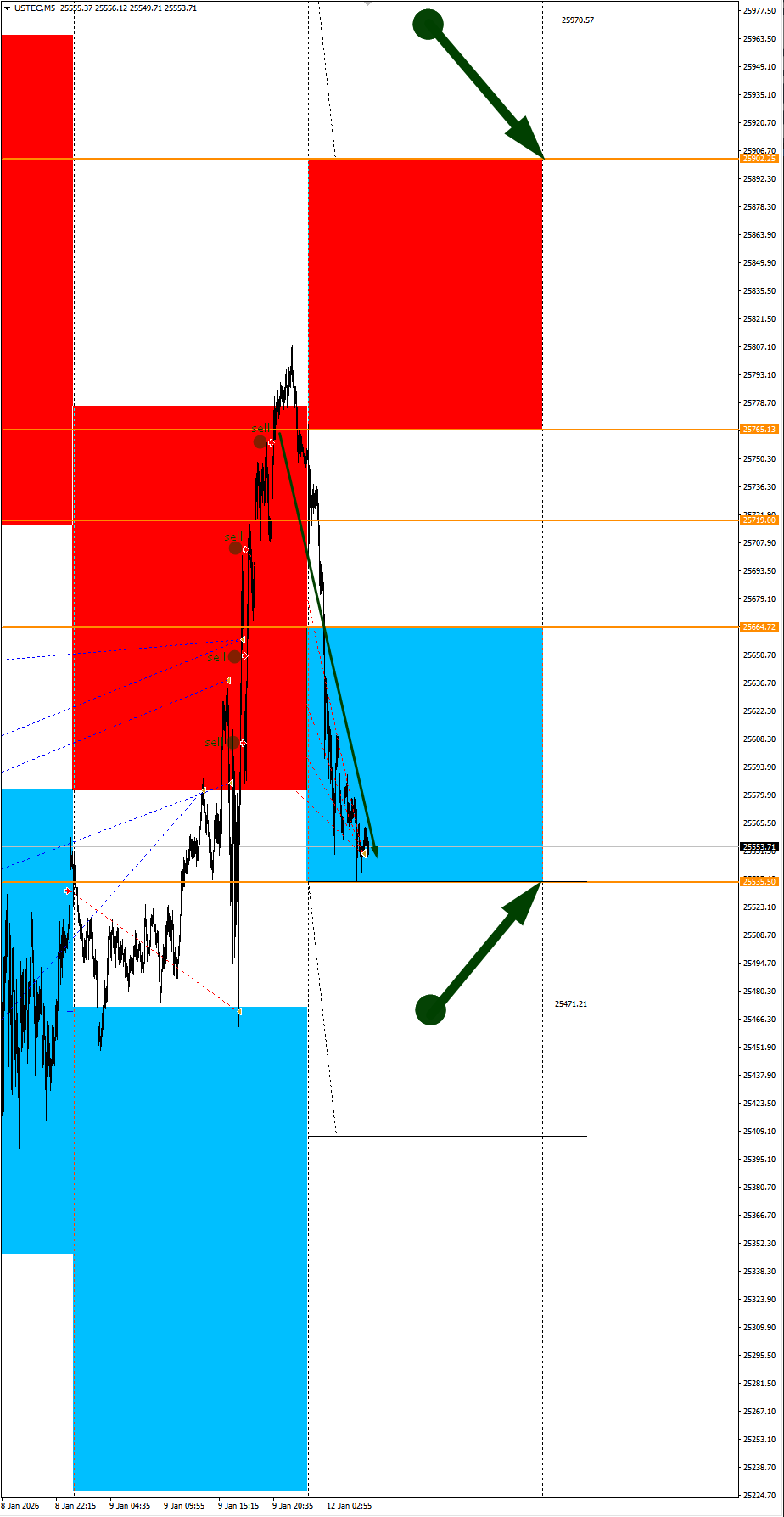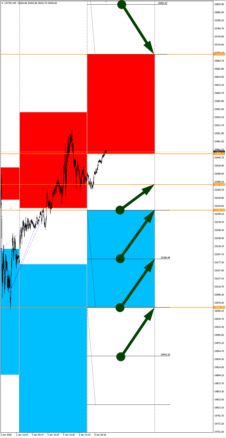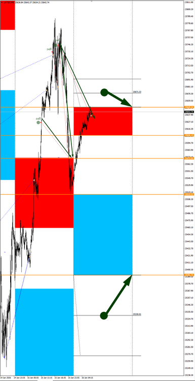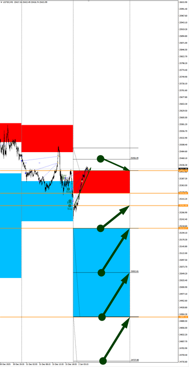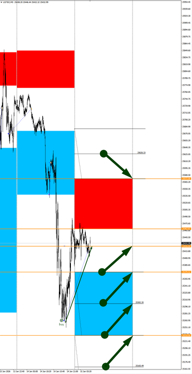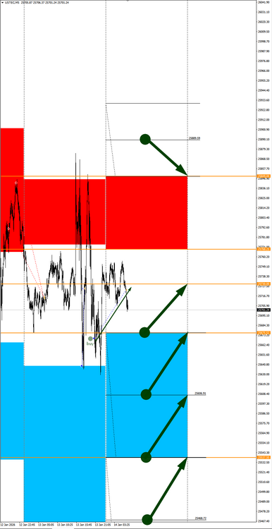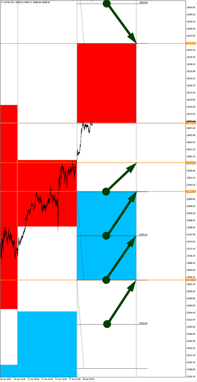 Сезонные тенденции и вероятности на понедельник 26.01.2026 Здравствуйте Уважаемые трейдеры! С Вами снова Александр Борских. Подготовил для Вас свежую информацию. Очередные сезонные тенденции на понедельник 26 января 2026 по основным мажорам финансовых рынков. Весь перечень анализируемых активов указан ниже в общем количестве 62 инструмента. Здесь Вы найдете активы рынка Форекс, популярные активы Московской биржи, не менее популярные активы Чикагской биржи СМЕ и мажор криптовалютного сегмента - Биткоин, за которым следуют все альткоины. Первый блок информации с зонами лимитных покупок и продаж. Данная информация включает в себя не только статистический показатель волатильности каждого актива, но и ближайшие опционные страйки с учетом премий за риск (Для верных расчетов рекомендуется просмотреть теоретическое видео в свободном доступе - Как использовать блок сезонности). А теперь сам блок информации №1: Второй блок информации с направленным вектором движения и вероятностями (внимательно обращаем внимание на цену открытия каждого актива. Обязательно для верных расчетов берем только цену открытия спотового актива). Как использовать вероятности в отношении цены открытия спотового актива - смотрим видео в открытом доступе (Как использовать блок сезонности). Данная информация с вероятностями поможет определить какова вероятность закрытия дня в отношении цены открытия этого же дня. А теперь сам блок информации №2: А теперь примеры построения блоков лимитных позиций и уточнение по сезонности с вероятностями отработки каждого актива по основным мажорам. По остальным активам, просмотрев теоретическое видео (Как использовать блок сезонности) - сможете построить лимитные блоки покупок и продаж самостоятельно. Ниже для примера продемонстрирую на сегодняшний день три основных мажора: Евро (EURUSD), Золото (XAUUSD), индекс НАСДАК (NASDAQ). EURUSD По Евро сегодня вероятность 60% к закрытию дня закрыть день выше цены открытия дня 1,1860 Зона покупок 1,1820-1,1772 с целью 1,1860. Покупки в приоритете пока фон доллара США слабый Зона продаж 1,1917-1,1976. Но новые продажи ожидаем от уровня 1,20057 и выше с целью 1,1976. В продажах сокращаем торговый объем раза в 4, т.к. тренд восходящий XAUUSD По Золоту сегодня вероятность 53% к закрытию дня закрыть день выше цены открытия дня 5039,73 Зона покупок 5029,42-5006,64. Но новые покупки ожидаем от уровня 4995,34 и ниже с целью 5006,64. В покупках сокращаем торговый объем раза в 4, т.к. баланс Зона продаж 5050,76-5071,71. Но новые продажи ожидали от уровня 5082,31 и выше с целью 5071,71 - на азии отработали. В продажах сокращаем торговый объем раза в 4, т.к. баланс NASDAQ По индексу сегодня вероятность 60% к закрытию дня закрыть день выше цены открытия дня 25445,00 Зона покупок 25394,14-25270,50. Часть покупок отработали с открытия рынка от уровня 25270,50 с целью 25332,51; от уровня 25332,51 с целью 25394,14; от уровня 25394,14 с целью 25445,00. Новые покупки ожидаем от уровня 25208,96 и ниже с целью 25270,50. Покупки в приоритете пока фон доллара США слабый Зона продаж 25553,15-26139,25. Но новые продажи ожидаем от уровня 26432,79 и выше с целью 26139,25. В продажах сокращаем торговый объем раза в 4, т.к. тренд восходящий А теперь новостная лента ожиданий аналитических агентств и разбор отдельных показателей на сегодняшний день, чего ожидать на основных торговых сессиях. Также укажем фон доллара США, сильный на текущий момент или же слабый. От фона 
