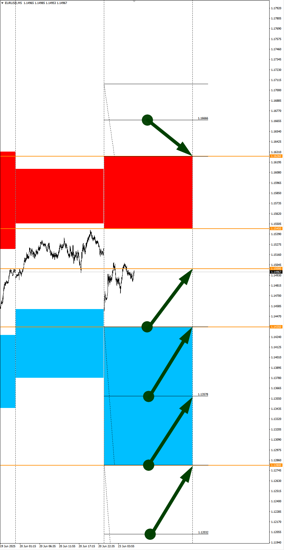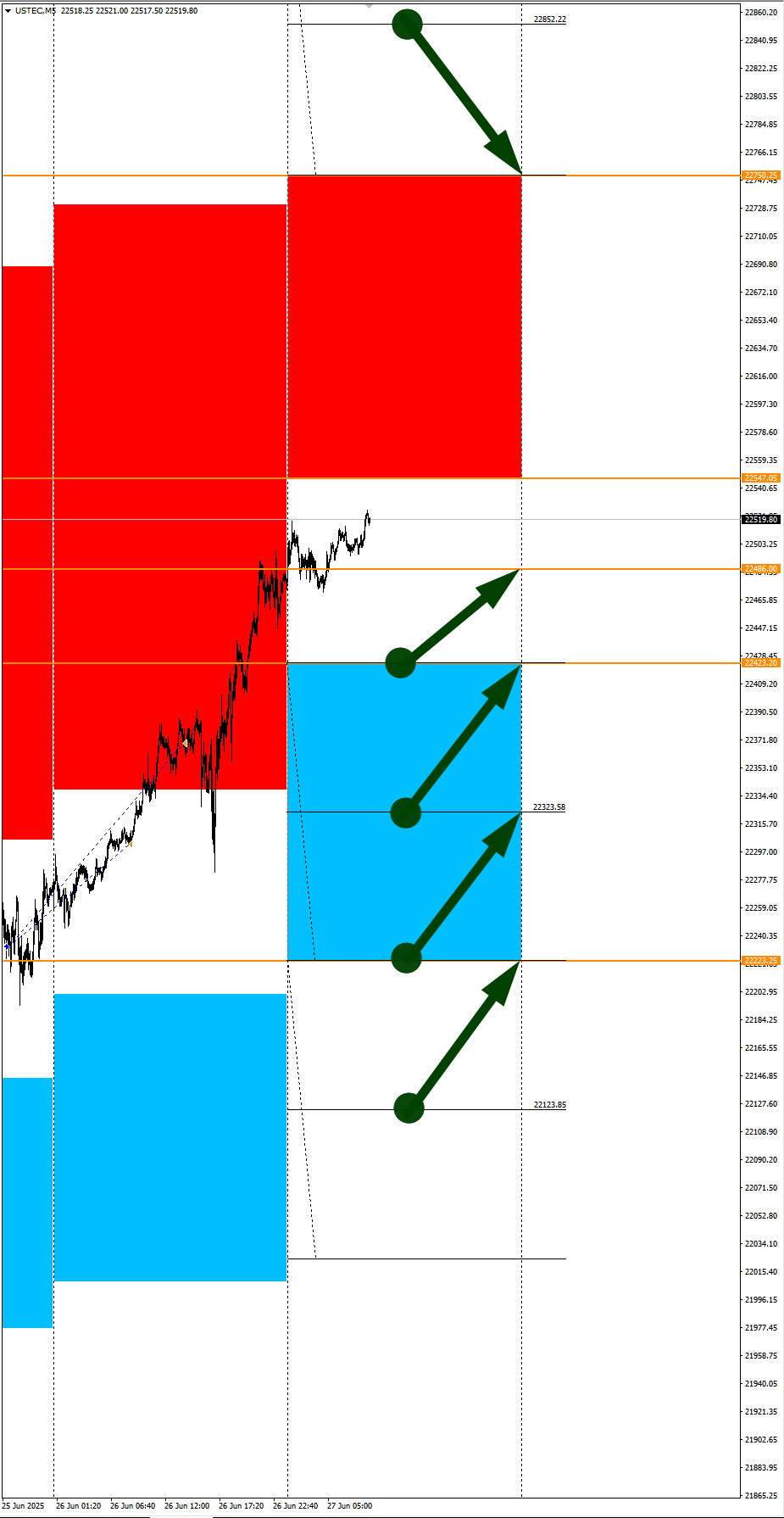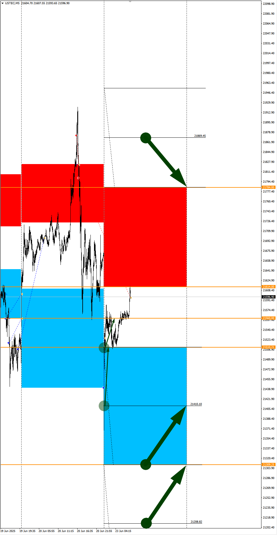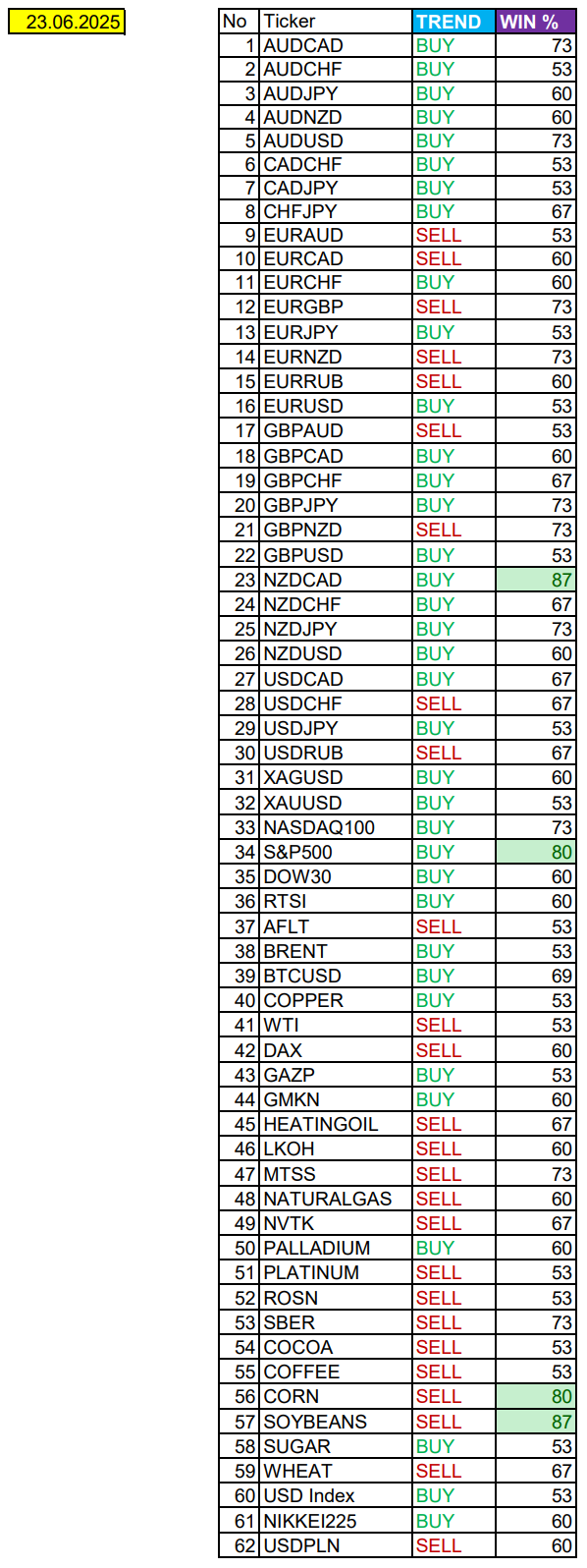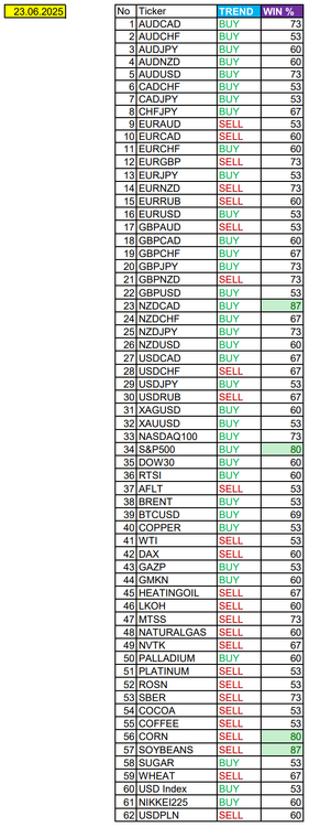 NZDCAD в фокусе дня. Сезонные тенденции и вероятности на Понедельник 23.06.2025 Здравствуйте Уважаемые трейдеры! С Вами снова Александр Борских. Подготовил для Вас свежую информацию. Очередные сезонные тенденции на Понедельник 23 Июня 2025 по основным мажорам финансовых рынков. Весь перечень анализируемых активов указан ниже в общем количестве 62 инструмента. Здесь Вы найдете активы рынка Форекс, популярные активы Московской биржи, не менее популярные активы Чикагской биржи СМЕ и мажор криптовалютного сегмента - Биткоин, за которым следуют все альткоины. Первый блок информации с зонами лимитных покупок и продаж. Данная информация включает в себя не только статистический показатель волатильности каждого актива, но и ближайшие опционные страйки с учетом премий за риск (Для верных расчетов рекомендуется просмотреть теоретическое видео в свободном доступе - Как использовать блок сезонности). А теперь сам блок информации №1: Второй блок информации с направленным вектором движения и вероятностями (внимательно обращаем внимание на цену открытия каждого актива. Обязательно для верных расчетов берем только цену открытия спотового актива). Как использовать вероятности в отношении цены открытия спотового актива - смотрим видео в открытом доступе (Как использовать блок сезонности). Данная информация с вероятностями поможет определить какова вероятность закрытия дня в отношении цены открытия этого же дня. А теперь сам блок информации №2: А теперь примеры построения блоков лимитных позиций и уточнение по сезонности с вероятностями отработки каждого актива по основным мажорам. По остальным активам, просмотрев теоретическое видео (Как использовать блок сезонности) - сможете построить лимитные блоки покупок и продаж самостоятельно. Ниже для примера продемонстрирую на сегодняшний день три основных мажора: Евро (EURUSD), Золото (XAUUSD), индекс НАСДАК (NASDAQ). EURUSD По Евро сегодня вероятность 53% к закрытию дня закрыть день выше цены открытия дня 1,1500. Зона покупок 1,1435-1,1280 с целью 1,1500. Покупки в приоритете пока фон доллара США слабый. Зона продаж 1,1545-1,1626. Но новые продажи ожидаем от уровня 1,16666 и выше с целью 1,1626. В продажах сокращаем торговый объем раза в 4, т.к. тренд восходящий. XAUUSD По Золоту сегодня вероятность 53% к закрытию дня закрыть день выше цены открытия дня 3372,90. Зона продаж 3387,11-3442,97. Но новые продажи ожидаем от уровня 3471,09 и выше с целью 3442,97. В продажах сокращаем торговый объем раза в 4, т.к. баланс. Зона покупок 3361,67-3329,36. Но новые покупки ожидаем от уровня 3313,18 и ниже с целью 3329,36. В покупках сокращаем торговый объем раза в 4, т.к. баланс. NASDAQ По индексу сегодня вероятность 73% к закрытию дня закрыть день выше цены открытия дня 21560,00. Зона покупок 21510,21-21309,25. Часть покупок отработали с открытия рынка от уровня 21410,10 с целью 21510,21; от уровня 21510,21 с целью 21560,00. Новые покупки ожидаем от уровня 21309,25 и ниже с целями на графике. Покупки в приоритете пока фон доллара США слабый. Зона продаж 21614,00-21784,00. Но новые продажи ожидаем от уровня 21869,45 и выше с целью 21784,00. В продажах сокращаем торговый объем раза в 4, т.к. общий тренд все еще восходящий. А теперь новостная лента ожиданий аналитических агентств и разбор отдельных показателей на сегодняшний день, чего ожидать на основных торговых сессиях. Также укажем фон доллара США, сильный на текущий момент или же слабый. От фона доллара 