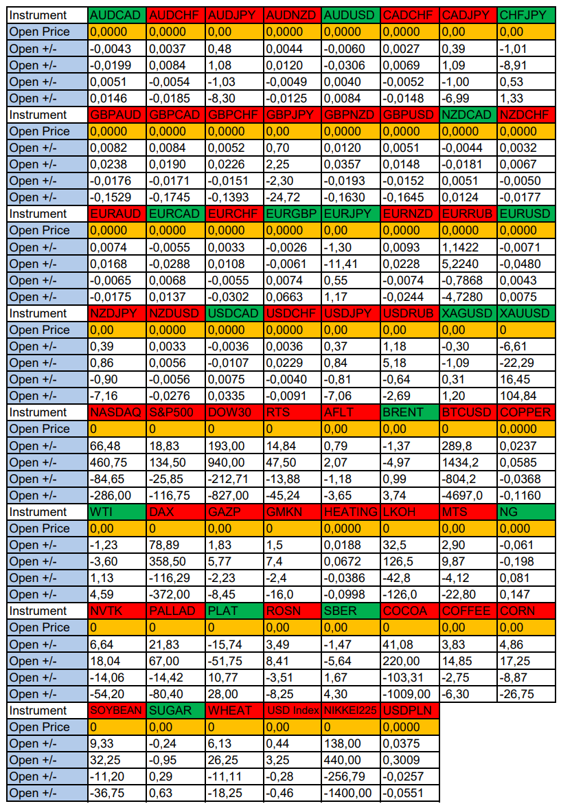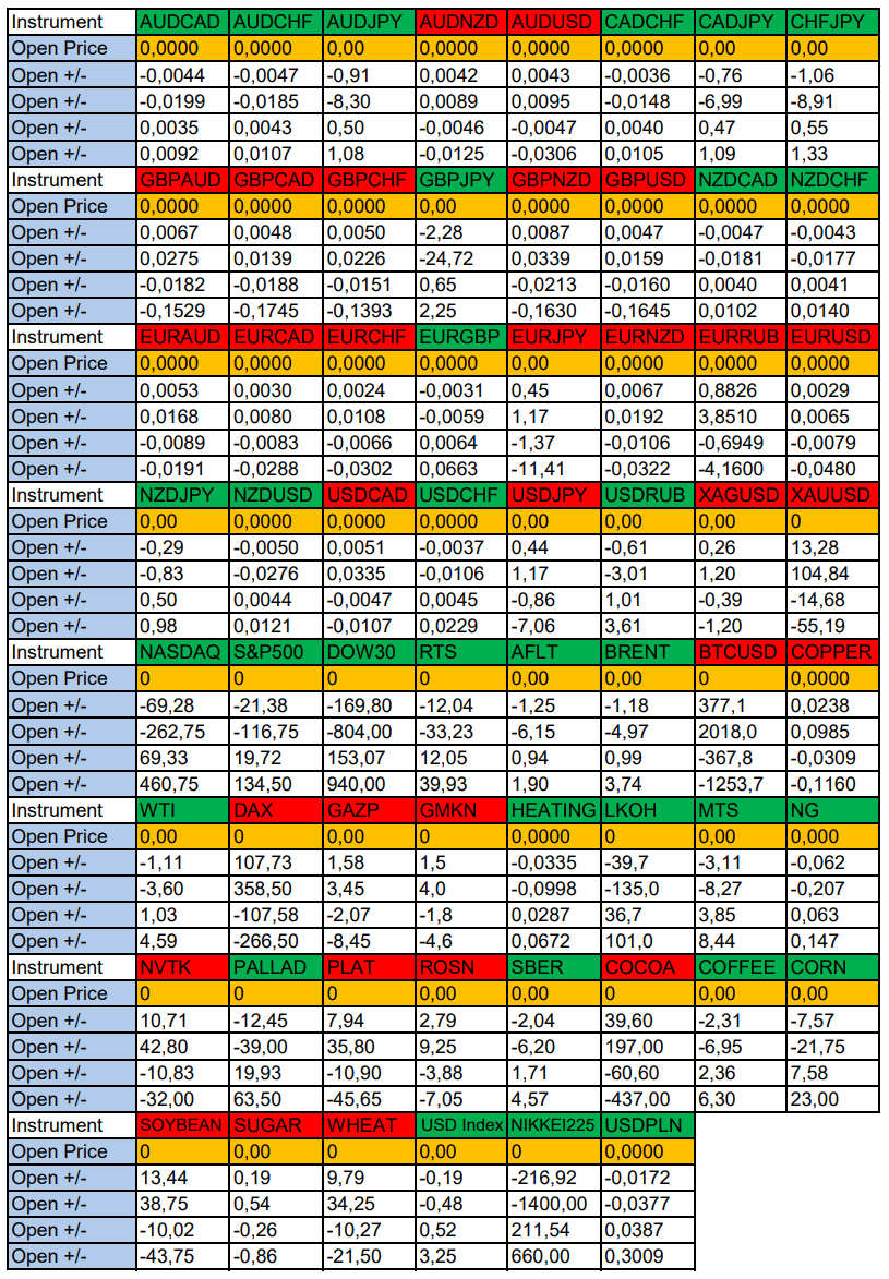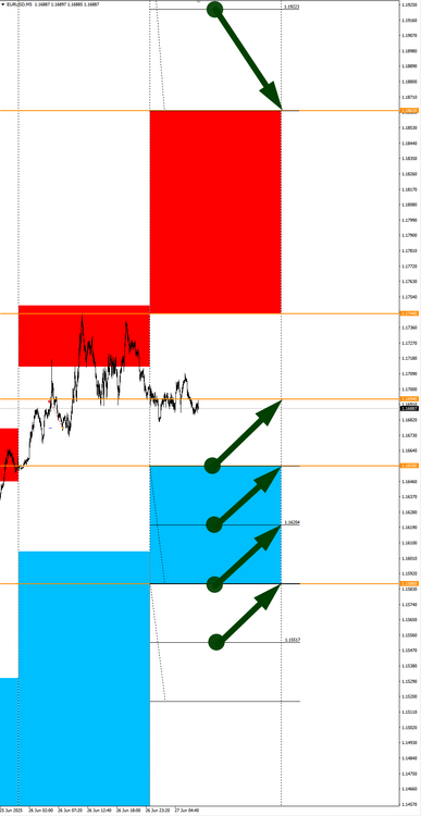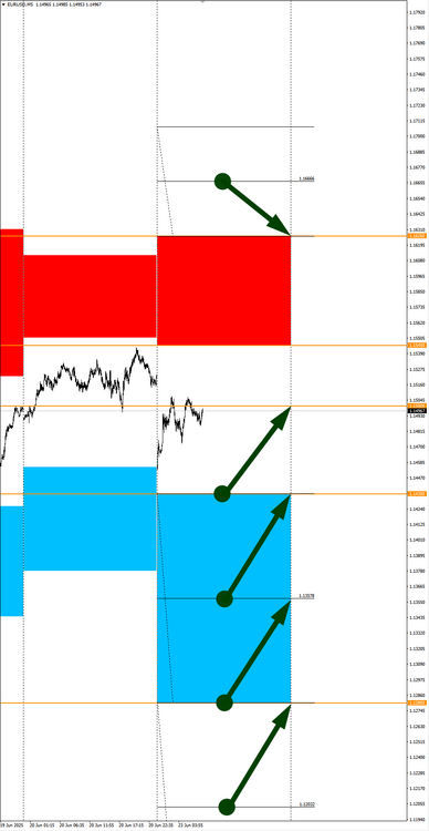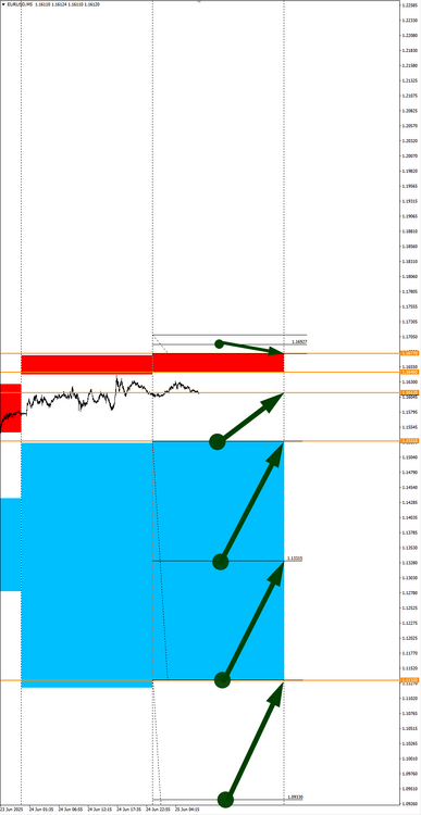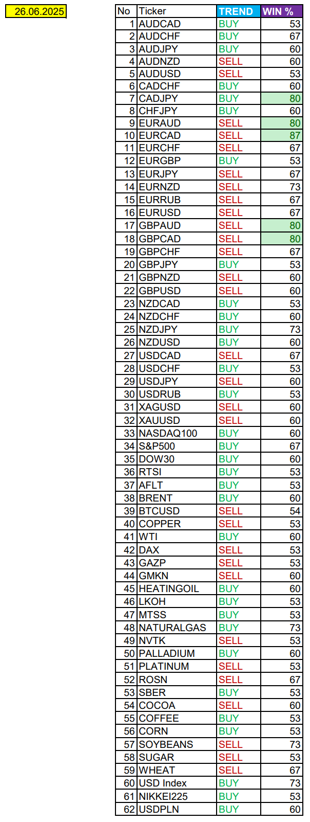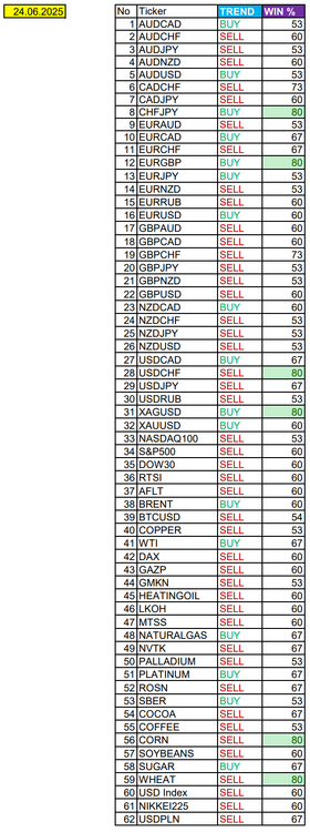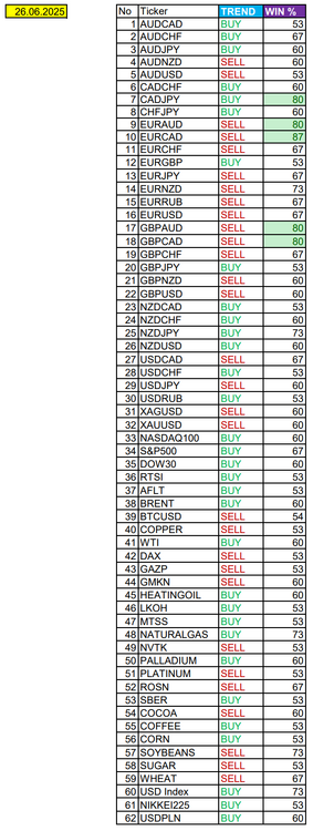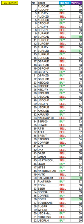 Валюты в фокусе дня. Сезонные тенденции и вероятности на Четверг 26.06.2025 Здравствуйте Уважаемые трейдеры! С Вами снова Александр Борских. Подготовил для Вас свежую информацию. Очередные сезонные тенденции на Четверг 26 Июня 2025 по основным мажорам финансовых рынков. Весь перечень анализируемых активов указан ниже в общем количестве 62 инструмента. Здесь Вы найдете активы рынка Форекс, популярные активы Московской биржи, не менее популярные активы Чикагской биржи СМЕ и мажор криптовалютного сегмента - Биткоин, за которым следуют все альткоины. Первый блок информации с зонами лимитных покупок и продаж. Данная информация включает в себя не только статистический показатель волатильности каждого актива, но и ближайшие опционные страйки с учетом премий за риск (Для верных расчетов рекомендуется просмотреть теоретическое видео в свободном доступе - Как использовать блок сезонности). А теперь сам блок информации №1: Второй блок информации с направленным вектором движения и вероятностями (внимательно обращаем внимание на цену открытия каждого актива. Обязательно для верных расчетов берем только цену открытия спотового актива). Как использовать вероятности в отношении цены открытия спотового актива - смотрим видео в открытом доступе (Как использовать блок сезонности). Данная информация с вероятностями поможет определить какова вероятность закрытия дня в отношении цены открытия этого же дня. А теперь сам блок информации №2: А теперь примеры построения блоков лимитных позиций и уточнение по сезонности с вероятностями отработки каждого актива по основным мажорам. По остальным активам, просмотрев теоретическое видео (Как использовать блок сезонности) - сможете построить лимитные блоки покупок и продаж самостоятельно. Ниже для примера продемонстрирую на сегодняшний день три основных мажора: Евро (EURUSD), Золото (XAUUSD), индекс НАСДАК (NASDAQ). EURUSD По Евро сегодня вероятность 67% к закрытию дня закрыть день ниже цены открытия дня 1,1684 Зона покупок 1,1605-1,1204 с целью 1,1684. Покупки в приоритете пока фон доллара США слабый Зона продаж 1,1713-1,1749. Но новые продажи ожидаем от уровня 1,17671 и выше с целью 1,1749. В продажах сокращаем торговый объем раза в 4, т.к. общий тренд восходящий. XAUUSD По Золоту сегодня вероятность 60% к закрытию дня закрыть день ниже цены открытия дня 3338,91. Зона покупок 3324,23-3283,72. Но новые покупки ожидаем от уровня 3263,44 и ниже с целью 3283,72. В покупках сокращаем торговый объем раза в 4, т.к. баланс. Зона продаж 3352,19-3443,75. Но новые продажи ожидаем от уровня 3489,85 и выше с целью 3443,75. В продажах сокращаем торговый объем раза в 4, т.к. баланс. NASDAQ По индексу сегодня вероятность 60% к закрытию дня закрыть день выше цены открытия дня 22270,00. Зона покупок 22200,72-22007,25 с целью 22270,00. Покупки в приоритете пока фон доллара США слабый. Зона продаж 22339,33-22730,75. Но новые продажи ожидаем от уровня 22926,39 и выше с целью 22730,75. В продажах сокращаем торговый объем раза в 4, т.к. общий тренд восходящий. А теперь новостная лента ожиданий аналитических агентств и разбор отдельных показателей на сегодняшний день, чего ожидать на основных торговых сессиях. Также укажем фон доллара США, сильный на текущий момент или же слабый. От фона доллара США будет зависеть направленное движение самой пары. НОВОСТИ сегодня: Фон доллара США слабый 15:30 МСК - ожидания укрепления доллара США USD 17:00 - ожидания частичн