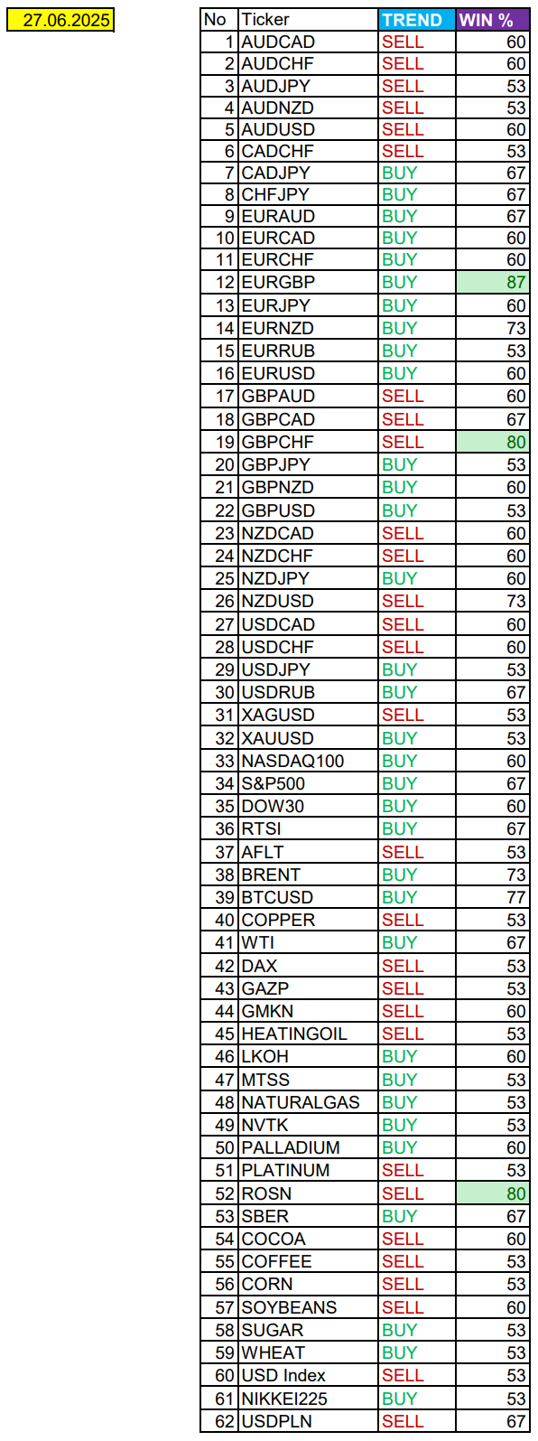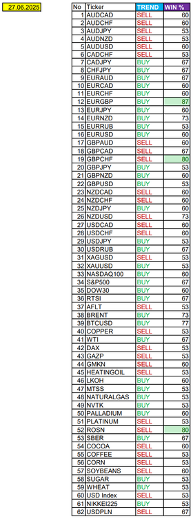 Сегодня фокус на Америку. Сезонные тенденции и вероятности на Пятницу 27.06.2025 Здравствуйте Уважаемые трейдеры! С Вами снова Александр Борских. Подготовил для Вас свежую информацию. Очередные сезонные тенденции на Пятницу 27 Июня 2025 по основным мажорам финансовых рынков. Весь перечень анализируемых активов указан ниже в общем количестве 62 инструмента. Здесь Вы найдете активы рынка Форекс, популярные активы Московской биржи, не менее популярные активы Чикагской биржи СМЕ и мажор криптовалютного сегмента - Биткоин, за которым следуют все альткоины. Первый блок информации с зонами лимитных покупок и продаж. Данная информация включает в себя не только статистический показатель волатильности каждого актива, но и ближайшие опционные страйки с учетом премий за риск (Для верных расчетов рекомендуется просмотреть теоретическое видео в свободном доступе - Как использовать блок сезонности). А теперь сам блок информации №1: Второй блок информации с направленным вектором движения и вероятностями (внимательно обращаем внимание на цену открытия каждого актива. Обязательно для верных расчетов берем только цену открытия спотового актива). Как использовать вероятности в отношении цены открытия спотового актива - смотрим видео в открытом доступе (Как использовать блок сезонности). Данная информация с вероятностями поможет определить какова вероятность закрытия дня в отношении цены открытия этого же дня. А теперь сам блок информации №2: А теперь примеры построения блоков лимитных позиций и уточнение по сезонности с вероятностями отработки каждого актива по основным мажорам. По остальным активам, просмотрев теоретическое видео (Как использовать блок сезонности) - сможете построить лимитные блоки покупок и продаж самостоятельно. Ниже для примера продемонстрирую на сегодняшний день три основных мажора: Евро (EURUSD), Золото (XAUUSD), индекс НАСДАК (NASDAQ). EURUSD По Евро сегодня вероятность 60% к закрытию дня закрыть день выше цены открытия дня 1,1694. Зона покупок 1,1655-1,1586 с целью 1,1694. Покупки в приоритете пока фон доллара США слабый. Зона продаж 1,1744-1,1863. Но новые продажи ожидаем от уровня 1,19223 и выше с целью 1,1863. В продажах сокращаем торговый объем раза в 4, т.к. тренд восходящий. XAUUSD По Золоту сегодня вероятность 53% к закрытию дня закрыть день выше цены открытия дня 3319,11. Зона покупок 3310,09-3290,57. Но новые покупки ожидаем от уровня 3280,81 и ниже с целью 3290,57. В покупках сокращаем торговый объем раза в 4, т.к. баланс. Зона продаж 3329,19-3350,31. Но новые продажи ожидаем от уровня 3360,84 и выше с целью 3350,31. В продажах сокращаем торговый объем раза в 4, т.к. баланс. NASDAQ По индексу сегодня вероятность 60% к закрытию дня закрыть день выше цены открытия дня 22486,00. Зона покупок 22423,20-22223,25 с целью 22486,00. Покупки в приоритете пока фон доллара США слабый. Зона продаж 22547,05-22750,25. Но новые продажи ожидаем от уровня 22852,22 и выше с целью 22750,25. В продажах сокращаем торговый объем раза в 4, т.к. общий тренд восходящий. А теперь новостная лента ожиданий аналитических агентств и разбор отдельных показателей на сегодняшний день, чего ожидать на основных торговых сессиях. Также укажем фон доллара США, сильный на текущий момент или же слабый. От фона доллара США будет зависеть направленное движение самой пары. НОВОСТИ сегодня: Фон доллара США слабый 09:45 МСК - ожидания частичного укрепления EUR 15:30 - ожидания укрепле