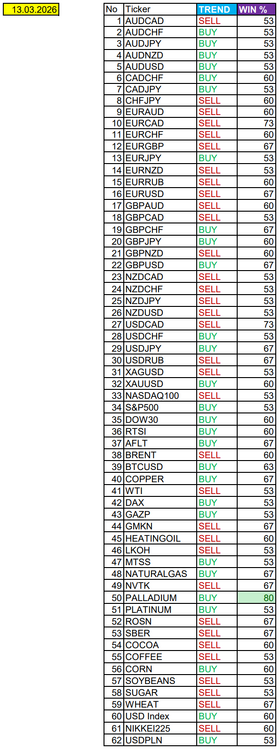 Опубликовано 3 июня, 20241 г. Автор Сезонные тенденции и вероятности на Понедельник 03 Июня 2024 Здравствуйте Уважаемые трейдеры! Александр Борских подготовил для Вас свежую информацию. Очередные сезонные тенденции на Понедельник 03 Июня 2024 по основным мажорам финансовых рынков. Весь перечень анализируемых активов указан ниже в общем количестве 60 инструментов. Здесь Вы найдете активы рынка Форекс, популярные активы Московской биржи, не менее популярные активы Чикагской биржи СМЕ и мажор криптовалютного сегмента - Биткоин, за которым следуют все альткоины. Первый блок информации с зонами лимитных покупок и продаж. Данная информация включает в себя не только статистический показатель волатильности каждого актива, но и ближайшие опционные страйки с учетом премий за риск (Для верных расчетов рекомендуется просмотреть теоретическое видео в свободном доступе - Как использовать блок сезонности). А теперь сам блок информации №1: Второй блок информации с направленным вектором движения и вероятностями (внимательно обращаем внимание на цену открытия каждого актива. Обязательно для верных расчетов берем только цену открытия спотового актива). Как использовать вероятности в отношении цены открытия спотового актива - смотрим видео в открытом доступе (Как использовать блок сезонности). Данная информация с вероятностями поможет определить какова вероятность закрытия дня в отношении цены открытия этого же дня. А теперь сам блок информации №2: А теперь примеры построения блоков лимитных позиций и уточнение по сезонности с вероятностями отработки каждого актива по основным мажорам. По остальным активам, просмотрев теоретическое видео (Как использовать блок сезонности) - сможете построить лимитные блоки покупок и продаж самостоятельно. Ниже для примера продемонстрирую на сегодняшний день три основных мажора: Евро (EURUSD), Золото (XAUUSD), индекс НАСДАК (NASDAQ). EUR/USD По Евро сегодня вероятность 60% к закрытию дня закрыть день выше цены открытия дня 1,0852. Зона покупок 1,0797-1,0650 с целью 1,0852. Покупки в приоритете пока фон доллара США слабый. Зона продаж 1,0933-1,1077 с целью 1,1077. Продажи рискованны на фоне слабого доллара США. В таком случае искать агрессивный вход на продажу лучше выше верхней границы красного блока. В продажах сокращаем торговый объем раза в 4. XAU/USD По Золоту сегодня вероятность 53% к закрытию дня закрыть день ниже открытия дня 2325,93. Зона покупок 2309,90-2282,95 с целью 2325,93. Покупки в приоритете пока фон доллара США слабый. Зона продаж 2340,07-2395,50 с целью 2395,50. Продажи рискованны на фоне слабого доллара США. В таком случае искать агрессивный вход на продажу лучше выше верхней границы красного блока. В продажах сокращаем торговый объем раза в 4. NASDAQ По индексу сегодня вероятность 53% к закрытию дня закрыть день выше цены открытия дня 18538,36. Зона покупок 18467,33-18145,36 с целью 18538,36. Покупки в приоритете пока фон доллара США слабый. Зона продаж 18576,71-18672,11 с целью 18672,11. Продажи рискованны на фоне слабого доллара США. В таком случае искать агрессивный вход на продажу лучше выше верхней границы красного блока. В продажах сокращаем торговый объем раза в 4. Сделки крупных игроков. Глобальный вектор движения и Недельный. Основные правила использования: При среднесрочной и внутридневной торговле используем вектор Недельных векторов движения (WEEKLY). Если Недельный (WEEKLY) вектор BUY -