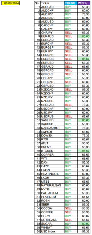 Опубликовано 3 июня, 20241 г. Автор Сезонные тенденции и вероятности на Понедельник 03 Июня 2024 Здравствуйте Уважаемые трейдеры! Александр Борских подготовил для Вас свежую информацию. Очередные сезонные тенденции на Понедельник 03 Июня 2024 по основным мажорам финансовых рынков. Весь перечень анализируемых активов указан ниже в общем количестве 60 инструментов. Здесь Вы найдете активы рынка Форекс, популярные активы Московской биржи, не менее популярные активы Чикагской биржи СМЕ и мажор криптовалютного сегмента - Биткоин, за которым следуют все альткоины. Первый блок информации с зонами лимитных покупок и продаж. Данная информация включает в себя не только статистический показатель волатильности каждого актива, но и ближайшие опционные страйки с учетом премий за риск (Для верных расчетов рекомендуется просмотреть теоретическое видео в свободном доступе - Как использовать блок сезонности). А теперь сам блок информации №1: Второй блок информации с направленным вектором движения и вероятностями (внимательно обращаем внимание на цену открытия каждого актива. Обязательно для верных расчетов берем только цену открытия спотового актива). Как использовать вероятности в отношении цены открытия спотового актива - смотрим видео в открытом доступе (Как использовать блок сезонности). Данная информация с вероятностями поможет определить какова вероятность закрытия дня в отношении цены открытия этого же дня. А теперь сам блок информации №2: А теперь примеры построения блоков лимитных позиций и уточнение по сезонности с вероятностями отработки каждого актива по основным мажорам. По остальным активам, просмотрев теоретическое видео (Как использовать блок сезонности) - сможете построить лимитные блоки покупок и продаж самостоятельно. Ниже для примера продемонстрирую на сегодняшний день три основных мажора: Евро (EURUSD), Золото (XAUUSD), индекс НАСДАК (NASDAQ). EUR/USD По Евро сегодня вероятность 60% к закрытию дня закрыть день выше цены открытия дня 1,0852. Зона покупок 1,0797-1,0650 с целью 1,0852. Покупки в приоритете пока фон доллара США слабый. Зона продаж 1,0933-1,1077 с целью 1,1077. Продажи рискованны на фоне слабого доллара США. В таком случае искать агрессивный вход на продажу лучше выше верхней границы красного блока. В продажах сокращаем торговый объем раза в 4. XAU/USD По Золоту сегодня вероятность 53% к закрытию дня закрыть день ниже открытия дня 2325,93. Зона покупок 2309,90-2282,95 с целью 2325,93. Покупки в приоритете пока фон доллара США слабый. Зона продаж 2340,07-2395,50 с целью 2395,50. Продажи рискованны на фоне слабого доллара США. В таком случае искать агрессивный вход на продажу лучше выше верхней границы красного блока. В продажах сокращаем торговый объем раза в 4. NASDAQ По индексу сегодня вероятность 53% к закрытию дня закрыть день выше цены открытия дня 18538,36. Зона покупок 18467,33-18145,36 с целью 18538,36. Покупки в приоритете пока фон доллара США слабый. Зона продаж 18576,71-18672,11 с целью 18672,11. Продажи рискованны на фоне слабого доллара США. В таком случае искать агрессивный вход на продажу лучше выше верхней границы красного блока. В продажах сокращаем торговый объем раза в 4. Сделки крупных игроков. Глобальный вектор движения и Недельный. Основные правила использования: При среднесрочной и внутридневной торговле используем вектор Недельных векторов движения (WEEKLY). Если Недельный (WEEKLY) вектор BUY -