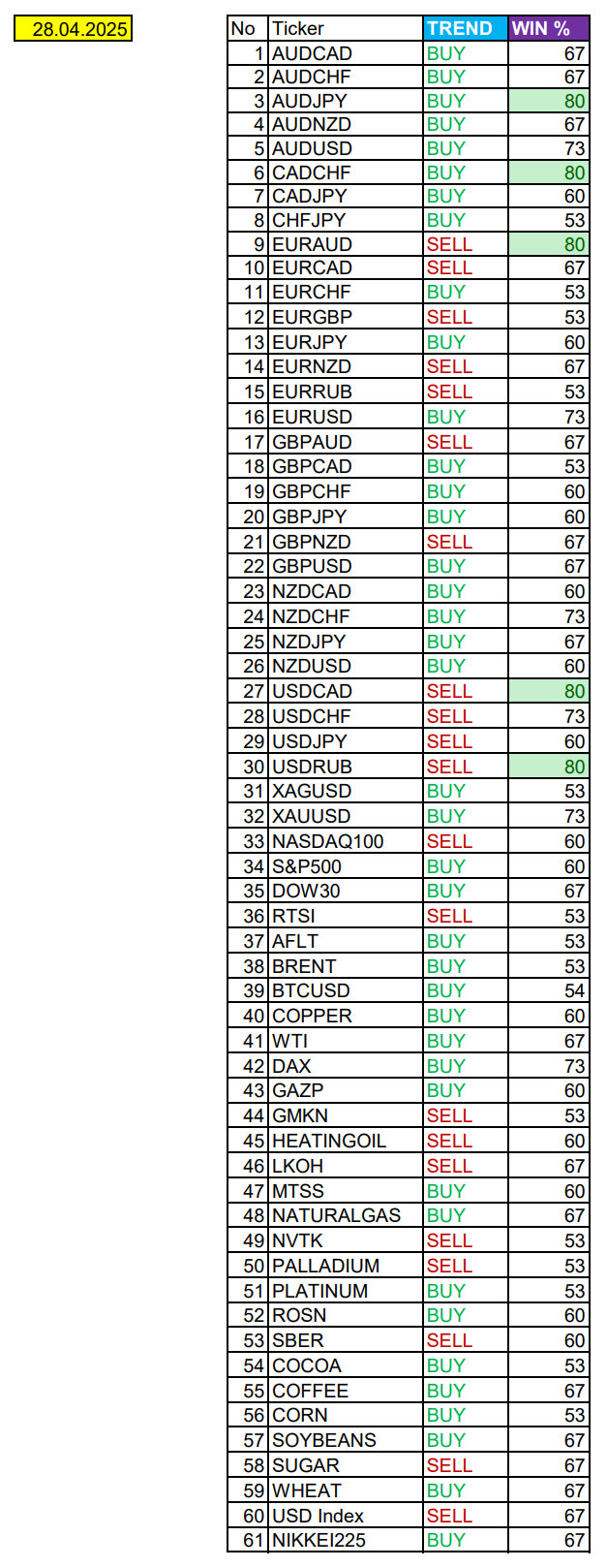 Опубликовано 28 апреля, 202528 апр Автор Валюты в фокусе дня. Сезонные тенденции и вероятности на Понедельник 28.04.2025Здравствуйте Уважаемые трейдеры! Александр Борских подготовил для Вас свежую информацию.Очередные сезонные тенденции на Понедельник 28 Апреля 2025 по основным мажорам финансовых рынков.Весь перечень анализируемых активов указан ниже в общем количестве 61 инструмента. Здесь Вы найдете активы рынка Форекс, популярные активы Московской биржи, не менее популярные активы Чикагской биржи СМЕ и мажор криптовалютного сегмента - Биткоин, за которым следуют все альткоины.Первый блок информации с зонами лимитных покупок и продаж. Данная информация включает в себя не только статистический показатель волатильности каждого актива, но и ближайшие опционные страйки с учетом премий за риск (Для верных расчетов рекомендуется просмотреть теоретическое видео в свободном доступе - Как использовать блок сезонности). А теперь сам блок информации №1:Второй блок информации с направленным вектором движения и вероятностями (внимательно обращаем внимание на цену открытия каждого актива. Обязательно для верных расчетов берем только цену открытия спотового актива). Как использовать вероятности в отношении цены открытия спотового актива - смотрим видео в открытом доступе (Как использовать блок сезонности). Данная информация с вероятностями поможет определить какова вероятность закрытия дня в отношении цены открытия этого же дня.А теперь сам блок информации №2:А теперь примеры построения блоков лимитных позиций и уточнение по сезонности с вероятностями отработки каждого актива по основным мажорам. По остальным активам, просмотрев теоретическое видео (Как использовать блок сезонности) - сможете построить лимитные блоки покупок и продаж самостоятельно. Ниже для примера продемонстрирую на сегодняшний день три основных мажора: Евро (EURUSD), Золото (XAUUSD), индекс НАСДАК (NASDAQ).EURUSDПо Евро сегодня вероятность 73% к закрытию дня закрыть день выше цены открытия дня 1,1346.Зона покупок 1,1309-1,1260 с целью 1,1346. Покупки в приоритете пока фон доллара США слабый.Зона продаж 1,1400-1,1450. Но новые продажи ожидаем от уровня 1,14753 и выше с целью 1,1450. В продажах сокращаем торговый объем раза в 4.XAUUSDПо Золоту сегодня вероятность 73% к закрытию дня закрыть день выше цены открытия дня 3302,97.Зона покупок 3294,22-3278,58 с целью 3302,97. Часть покупок отработали от уровней 3286,44 с целью 3294,22; от уровня 3278,58 с целью 3286,44; от уровня 3270,78 с целью 3278,58. Новые покупки ожидаем от уровня 3267,92 и ниже с целью 3278,58. Также активны покупки от уровня 3294,22 с целью 3302,97. Покупки в приоритете пока фон доллара США слабый. Но и не забываем о возможном балансе, которого пока нет.Зона продаж 3314,22-3327,41. Часть продаж ночью отработали от уровня 3334,07 с целью 3327,41. Новые продажи ожидаем от уровня 3336,51 и выше с целью 3327,41. В продажах сокращаем торговый объем раза в 4, т.к. текущий тренд пока еще восходящий.NASDAQПо индексу сегодня вероятность 60% к закрытию дня закрыть день ниже цены открытия дня 19356,00.Зона продаж 19414,43-19707,00. Но новые продажи ожидаем от уровня 19853,55 и выше с целью 19707,00. В продажах сокращаем торговый объем раза в 4, т.к. баланс.Зона покупок 19293,16-19191,50. Но новые покупки ожидаем от уровня 19141,03 и ниже с целью 19191,50. В покупках сокращаем торговый объем раза в 4, т.к. баланс.Сделки крупных игроков. Глобальный вектор движения и Недельный.Осн