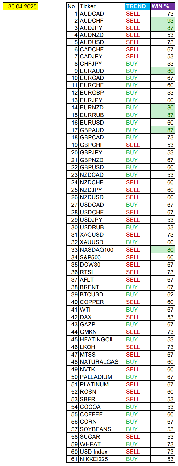 Опубликовано 30 апреля, 202530 апр Автор AUDCHF в фокусе дня. Сезонные тенденции и вероятности на Среду 30.04.2025Здравствуйте Уважаемые трейдеры! Александр Борских подготовил для Вас свежую информацию.Очередные сезонные тенденции на Среду 30 Апреля 2025 по основным мажорам финансовых рынков.Весь перечень анализируемых активов указан ниже в общем количестве 61 инструмента. Здесь Вы найдете активы рынка Форекс, популярные активы Московской биржи, не менее популярные активы Чикагской биржи СМЕ и мажор криптовалютного сегмента - Биткоин, за которым следуют все альткоины.Первый блок информации с зонами лимитных покупок и продаж. Данная информация включает в себя не только статистический показатель волатильности каждого актива, но и ближайшие опционные страйки с учетом премий за риск (Для верных расчетов рекомендуется просмотреть теоретическое видео в свободном доступе - Как использовать блок сезонности). А теперь сам блок информации №1:Второй блок информации с направленным вектором движения и вероятностями (внимательно обращаем внимание на цену открытия каждого актива. Обязательно для верных расчетов берем только цену открытия спотового актива). Как использовать вероятности в отношении цены открытия спотового актива - смотрим видео в открытом доступе (Как использовать блок сезонности). Данная информация с вероятностями поможет определить какова вероятность закрытия дня в отношении цены открытия этого же дня.А теперь сам блок информации №2:А теперь примеры построения блоков лимитных позиций и уточнение по сезонности с вероятностями отработки каждого актива по основным мажорам. По остальным активам, просмотрев теоретическое видео (Как использовать блок сезонности) - сможете построить лимитные блоки покупок и продаж самостоятельно. Ниже для примера продемонстрирую на сегодняшний день три основных мажора: Евро (EURUSD), Золото (XAUUSD), индекс НАСДАК (NASDAQ).EURUSDПо Евро сегодня вероятность 60% к закрытию дня закрыть день выше цены открытия дня 1,1391.Зона покупок 1,1352-1,1291 с целью 1,1391. Покупки в приоритете пока фон доллара США слабый.Зона продаж 1,1454-1,1529. Но новые продажи ожидаем от уровня 1,15668 и выше с целью 1,1529. В продажах сокращаем торговый объем раза в 4.XAUUSDПо Золоту сегодня вероятность 60% к закрытию дня закрыть день выше цены открытия дня 3317,34.Зона покупок 3304,05-3317,34 с целью 3317,34. Покупки в приоритете пока фон доллара США слабый.Зона продаж 3327,40-3351,69. Но новые продажи ожидаем от уровня 3363,82 и выше с целью 3351,69. В продажах сокращаем торговый объем раза в 4.NASDAQПо индексу сегодня вероятность 80% закрыть день ниже цены открытия дня 19466,00.Зона продаж 19505,05-19679,50. Но новые продажи ожидаем от уровня 19767,64 и выше с целью 19679,50. В продажах сокращаем торговый объем раза в 4, т.к. баланс.Зона покупок 19361,90-19078,25. Но новые покупки ожидаем от уровня 18936,67 и ниже с целью 19078,25. В покупках сокращаем торговый объем раза в 4, т.к. баланс.А теперь новостная лента ожиданий аналитических агентств и разбор отдельных показателей на сегодняшний день, чего ожидать на основных торговых сессиях. Также укажем фон доллара США, сильный на текущий момент или же слабый. От фона доллара США будет зависеть направленное движение самой пары.НОВОСТИ сегодня:Фон доллара США слабый10:55 МСК - ожидания частичного укрепления EUR11:00 - ожидания укрепления EUR12:00 - ожидания частичного ослабления EUR15:00 - ожидания частич