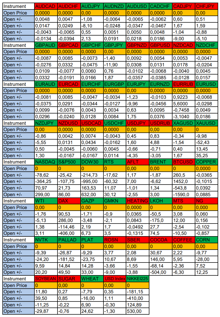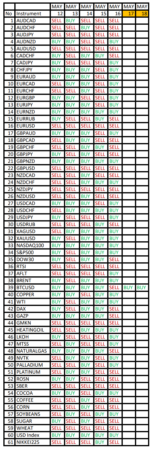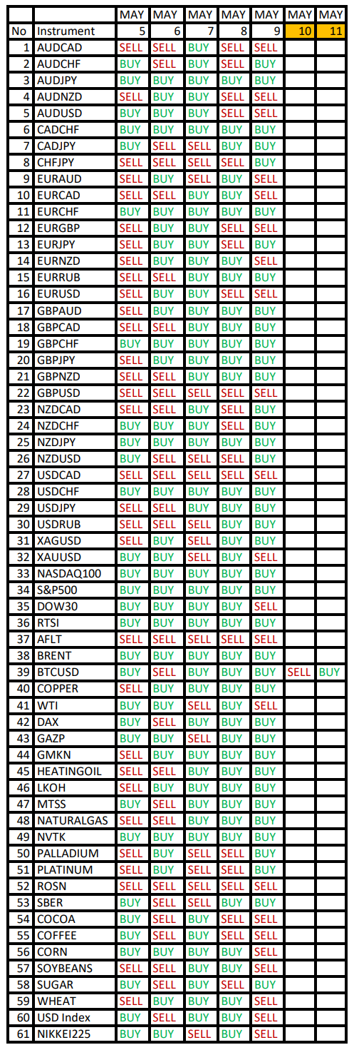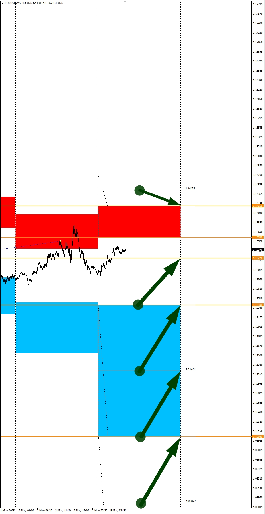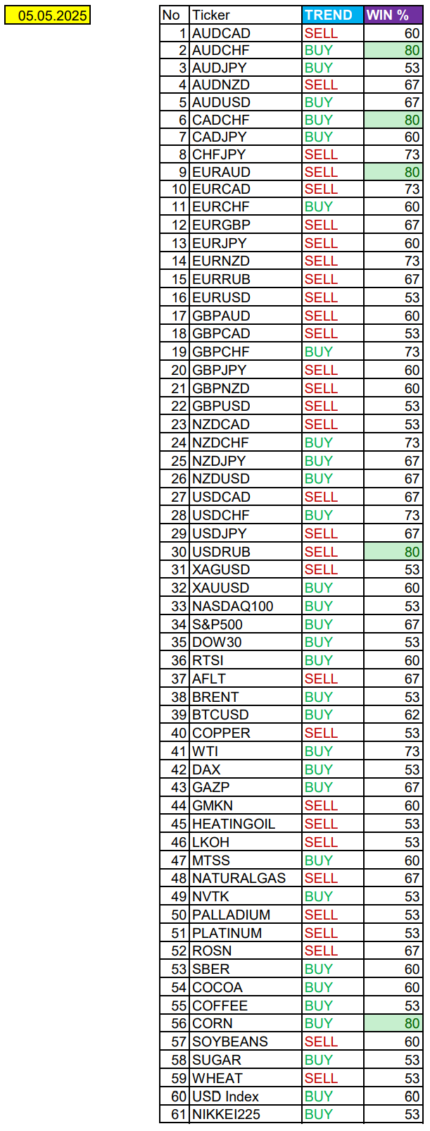 Опубликовано 5 мая, 20255 май Автор Валюты в фокусе дня. Сезонные тенденции и вероятности на Понедельник 05.05.2025Здравствуйте Уважаемые трейдеры! Александр Борских подготовил для Вас свежую информацию.Очередные сезонные тенденции на Понедельник 05 Мая 2025 по основным мажорам финансовых рынков.Весь перечень анализируемых активов указан ниже в общем количестве 61 инструмента. Здесь Вы найдете активы рынка Форекс, популярные активы Московской биржи, не менее популярные активы Чикагской биржи СМЕ и мажор криптовалютного сегмента - Биткоин, за которым следуют все альткоины.Первый блок информации с зонами лимитных покупок и продаж. Данная информация включает в себя не только статистический показатель волатильности каждого актива, но и ближайшие опционные страйки с учетом премий за риск (Для верных расчетов рекомендуется просмотреть теоретическое видео в свободном доступе - Как использовать блок сезонности). А теперь сам блок информации №1:Второй блок информации с направленным вектором движения и вероятностями (внимательно обращаем внимание на цену открытия каждого актива. Обязательно для верных расчетов берем только цену открытия спотового актива). Как использовать вероятности в отношении цены открытия спотового актива - смотрим видео в открытом доступе (Как использовать блок сезонности). Данная информация с вероятностями поможет определить какова вероятность закрытия дня в отношении цены открытия этого же дня.А теперь сам блок информации №2:А теперь примеры построения блоков лимитных позиций и уточнение по сезонности с вероятностями отработки каждого актива по основным мажорам. По остальным активам, просмотрев теоретическое видео (Как использовать блок сезонности) - сможете построить лимитные блоки покупок и продаж самостоятельно. Ниже для примера продемонстрирую на сегодняшний день три основных мажора: Евро (EURUSD), Золото (XAUUSD), индекс НАСДАК (NASDAQ).EURUSDПо Евро сегодня вероятность 53% к закрытию дня закрыть день ниже цены открытия дня 1,1322.Зона покупок 1,1239-1,1005 с целью 1,1322. Покупки в приоритете пока фон доллара США слабый.Зона продаж 1,1359-1,1415. Но новые продажи ожидаем от уровня 1,14433 и выше с целью 1,1415. В продажах сокращаем торговый объем раза в 4.XAUUSDПо Золоту сегодня вероятность 60% к закрытию дня закрыть день выше цены открытия дня 3248,20.Зона покупок 3233,86-3195,77 с целью 3248,20. Покупки в приоритете пока фон доллара США слабый.Зона продаж 3259,52-3276,76. Но новые продажи ожидаем от уровня 3285,45 и выше с целью 3276,76. В продажах сокращаем торговый объем раза в 4.NASDAQПо индексу сегодня вероятность 53% к закрытию дня закрыть день выше цены открытия дня 19998,00.Зона покупок 19912,41-19203,00. Но новые покупки ожидаем от уровня 18849,62 и ниже с целью 19203,00. В покупках сокращаем торговый объем раза в 4, т.к. баланс.Зона продаж 20076,71-20297,00. Но новые продажи ожидаем от уровня 20406,28 и выше с целью 20297,00. В продажах сокращаем торговый объем раза в 4, т.к. баланс.Сделки крупных игроков. Глобальный вектор движения и Недельный.Основные правила использования:1-При среднесрочной и внутридневной торговле используем вектор Недельных векторов движения (WEEKLY).2-Если Недельный (WEEKLY) вектор BUY - стараемся искать покупки НИЖЕ цены открытия новой недели.3-Если Недельный (WEEKLY) вектор SELL - стараемся искать продажи ВЫШЕ цены открытия новой недели.4-Комбинируем данный подход с остальными подтверждающими факт