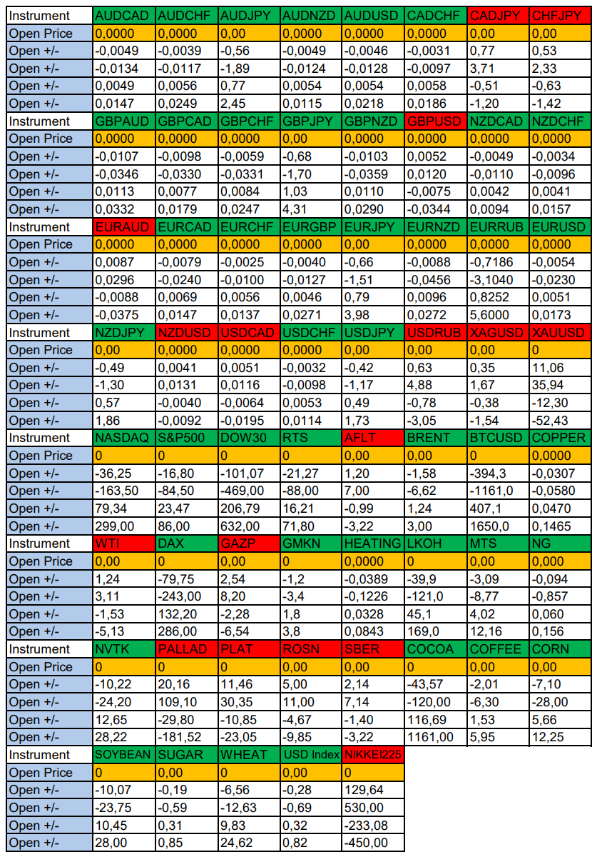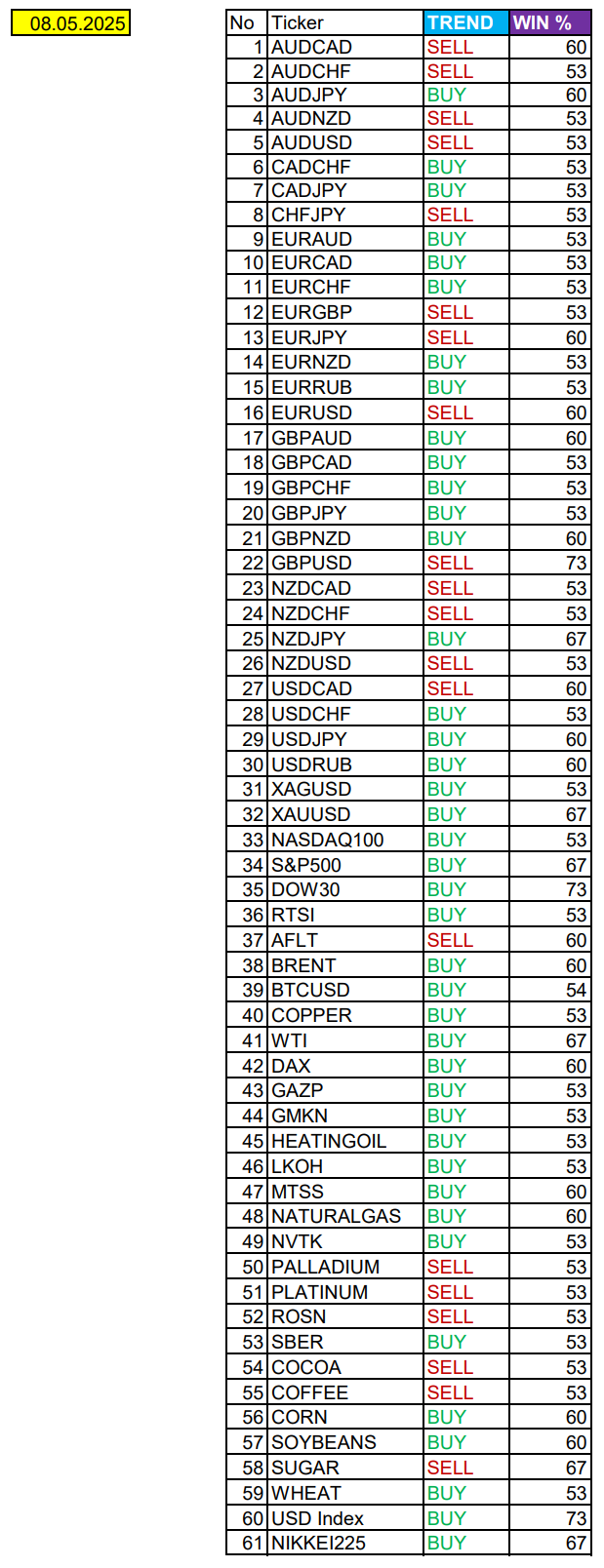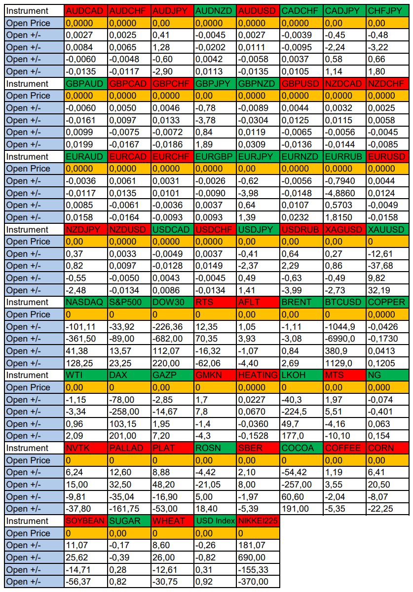 Опубликовано 2 мая, 20252 май Автор USDCAD, RTS в фокусе дня. Сезонные тенденции и вероятности на Пятницу 02.05.2025Здравствуйте Уважаемые трейдеры! Александр Борских подготовил для Вас свежую информацию.Очередные сезонные тенденции на Пятницу 02 Мая 2025 по основным мажорам финансовых рынков.Весь перечень анализируемых активов указан ниже в общем количестве 61 инструмента. Здесь Вы найдете активы рынка Форекс, популярные активы Московской биржи, не менее популярные активы Чикагской биржи СМЕ и мажор криптовалютного сегмента - Биткоин, за которым следуют все альткоины.Первый блок информации с зонами лимитных покупок и продаж. Данная информация включает в себя не только статистический показатель волатильности каждого актива, но и ближайшие опционные страйки с учетом премий за риск (Для верных расчетов рекомендуется просмотреть теоретическое видео в свободном доступе - Как использовать блок сезонности). А теперь сам блок информации №1:Второй блок информации с направленным вектором движения и вероятностями (внимательно обращаем внимание на цену открытия каждого актива. Обязательно для верных расчетов берем только цену открытия спотового актива). Как использовать вероятности в отношении цены открытия спотового актива - смотрим видео в открытом доступе (Как использовать блок сезонности). Данная информация с вероятностями поможет определить какова вероятность закрытия дня в отношении цены открытия этого же дня.А теперь сам блок информации №2:А теперь примеры построения блоков лимитных позиций и уточнение по сезонности с вероятностями отработки каждого актива по основным мажорам. По остальным активам, просмотрев теоретическое видео (Как использовать блок сезонности) - сможете построить лимитные блоки покупок и продаж самостоятельно. Ниже для примера продемонстрирую на сегодняшний день три основных мажора: Евро (EURUSD), Золото (XAUUSD), индекс НАСДАК (NASDAQ).EURUSDПо Евро сегодня вероятность 53% к закрытию дня закрыть день выше цены открытия дня 1,1296Зона покупок 1,1243-1,1153 с целью 1,1296. Покупки в приоритете пока фон доллара США слабый.Зона продаж 1,1339-1,1400. Но новые продажи ожидаем от уровня 1,14307 и выше с целью 1,1400. В продажах сокращаем торговый объем раза в 4.XAUUSDПо Золоту сегодня вероятность 53% к закрытию дня закрыть день ниже цены открытия дня 3237,38.Зона покупок 3223,65-3196,03 с целью 3237,38. Покупки в приоритете пока фон доллара США слабый.Зона продаж 3247,57-3274,11. Но новые продажи ожидаем от уровня 3287,39 и выше с целью 3274,11. В продажах сокращаем торговый объем раза в 4, т.к. общий тренд восходящий.NASDAQПо индексу сегодня вероятность 53% к закрытию дня закрыть день выше цены открытия дня 19696,00.Зона покупок 19625,57-19513,50. НО новые покупки ожидаем от уровня 19457,97 и ниже с целью 19513,50. В покупках сокращаем торговый объем раза в 4, т.к. баланс!Зона продаж 19741,38-19888,25. Но новые продажи ожидаем от уровня 19962,00 и выше с целью 19888,25. В продажах сокращаем торговый объем раза в 4, т.к. баланс!А теперь новостная лента ожиданий аналитических агентств и разбор отдельных показателей на сегодняшний день, чего ожидать на основных торговых сессиях. Также укажем фон доллара США, сильный на текущий момент или же слабый. От фона доллара США будет зависеть направленное движение самой пары.НОВОСТИ сегодня:Фон доллара США слабый10:15 МСК - ожидания частичного укрепления EUR10:30 - ожидания частичного ослабления CHF10:45 - о