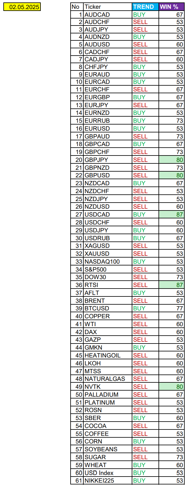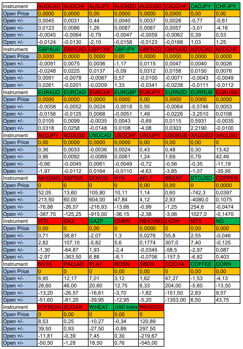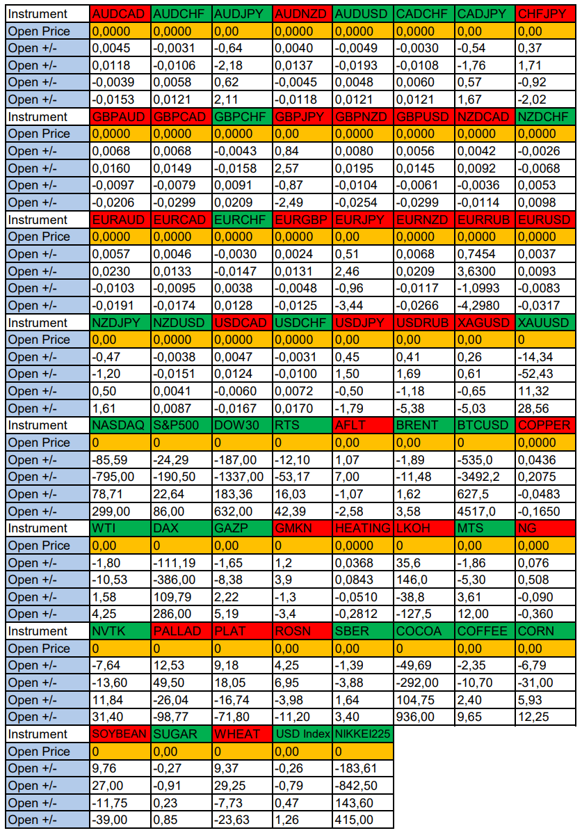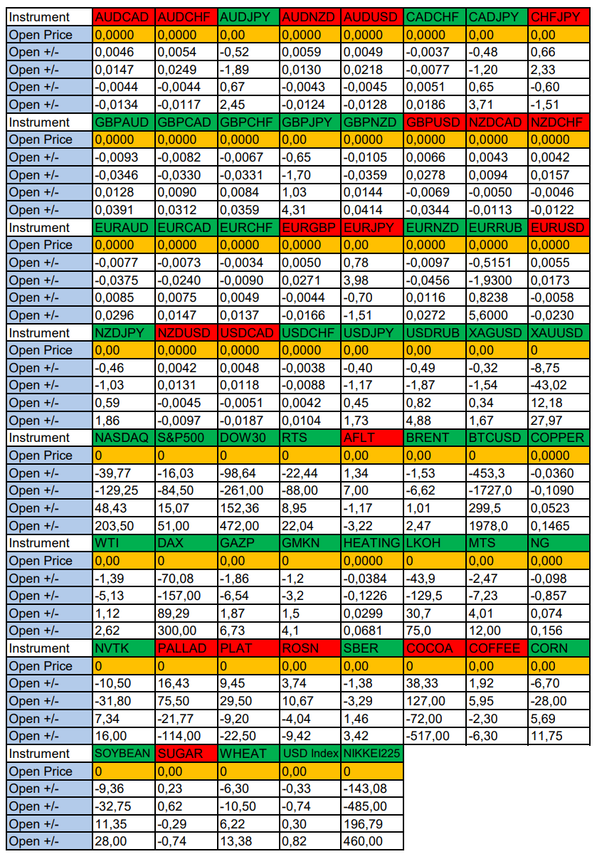 Опубликовано 2 мая, 20252 май Автор USDCAD, RTS в фокусе дня. Сезонные тенденции и вероятности на Пятницу 02.05.2025Здравствуйте Уважаемые трейдеры! Александр Борских подготовил для Вас свежую информацию.Очередные сезонные тенденции на Пятницу 02 Мая 2025 по основным мажорам финансовых рынков.Весь перечень анализируемых активов указан ниже в общем количестве 61 инструмента. Здесь Вы найдете активы рынка Форекс, популярные активы Московской биржи, не менее популярные активы Чикагской биржи СМЕ и мажор криптовалютного сегмента - Биткоин, за которым следуют все альткоины.Первый блок информации с зонами лимитных покупок и продаж. Данная информация включает в себя не только статистический показатель волатильности каждого актива, но и ближайшие опционные страйки с учетом премий за риск (Для верных расчетов рекомендуется просмотреть теоретическое видео в свободном доступе - Как использовать блок сезонности). А теперь сам блок информации №1:Второй блок информации с направленным вектором движения и вероятностями (внимательно обращаем внимание на цену открытия каждого актива. Обязательно для верных расчетов берем только цену открытия спотового актива). Как использовать вероятности в отношении цены открытия спотового актива - смотрим видео в открытом доступе (Как использовать блок сезонности). Данная информация с вероятностями поможет определить какова вероятность закрытия дня в отношении цены открытия этого же дня.А теперь сам блок информации №2:А теперь примеры построения блоков лимитных позиций и уточнение по сезонности с вероятностями отработки каждого актива по основным мажорам. По остальным активам, просмотрев теоретическое видео (Как использовать блок сезонности) - сможете построить лимитные блоки покупок и продаж самостоятельно. Ниже для примера продемонстрирую на сегодняшний день три основных мажора: Евро (EURUSD), Золото (XAUUSD), индекс НАСДАК (NASDAQ).EURUSDПо Евро сегодня вероятность 53% к закрытию дня закрыть день выше цены открытия дня 1,1296Зона покупок 1,1243-1,1153 с целью 1,1296. Покупки в приоритете пока фон доллара США слабый.Зона продаж 1,1339-1,1400. Но новые продажи ожидаем от уровня 1,14307 и выше с целью 1,1400. В продажах сокращаем торговый объем раза в 4.XAUUSDПо Золоту сегодня вероятность 53% к закрытию дня закрыть день ниже цены открытия дня 3237,38.Зона покупок 3223,65-3196,03 с целью 3237,38. Покупки в приоритете пока фон доллара США слабый.Зона продаж 3247,57-3274,11. Но новые продажи ожидаем от уровня 3287,39 и выше с целью 3274,11. В продажах сокращаем торговый объем раза в 4, т.к. общий тренд восходящий.NASDAQПо индексу сегодня вероятность 53% к закрытию дня закрыть день выше цены открытия дня 19696,00.Зона покупок 19625,57-19513,50. НО новые покупки ожидаем от уровня 19457,97 и ниже с целью 19513,50. В покупках сокращаем торговый объем раза в 4, т.к. баланс!Зона продаж 19741,38-19888,25. Но новые продажи ожидаем от уровня 19962,00 и выше с целью 19888,25. В продажах сокращаем торговый объем раза в 4, т.к. баланс!А теперь новостная лента ожиданий аналитических агентств и разбор отдельных показателей на сегодняшний день, чего ожидать на основных торговых сессиях. Также укажем фон доллара США, сильный на текущий момент или же слабый. От фона доллара США будет зависеть направленное движение самой пары.НОВОСТИ сегодня:Фон доллара США слабый10:15 МСК - ожидания частичного укрепления EUR10:30 - ожидания частичного ослабления CHF10:45 - о