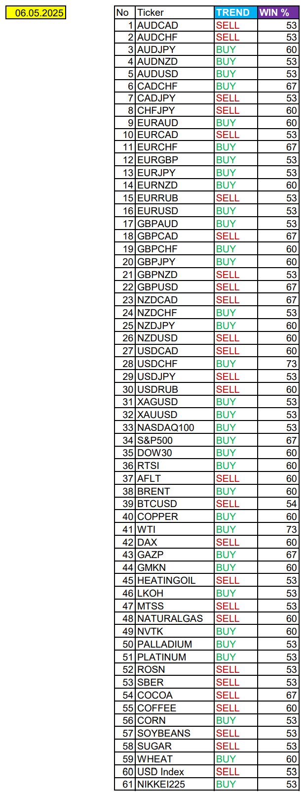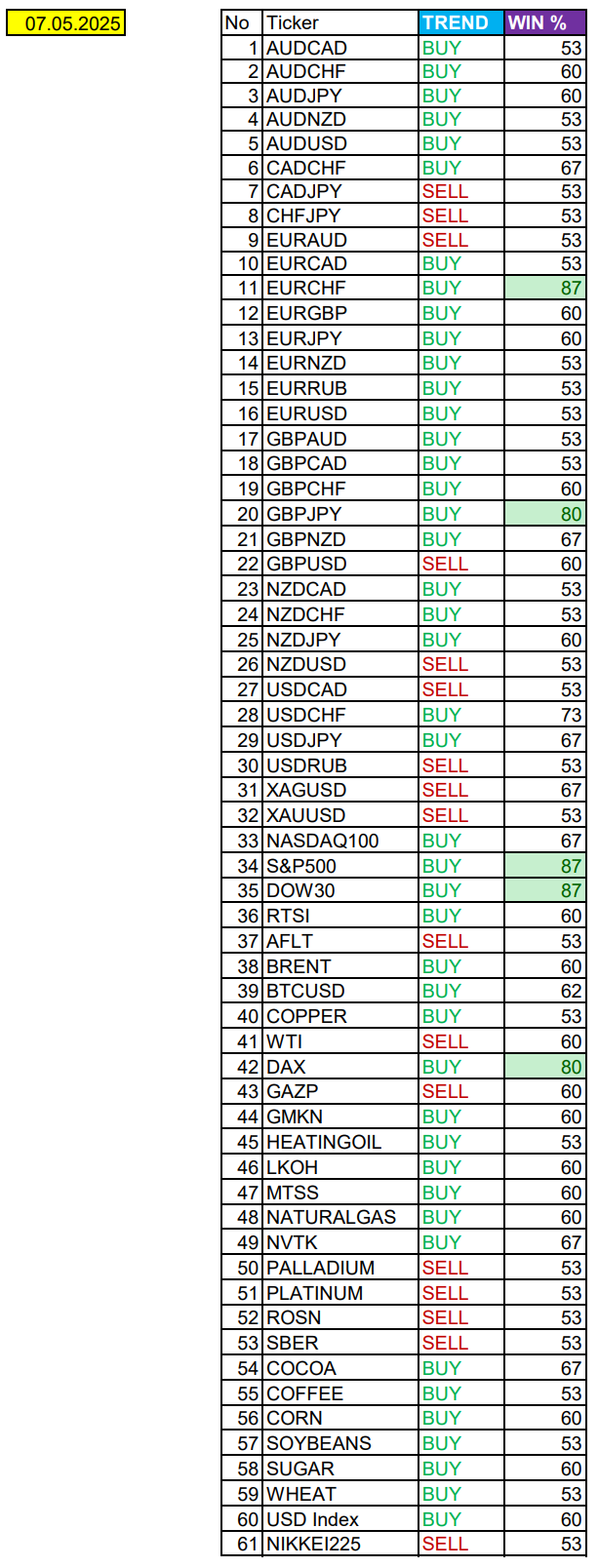 Опубликовано 6 мая, 20256 май Автор Сезонные тенденции и вероятности на Вторник 06.05.2025Здравствуйте Уважаемые трейдеры! Александр Борских подготовил для Вас свежую информацию.Очередные сезонные тенденции на Вторник 06 Мая 2025 по основным мажорам финансовых рынков.Весь перечень анализируемых активов указан ниже в общем количестве 61 инструмента. Здесь Вы найдете активы рынка Форекс, популярные активы Московской биржи, не менее популярные активы Чикагской биржи СМЕ и мажор криптовалютного сегмента - Биткоин, за которым следуют все альткоины.Первый блок информации с зонами лимитных покупок и продаж. Данная информация включает в себя не только статистический показатель волатильности каждого актива, но и ближайшие опционные страйки с учетом премий за риск (Для верных расчетов рекомендуется просмотреть теоретическое видео в свободном доступе - Как использовать блок сезонности). А теперь сам блок информации №1:Второй блок информации с направленным вектором движения и вероятностями (внимательно обращаем внимание на цену открытия каждого актива. Обязательно для верных расчетов берем только цену открытия спотового актива). Как использовать вероятности в отношении цены открытия спотового актива - смотрим видео в открытом доступе (Как использовать блок сезонности). Данная информация с вероятностями поможет определить какова вероятность закрытия дня в отношении цены открытия этого же дня.А теперь сам блок информации №2:А теперь примеры построения блоков лимитных позиций и уточнение по сезонности с вероятностями отработки каждого актива по основным мажорам. По остальным активам, просмотрев теоретическое видео (Как использовать блок сезонности) - сможете построить лимитные блоки покупок и продаж самостоятельно. Ниже для примера продемонстрирую на сегодняшний день три основных мажора: Евро (EURUSD), Золото (XAUUSD), индекс НАСДАК (NASDAQ).EURUSDПо Евро сегодня вероятность 53% к закрытию дня закрыть день выше цены открытия дня 1,1313Зона покупок 1,1245-1,1015 с целью 1,1313. Покупки в приоритете пока фон доллара США слабый.Зона продаж 1,1362-1,1499. Но новые продажи ожидаем от уровня 1,15675 и выше с целью 1,1499. В продажах сокращаем торговый объем раза в 4.XAUUSDПо Золоту сегодня вероятность 53% к закрытию дня закрыть день выше цены открытия дня 3333,98.Зона покупок 3324,00-3281,55 с целью 3333,98. Часть покупок отработали на азии от уровня 3324,00 с целью 3333,98. Новые покупки ожидаем от уровня 3302,89 и ниже с целями на графике. Покупки в приоритете пока фон доллара США слабый.Зона продаж 3347,43-3369,23. Но новые продажи ожидали выше сезонного блока, часть отработали на азии от уровня 3380,17 с целью 3369,23. Новые продажи ожидаем от уровня 3387,12 и выше с целью 3369,23. В продажах сокращаем торговый объем раза в 4, т.к. общий тренд все еще восходящий!NASDAQПо индексу сегодня вероятность 53% к закрытию дня закрыть день выше цены открытия дня 19923,00.Зона покупок 19844,38-19558,75. Но новые покупки ожидаем от уровня 19415,76 и ниже с целью 19558,75. В покупках сокращаем торговый объем раза в 4, т.к. баланс.Зона продаж 19993,97-20222,00. Но новые продажи ожидаем от уровня 20336,68 и выше с целью 20222,00. В продажах сокращаем торговый объем раза в 4. т.к. баланс.А теперь новостная лента ожиданий аналитических агентств и разбор отдельных показателей на сегодняшний день, чего ожидать на основных торговых сессиях. Также укажем фон доллара США, сильный на текущий момент 