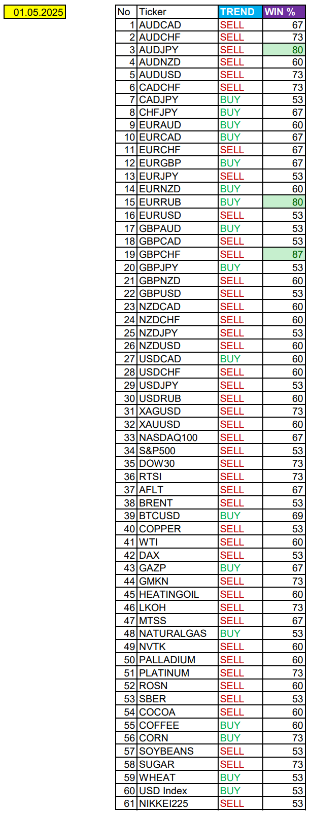 Опубликовано 1 мая, 20251 май Автор GBPCHF в фокусе дня. Сезонные тенденции и вероятности на Четверг 01.05.2025Здравствуйте Уважаемые трейдеры! Александр Борских подготовил для Вас свежую информацию.Очередные сезонные тенденции на Четверг 01 Мая 2025 по основным мажорам финансовых рынков.Весь перечень анализируемых активов указан ниже в общем количестве 61 инструмента. Здесь Вы найдете активы рынка Форекс, популярные активы Московской биржи, не менее популярные активы Чикагской биржи СМЕ и мажор криптовалютного сегмента - Биткоин, за которым следуют все альткоины.Первый блок информации с зонами лимитных покупок и продаж. Данная информация включает в себя не только статистический показатель волатильности каждого актива, но и ближайшие опционные страйки с учетом премий за риск (Для верных расчетов рекомендуется просмотреть теоретическое видео в свободном доступе - Как использовать блок сезонности). А теперь сам блок информации №1:Второй блок информации с направленным вектором движения и вероятностями (внимательно обращаем внимание на цену открытия каждого актива. Обязательно для верных расчетов берем только цену открытия спотового актива). Как использовать вероятности в отношении цены открытия спотового актива - смотрим видео в открытом доступе (Как использовать блок сезонности). Данная информация с вероятностями поможет определить какова вероятность закрытия дня в отношении цены открытия этого же дня.А теперь сам блок информации №2:А теперь примеры построения блоков лимитных позиций и уточнение по сезонности с вероятностями отработки каждого актива по основным мажорам. По остальным активам, просмотрев теоретическое видео (Как использовать блок сезонности) - сможете построить лимитные блоки покупок и продаж самостоятельно. Ниже для примера продемонстрирую на сегодняшний день три основных мажора: Евро (EURUSD), Золото (XAUUSD), индекс НАСДАК (NASDAQ).EURUSDПо Евро сегодня вероятность 53% к закрытию дня закрыть день ниже цены открытия дня 1,1323.Зона покупок 1,1288-1,1223 с целью 1,1323. Покупки в приоритете пока фон доллара США слабый.Зона продаж 1,1376-1,1431. Но новые продажи ожидаем от уровня 1,14584 и выше с целью 1,1431. В продажах сокращаем торговый объем раза в 4.XAUUSDПо Золоту сегодня вероятность 60% к закрытию дня закрыть день ниже цены открытия дня 3272,75.Зона покупок 3261,56-3236,80. Часть покупок отработали на азии от уровня 3224,45 с целью 3236,80. Новые покупки ожидаем от уровня 3221,18 и ниже с целью 3236,80. В покупках сокращаем торговый объем раза в 4, т.к. баланс!Зона продаж 3286,17-3315,24. Но новые продажи ожидаем от уровня 3329,80 и выше с целью 3315,24. В продажах сокращаем торговый объем раза в 4, т.к. баланс!NASDAQПо индексу сегодня вероятность 67% к закрытию дня закрыть день ниже цены открытия дня 19823,00.Зона покупок 19746,12-19435,25. Но новые покупки ожидаем от уровня 19280,44 и ниже с целью 19435,25. В покупках сокращаем торговый объем раза в 4. т.к. баланс!Зона продаж 19875,05-20036,50. Но новые продажи ожидаем от уровня 20117,57 и выше с целью 20036,50. В продажах сокращаем торговый объем раза в 4, т.к. баланс!А теперь новостная лента ожиданий аналитических агентств и разбор отдельных показателей на сегодняшний день, чего ожидать на основных торговых сессиях. Также укажем фон доллара США, сильный на текущий момент или же слабый. От фона доллара США будет зависеть направленное движение самой пары.НОВОСТИ сегодня:Фон доллара США с