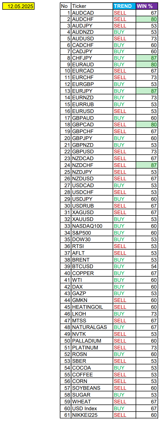 Опубликовано 12 мая, 202512 май Автор Валюты в фокусе дня. Сезонные тенденции и вероятности на Понедельник 12.05.2025Здравствуйте Уважаемые трейдеры! С Вами снова Александр Борских. Подготовил для Вас свежую информацию.Очередные сезонные тенденции на Понедельник 12 Мая 2025 по основным мажорам финансовых рынков.Весь перечень анализируемых активов указан ниже в общем количестве 61 инструмента. Здесь Вы найдете активы рынка Форекс, популярные активы Московской биржи, не менее популярные активы Чикагской биржи СМЕ и мажор криптовалютного сегмента - Биткоин, за которым следуют все альткоины.Первый блок информации с зонами лимитных покупок и продаж. Данная информация включает в себя не только статистический показатель волатильности каждого актива, но и ближайшие опционные страйки с учетом премий за риск (Для верных расчетов рекомендуется просмотреть теоретическое видео в свободном доступе - Как использовать блок сезонности). А теперь сам блок информации №1:Второй блок информации с направленным вектором движения и вероятностями (внимательно обращаем внимание на цену открытия каждого актива. Обязательно для верных расчетов берем только цену открытия спотового актива). Как использовать вероятности в отношении цены открытия спотового актива - смотрим видео в открытом доступе (Как использовать блок сезонности). Данная информация с вероятностями поможет определить какова вероятность закрытия дня в отношении цены открытия этого же дня.А теперь сам блок информации №2:А теперь примеры построения блоков лимитных позиций и уточнение по сезонности с вероятностями отработки каждого актива по основным мажорам. По остальным активам, просмотрев теоретическое видео (Как использовать блок сезонности) - сможете построить лимитные блоки покупок и продаж самостоятельно. Ниже для примера продемонстрирую на сегодняшний день три основных мажора: Евро (EURUSD), Золото (XAUUSD), индекс НАСДАК (NASDAQ).EURUSDПо Евро сегодня вероятность 53% к закрытию дня закрыть день ниже цены открытия дня 1,1229.Зона покупок 1,1180-1,1071 с целью 1,1229. Покупки в приоритете пока фон доллара США слабый.Зона продаж 1,1273-1,1353. Но новые продажи ожидаем от уровня 1,13929 и выше с целью 1,1353. В продажах сокращаем торговый объем раза в 4.XAUUSDПо Золоту сегодня вероятность 53% к закрытию дня закрыть день выше цены открытия дня 3287,98.Зона покупок 3275,37-3250,30. Часть покупок отработали от уровня 3275,37 с целью 3287,98; от уровня 3262,88 с целью 3275,37. Новые покупки ожидаем от уровня 3250,30 и ниже с целями на графике. Покупки пока еще в приоритете пока фон доллара США слабый, внимательно следим за балансом золота и возможности его проявления!Зона продаж 3297,80-3320,17. Но новые продажи ожидаем от уровня 3331,34 и выше с целью 3320,17. В продажах сокращаем торговый объем раза в 4.NASDAQПо индексу сегодня вероятность 60% к закрытию дня закрыть день выше цены открытия дня 20376,00.Зона покупок 20274,89-20014,50 с целью 20376,00. Покупки в приоритете, тренд восходящий.Зона продаж 20417,38-20504,25. Но новые продажи ожидаем с текущих 20760,00+ с целью 20504,25 В продажах сокращаем торговый объем раза в 4, т.к. тренд восходящий.Сделки крупных игроков. Глобальный вектор движения и Недельный.Основные правила использования:1-При среднесрочной и внутридневной торговле используем вектор Недельных векторов движения (WEEKLY).2-Если Недельный (WEEKLY) вектор BUY - стараемся искать покупки НИЖЕ цены открытия но