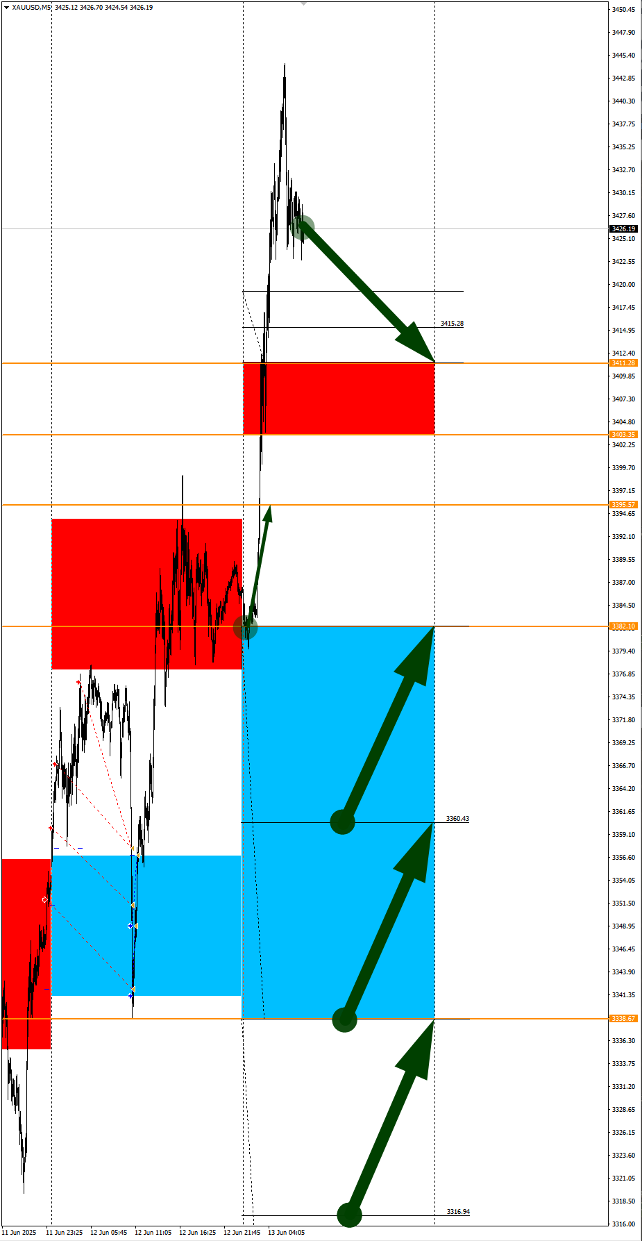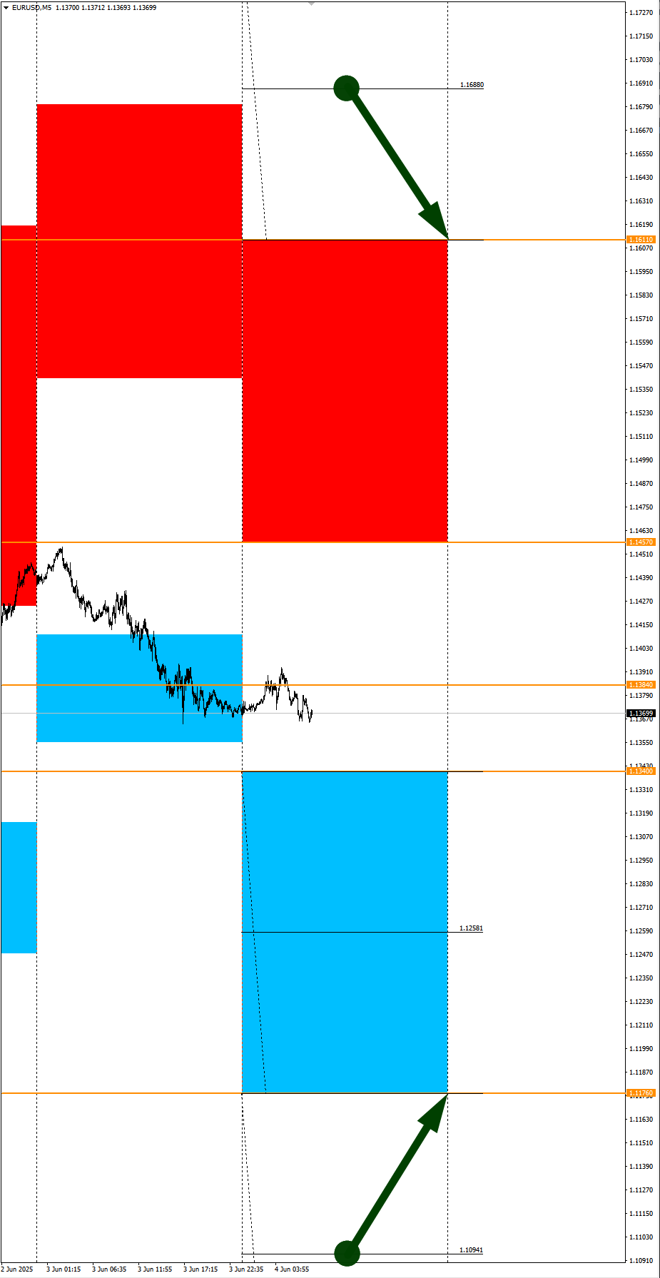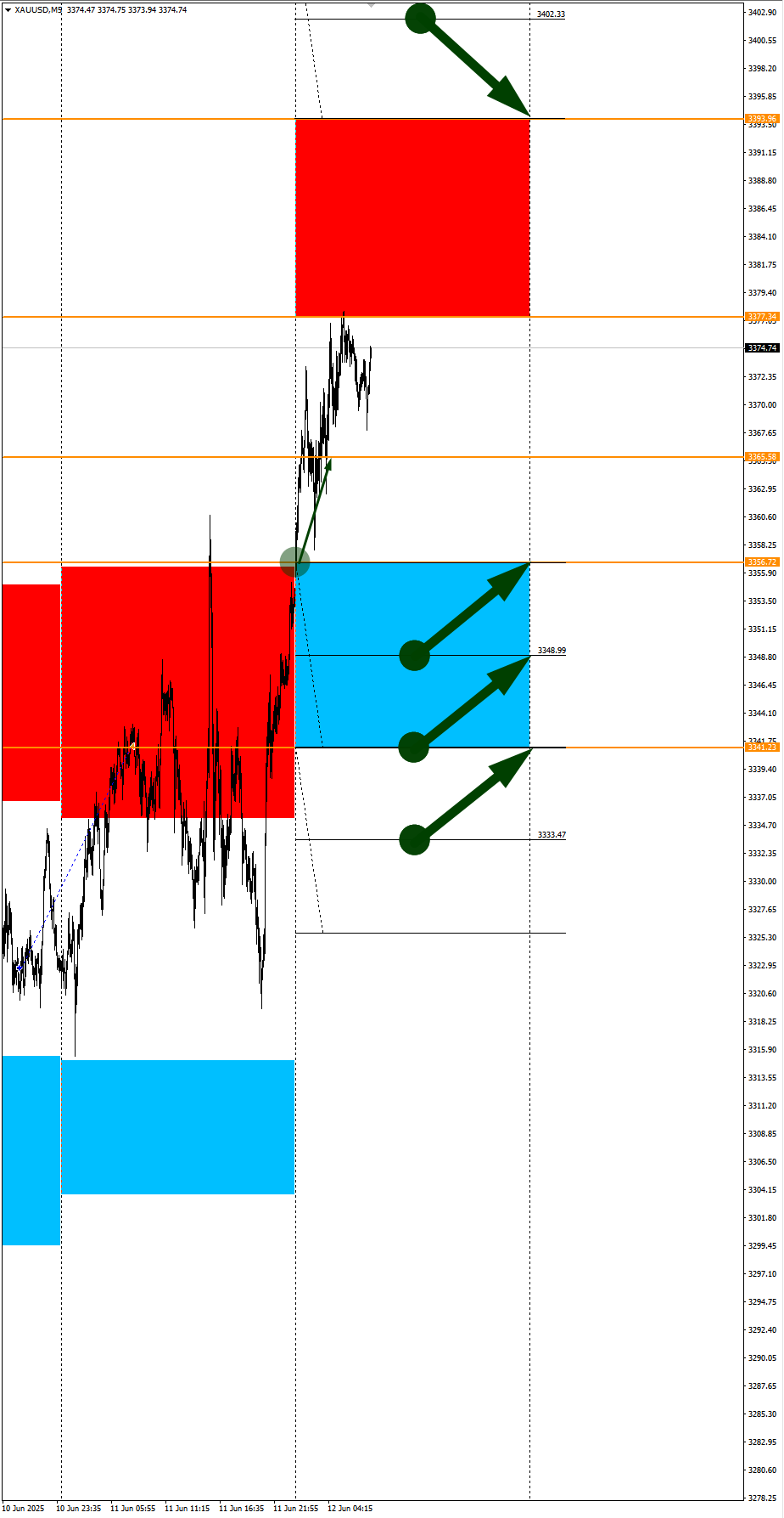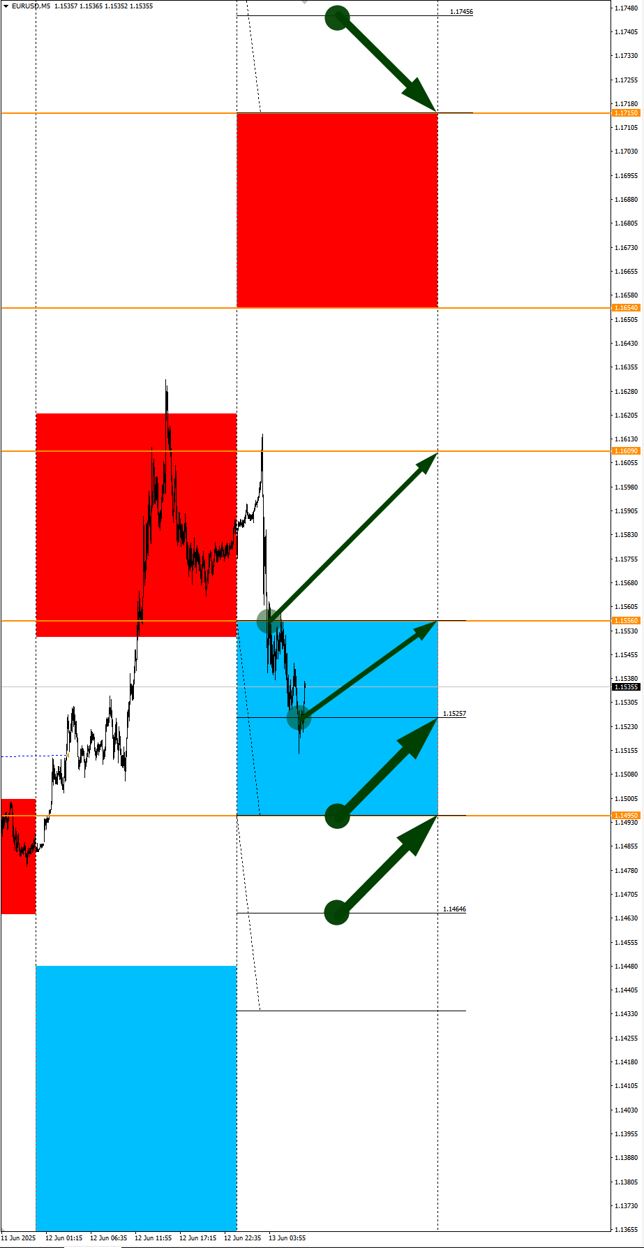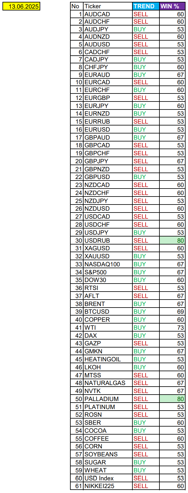 Опубликовано 13 июня, 202513 июнь Автор USDRUB, PA в фокусе дня. Сезонные тенденции и вероятности на Пятницу 13.06.2025Здравствуйте Уважаемые трейдеры! С Вами снова Александр Борских. Подготовил для Вас свежую информацию.Очередные сезонные тенденции на Пятницу 13 Июня 2025 по основным мажорам финансовых рынков.Весь перечень анализируемых активов указан ниже в общем количестве 61 инструмента. Здесь Вы найдете активы рынка Форекс, популярные активы Московской биржи, не менее популярные активы Чикагской биржи СМЕ и мажор криптовалютного сегмента - Биткоин, за которым следуют все альткоины.Первый блок информации с зонами лимитных покупок и продаж. Данная информация включает в себя не только статистический показатель волатильности каждого актива, но и ближайшие опционные страйки с учетом премий за риск (Для верных расчетов рекомендуется просмотреть теоретическое видео в свободном доступе - Как использовать блок сезонности). А теперь сам блок информации №1:Второй блок информации с направленным вектором движения и вероятностями (внимательно обращаем внимание на цену открытия каждого актива. Обязательно для верных расчетов берем только цену открытия спотового актива). Как использовать вероятности в отношении цены открытия спотового актива - смотрим видео в открытом доступе (Как использовать блок сезонности). Данная информация с вероятностями поможет определить какова вероятность закрытия дня в отношении цены открытия этого же дня.А теперь сам блок информации №2:А теперь примеры построения блоков лимитных позиций и уточнение по сезонности с вероятностями отработки каждого актива по основным мажорам. По остальным активам, просмотрев теоретическое видео (Как использовать блок сезонности) - сможете построить лимитные блоки покупок и продаж самостоятельно. Ниже для примера продемонстрирую на сегодняшний день три основных мажора: Евро (EURUSD), Золото (XAUUSD), индекс НАСДАК (NASDAQ).EURUSDПо Евро сегодня вероятность 53% к закрытию дня закрыть день выше цены открытия дня 1,1609.Зона покупок 1,1556-1,1495 с целью 1,1609. Часть покупок активно от уровня 1,1556 с целью 1,1609; от уровня 1,15257 с целью 1,1556. Новые покупки ожидаем от уровня 1,1495 и ниже с целями на графике. Покупки в приоритете пока фон доллара США слабый.Зона продаж 1,1654-1,1715. Но новые продажи ожидаем от уровня 1,17456 и выше с целью 1,1715. В продажах сокращаем торговый объем раза в 4, т.к. общий тренд восходящий.XAUUSDПо Золоту сегодня вероятность 53% к закрытию дня закрыть день выше цены открытия дня 3395,57.Зона покупок 3382,10-3338,67 с целью 3395,57. Часть покупок отработали на азии от уровня 3382,10 с целью 3395,57. Новые покупки ожидаем от уровня 3360,43 и ниже с целями на графике. Покупки в приоритете пока фон доллара США слабый.Зона продаж 3403,35-3411,28. Но новые продажи ожидаем от уровня 3415,28 и выше с целью 3411,28. С текущий активна агрессивная продажа до цели 3411,28. В продажах сокращаем торговый объем раза в 4, т.к. общий тренд все еще восходящий.NASDAQПо индексу сегодня вероятность 67% к закрытию дня закрыть день выше цены открытия дня 21771,00.Зона покупок 21699,37-21257,50 с целью 21771,00. Часть покупок активна до целей 21699,37 и 21771,00. Новые покупки ожидаем от уровня 21257,50 и ниже с целями на графике. Покупки в приоритете пока фон доллара США слабый.Зона продаж 21820,70-22004,25. Но новые продажи ожидаем от уровня 22095,21 и выше с целью 22004,25. В продажах сокращаем торговый объем раза в 4, т.к. общий 