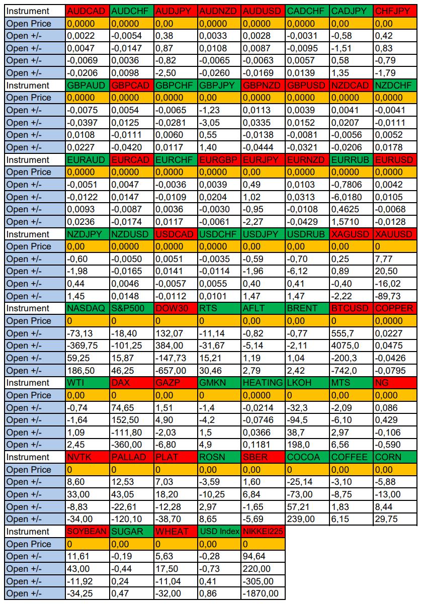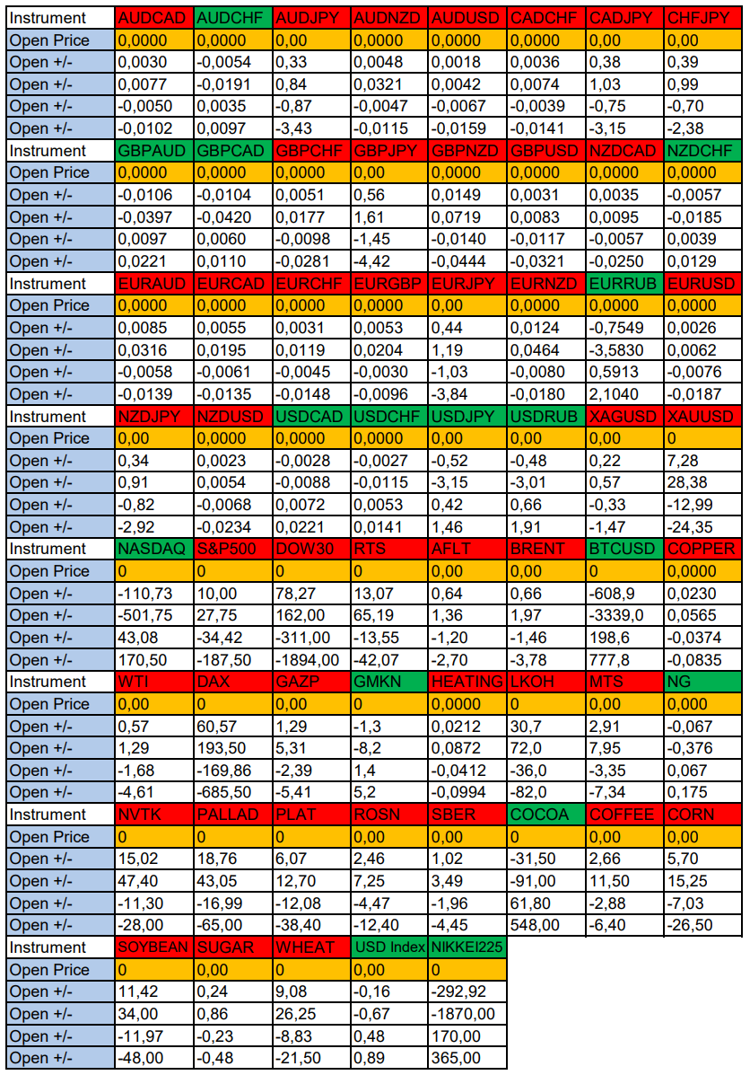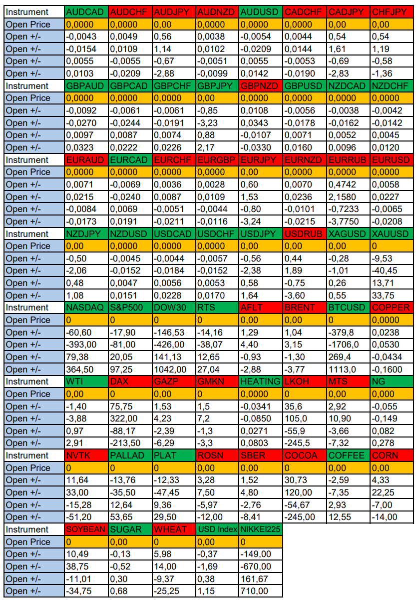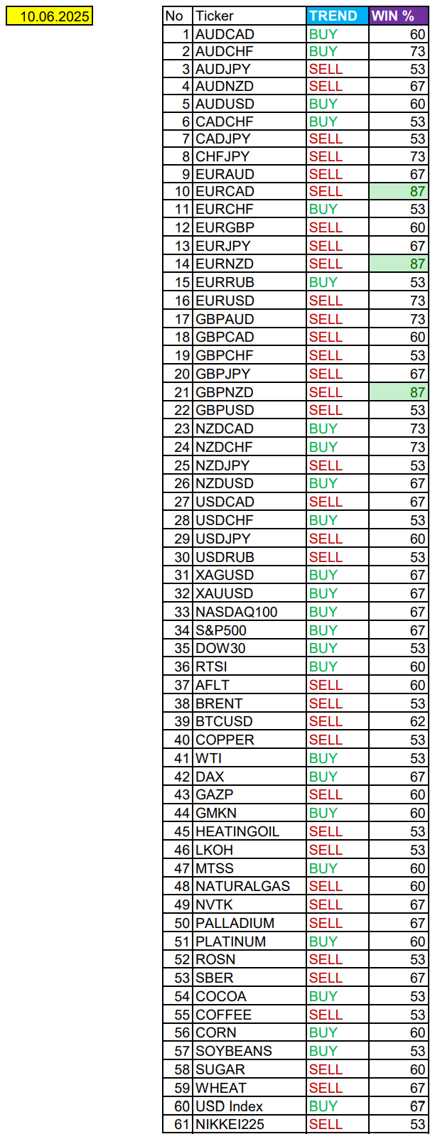 Опубликовано 10 июня, 202510 июнь Автор Валюты в фокусе дня. Сезонные тенденции и вероятности на Вторник 10.06.2025Здравствуйте Уважаемые трейдеры! С Вами снова Александр Борских. Подготовил для Вас свежую информацию.Очередные сезонные тенденции на Вторник 10 Июня 2025 по основным мажорам финансовых рынков.Весь перечень анализируемых активов указан ниже в общем количестве 61 инструмента. Здесь Вы найдете активы рынка Форекс, популярные активы Московской биржи, не менее популярные активы Чикагской биржи СМЕ и мажор криптовалютного сегмента - Биткоин, за которым следуют все альткоины.Первый блок информации с зонами лимитных покупок и продаж. Данная информация включает в себя не только статистический показатель волатильности каждого актива, но и ближайшие опционные страйки с учетом премий за риск (Для верных расчетов рекомендуется просмотреть теоретическое видео в свободном доступе - Как использовать блок сезонности). А теперь сам блок информации №1:Второй блок информации с направленным вектором движения и вероятностями (внимательно обращаем внимание на цену открытия каждого актива. Обязательно для верных расчетов берем только цену открытия спотового актива). Как использовать вероятности в отношении цены открытия спотового актива - смотрим видео в открытом доступе (Как использовать блок сезонности). Данная информация с вероятностями поможет определить какова вероятность закрытия дня в отношении цены открытия этого же дня.А теперь сам блок информации №2:А теперь примеры построения блоков лимитных позиций и уточнение по сезонности с вероятностями отработки каждого актива по основным мажорам. По остальным активам, просмотрев теоретическое видео (Как использовать блок сезонности) - сможете построить лимитные блоки покупок и продаж самостоятельно. Ниже для примера продемонстрирую на сегодняшний день три основных мажора: Евро (EURUSD), Золото (XAUUSD), индекс НАСДАК (NASDAQ).EURUSDПо Евро сегодня вероятность 73% к закрытию дня закрыть день ниже цены открытия дня 1,1427.Зона покупок 1,1363-1,1240 с целью 1,1427. Покупки в приоритете пока фон доллара США слабый.Зона продаж 1,1466-1,1591. Но новые продажи ожидаем от уровня 1,16535 и выше с целью 1,1591. В продажах сокращаем торговый объем раза в 4, т.к. общий тренд восходящий.XAUUSDПо Золоту сегодня вероятность 67% к закрытию дня закрыть день выше цены открытия дня 3326,52.Зона продаж 3336,73-3354,90. Но новые продажи ожидаем от уровня 3364,07 и выше с целью 3354,90. В продажах сокращаем торговый объем раза в 4, т.к. баланс.Зона покупок 3315,33-3299,42. Но новые покупки ожидаем от уровня 3291,54 и ниже с целью 3299,42. В покупках сокращаем торговый объем раза в 4, т.к. баланс.NASDAQПо индексу сегодня вероятность 67% к закрытию дня закрыть день выше цены открытия дня 21813,00.Зона покупок 21734,37-21334,50 с целью 21813,00. Покупки в приоритете пока фон доллара США слабый.Зона продаж 21876,25-22008,50. Но новые продажи ожидаем от уровня 22074,66 и выше с целью 22008,50. В продажах сокращаем торговый объем раза в 4, т.к. тренд восходящий.А теперь новостная лента ожиданий аналитических агентств и разбор отдельных показателей на сегодняшний день, чего ожидать на основных торговых сессиях. Также укажем фон доллара США, сильный на текущий момент или же слабый. От фона доллара США будет зависеть направленное движение самой пары.НОВОСТИ сегодня:Фон доллара США слабый09:00 МСК - ожидания частичного ослабления GBP10:00 - 