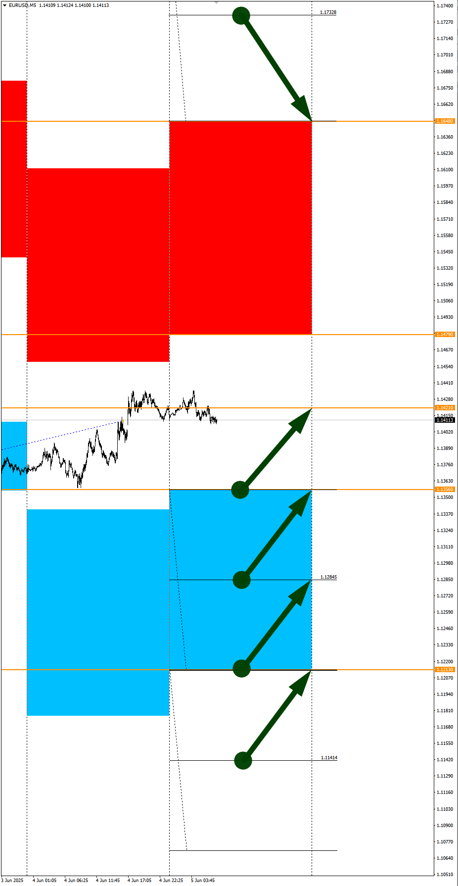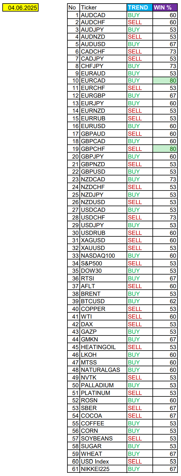 Опубликовано 4 июня, 20254 июнь Автор EURCAD, GBPCHF в фокусе. Сезонные тенденции и вероятности на Среду 04.06.2025Здравствуйте Уважаемые трейдеры! С Вами снова Александр Борских. Подготовил для Вас свежую информацию.Очередные сезонные тенденции на Среду 04 Июня 2025 по основным мажорам финансовых рынков.Весь перечень анализируемых активов указан ниже в общем количестве 61 инструмента. Здесь Вы найдете активы рынка Форекс, популярные активы Московской биржи, не менее популярные активы Чикагской биржи СМЕ и мажор криптовалютного сегмента - Биткоин, за которым следуют все альткоины.Первый блок информации с зонами лимитных покупок и продаж. Данная информация включает в себя не только статистический показатель волатильности каждого актива, но и ближайшие опционные страйки с учетом премий за риск (Для верных расчетов рекомендуется просмотреть теоретическое видео в свободном доступе - Как использовать блок сезонности). А теперь сам блок информации №1:Второй блок информации с направленным вектором движения и вероятностями (внимательно обращаем внимание на цену открытия каждого актива. Обязательно для верных расчетов берем только цену открытия спотового актива). Как использовать вероятности в отношении цены открытия спотового актива - смотрим видео в открытом доступе (Как использовать блок сезонности). Данная информация с вероятностями поможет определить какова вероятность закрытия дня в отношении цены открытия этого же дня.А теперь сам блок информации №2:А теперь примеры построения блоков лимитных позиций и уточнение по сезонности с вероятностями отработки каждого актива по основным мажорам. По остальным активам, просмотрев теоретическое видео (Как использовать блок сезонности) - сможете построить лимитные блоки покупок и продаж самостоятельно. Ниже для примера продемонстрирую на сегодняшний день три основных мажора: Евро (EURUSD), Золото (XAUUSD), индекс НАСДАК (NASDAQ).EURUSDПо Евро сегодня вероятность 60% к закрытию дня закрыть день выше цены открытия дня 1,1384.Зона покупок 1,1340-1,1176. Но новые покупки ожидаем от уровня 1,10941 и ниже с целью 1,1176. В покупках сокращаем торговый объем раза в 4, т.к. возможна смена фон доллара США при возврате цены в зону покупок.Зона продаж 1,1457-1,1611. Но новые продажи ожидаем от уровня 1,1688 и выше с целью 1,1611. В продажах сокращаем торговый объем раза в 4, пока текущий фон доллара США все еще слабый.XAUUSDПо Золоту сегодня вероятность 53% к закрытию дня закрыть день ниже цены открытия дня 3360,13.Зона покупок 3347,22-3326,66. Но новые покупки ожидаем от уровня 3316,33 и ниже с целью 3326,66. В покупках сокращаем торговый объем раза в 4, т.к. баланс.Зона продаж 3370,60-3393,88. Но новые продажи ожидаем от уровня 3405,51 и выше с целью 3393,88. В продажах сокращаем торговый объем раза в 4, т.к. баланс.NASDAQПо индексу сегодня вероятность 60% к закрытию дня закрыть день выше цены открытия дня 21672,00.Зона покупок 21608,60-21279,00. Но новые покупки ожидаем от уровня 21114,60 и ниже с целью 21279,00. В покупках сокращаем торговый объем раза в 4, т.к. возможен баланс в зоне покупок.Зона продаж 21742,52-21924,00. Но новые продажи ожидаем от уровня 22014,20 и выше с целью 21924,00. В продажах сокращаем торговый объем раза в 4, т.к. пока текущий фон доллара США пока еще слабый.А теперь новостная лента ожиданий аналитических агентств и разбор отдельных показателей на сегодняшний день, чего ожидать на основных торговых сессиях. Т