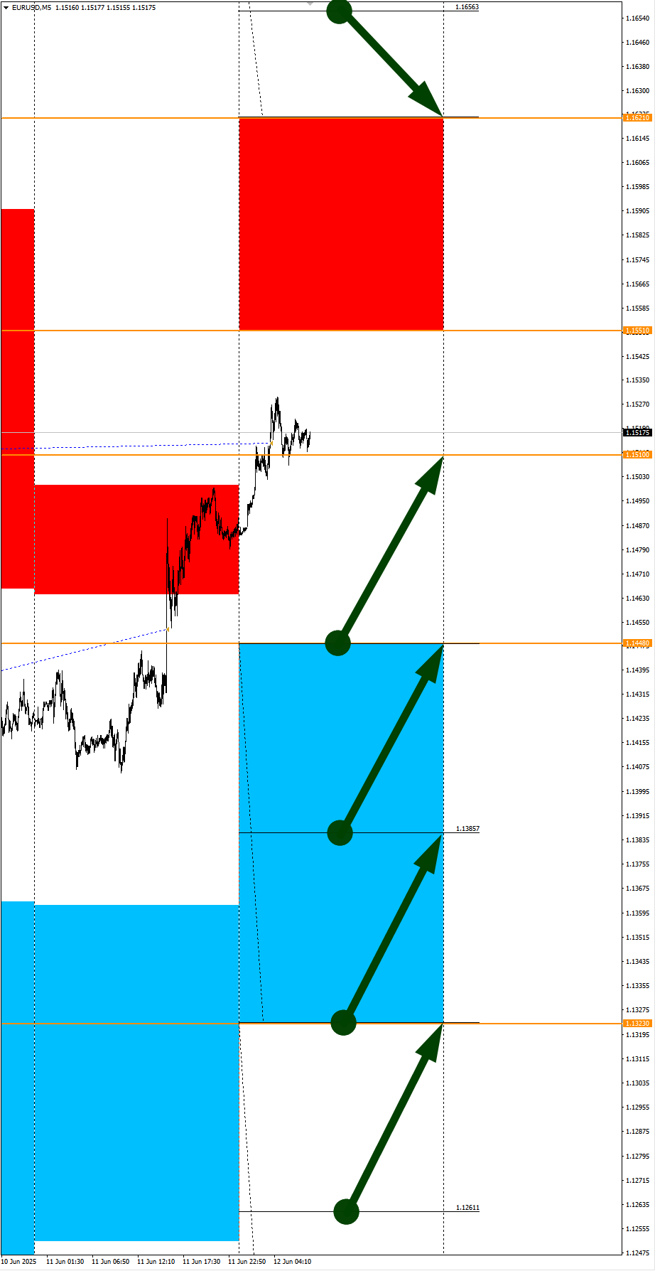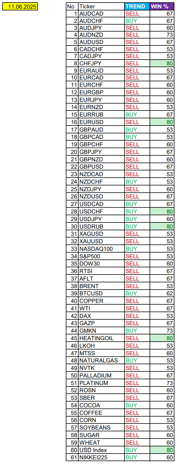 Опубликовано 11 июня, 202511 июнь Автор Локальное укрепление USD. Сезонные тенденции и вероятности на Среду 11.06.2025Здравствуйте Уважаемые трейдеры! С Вами снова Александр Борских. Подготовил для Вас свежую информацию.Очередные сезонные тенденции на Среду 11 Июня 2025 по основным мажорам финансовых рынков.Весь перечень анализируемых активов указан ниже в общем количестве 61 инструмента. Здесь Вы найдете активы рынка Форекс, популярные активы Московской биржи, не менее популярные активы Чикагской биржи СМЕ и мажор криптовалютного сегмента - Биткоин, за которым следуют все альткоины.Первый блок информации с зонами лимитных покупок и продаж. Данная информация включает в себя не только статистический показатель волатильности каждого актива, но и ближайшие опционные страйки с учетом премий за риск (Для верных расчетов рекомендуется просмотреть теоретическое видео в свободном доступе - Как использовать блок сезонности). А теперь сам блок информации №1:Второй блок информации с направленным вектором движения и вероятностями (внимательно обращаем внимание на цену открытия каждого актива. Обязательно для верных расчетов берем только цену открытия спотового актива). Как использовать вероятности в отношении цены открытия спотового актива - смотрим видео в открытом доступе (Как использовать блок сезонности). Данная информация с вероятностями поможет определить какова вероятность закрытия дня в отношении цены открытия этого же дня.А теперь сам блок информации №2:А теперь примеры построения блоков лимитных позиций и уточнение по сезонности с вероятностями отработки каждого актива по основным мажорам. По остальным активам, просмотрев теоретическое видео (Как использовать блок сезонности) - сможете построить лимитные блоки покупок и продаж самостоятельно. Ниже для примера продемонстрирую на сегодняшний день три основных мажора: Евро (EURUSD), Золото (XAUUSD), индекс НАСДАК (NASDAQ).EURUSDПо Евро сегодня вероятность 80% к закрытию дня закрыть день ниже цены открытия дня 1,1438Зона покупок 1,1362-1,1251 с целью 1,1438. Покупки в приоритете пока фон доллара США слабыйЗона продаж 1,1464-1,1500. Но новые продажи ожидаем от уровня 1,15183 и выше с целью 1,1500. В продажах сокращаем торговый объем раза в 4, т.к. общий тренд восходящий.XAUUSDПо Золоту сегодня вероятность 53% к закрытию дня закрыть день ниже цены открытия дня 3327,99.Зона покупок 3315,00-3303,64 с целью 3327,99. Покупки в приоритете пока фон доллара США слабый (следим за возможной сменой в баланс)Зона продаж 3335,27-3356,37. Но новые продажи ожидаем от уровня 3366,91 и выше с целью 3356,37. В продажах сокращаем торговый объем раза в 4, т.к. текущий тренд пока еще восходящий (следим за возможной сменой в баланс)NASDAQПо индексу сегодня вероятность 53% к закрытию дня закрыть день выше цены открытия дня 21937,00Зона покупок 21826,27-21435,25 с целью 21937,00. Покупки в приоритете пока фон доллара США слабый (внимательно в момент локального укрепления USD на открытии амер. сессии)Зона продаж 21980,08-22107,50. Но новые продажи ожидаем от уровня 22171,32 и выше с целью 22107,50. В продажах сокращаем торговый объем раза в 4, пока общий тренд восходящий.А теперь новостная лента ожиданий аналитических агентств и разбор отдельных показателей на сегодняшний день, чего ожидать на основных торговых сессиях. Также укажем фон доллара США, сильный на текущий момент или же слабый. От фона доллара США будет зав
