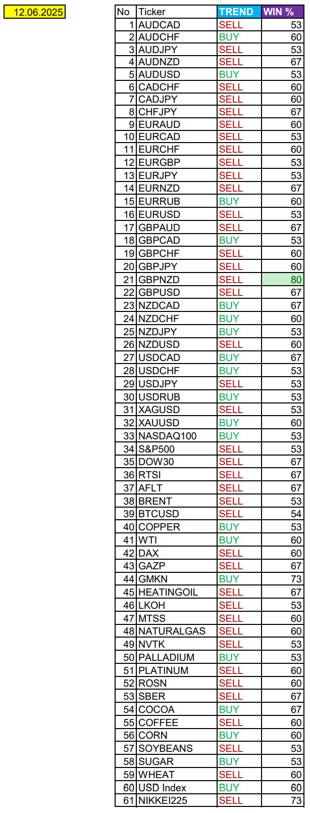 Опубликовано 12 июня, 202512 июнь Автор GBPNZD в фокусе дня. Сезонные тенденции и вероятности на Четверг 12.06.2025Здравствуйте Уважаемые трейдеры! С Вами снова Александр Борских. Подготовил для Вас свежую информацию.Очередные сезонные тенденции на Четверг 12 Июня 2025 по основным мажорам финансовых рынков.Весь перечень анализируемых активов указан ниже в общем количестве 61 инструмента. Здесь Вы найдете активы рынка Форекс, популярные активы Московской биржи, не менее популярные активы Чикагской биржи СМЕ и мажор криптовалютного сегмента - Биткоин, за которым следуют все альткоины.Первый блок информации с зонами лимитных покупок и продаж. Данная информация включает в себя не только статистический показатель волатильности каждого актива, но и ближайшие опционные страйки с учетом премий за риск (Для верных расчетов рекомендуется просмотреть теоретическое видео в свободном доступе - Как использовать блок сезонности). А теперь сам блок информации №1:Второй блок информации с направленным вектором движения и вероятностями (внимательно обращаем внимание на цену открытия каждого актива. Обязательно для верных расчетов берем только цену открытия спотового актива). Как использовать вероятности в отношении цены открытия спотового актива - смотрим видео в открытом доступе (Как использовать блок сезонности). Данная информация с вероятностями поможет определить какова вероятность закрытия дня в отношении цены открытия этого же дня.А теперь сам блок информации №2:А теперь примеры построения блоков лимитных позиций и уточнение по сезонности с вероятностями отработки каждого актива по основным мажорам. По остальным активам, просмотрев теоретическое видео (Как использовать блок сезонности) - сможете построить лимитные блоки покупок и продаж самостоятельно. Ниже для примера продемонстрирую на сегодняшний день три основных мажора: Евро (EURUSD), Золото (XAUUSD), индекс НАСДАК (NASDAQ).EURUSDПо Евро сегодня вероятность 53% к закрытию дня закрыть день ниже цены открытия дня 1,1510Зона покупок 1,1448-1,1323 с целью 1,1510. Покупки в приоритете пока фон доллара США слабый.Зона продаж 1,1551-1,1621. Но новые продажи ожидаем от уровня 1,16563 и выше с целью 1,1621. В продажах сокращаем торговый объем раза в 4, т.к. тренд восходящий.XAUUSDПо Золоту сегодня вероятность 60% к закрытию дня закрыть день выше цены открытия дня 3365,58Зона покупок 3356,72-3341,23 с целью 3365,58. Часть покупок отработали с открытия дня от уровня 3356,72 до цели 3365,58. Новые покупки ожидаем от уровня 3348,99 и ниже с целями на графике. Покупки в приоритете пока фон доллара США слабый.Зона продаж 3377,34-3393,96. Но новые продажи ожидаем от уровня 3402,33 и выше с целью 3393,96. В продажах сокращаем торговый объем раза в 4, т.к. текущий тренд все еще восходящий.NASDAQПо индексу сегодня вероятность 53% закрыть день выше цены открытия дня 21812,00.Зона покупок 21735,18-21333,50 с целью 21812,00. Покупки в приоритете пока фон доллара США слабый.Зона продаж 21885,00-21182,00. Но новые продажи ожидаем от уровня 22331,07 и выше с целью 21182,00. В продажах сокращаем торговый объем раза в 4, т.к. тренд все еще восходящий.А теперь новостная лента ожиданий аналитических агентств и разбор отдельных показателей на сегодняшний день, чего ожидать на основных торговых сессиях. Также укажем фон доллара США, сильный на текущий момент или же слабый. От фона доллара США будет зависеть направленное движение самой пар