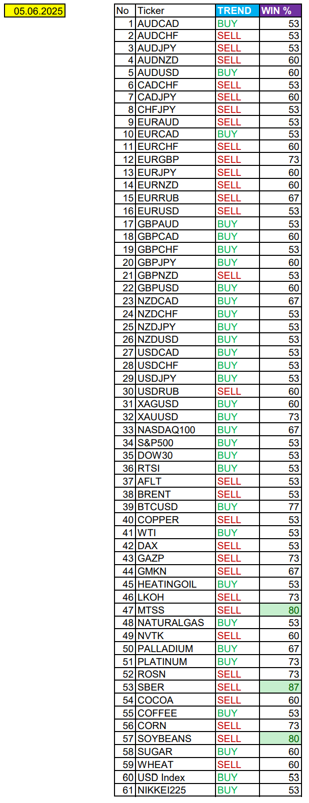 Опубликовано 9 июня, 20259 июнь Автор AUDCAD, EURCAD, ZW. Сезонные тенденции и вероятности на Понедельник 09.06.2025Здравствуйте Уважаемые трейдеры! С Вами снова Александр Борских. Подготовил для Вас свежую информацию.Очередные сезонные тенденции на Понедельник 09 Июня 2025 по основным мажорам финансовых рынков.Весь перечень анализируемых активов указан ниже в общем количестве 61 инструмента. Здесь Вы найдете активы рынка Форекс, популярные активы Московской биржи, не менее популярные активы Чикагской биржи СМЕ и мажор криптовалютного сегмента - Биткоин, за которым следуют все альткоины.Первый блок информации с зонами лимитных покупок и продаж. Данная информация включает в себя не только статистический показатель волатильности каждого актива, но и ближайшие опционные страйки с учетом премий за риск (Для верных расчетов рекомендуется просмотреть теоретическое видео в свободном доступе - Как использовать блок сезонности). А теперь сам блок информации №1:Второй блок информации с направленным вектором движения и вероятностями (внимательно обращаем внимание на цену открытия каждого актива. Обязательно для верных расчетов берем только цену открытия спотового актива). Как использовать вероятности в отношении цены открытия спотового актива - смотрим видео в открытом доступе (Как использовать блок сезонности). Данная информация с вероятностями поможет определить какова вероятность закрытия дня в отношении цены открытия этого же дня.А теперь сам блок информации №2:А теперь примеры построения блоков лимитных позиций и уточнение по сезонности с вероятностями отработки каждого актива по основным мажорам. По остальным активам, просмотрев теоретическое видео (Как использовать блок сезонности) - сможете построить лимитные блоки покупок и продаж самостоятельно. Ниже для примера продемонстрирую на сегодняшний день три основных мажора: Евро (EURUSD), Золото (XAUUSD), индекс НАСДАК (NASDAQ).EURUSDПо Евро сегодня вероятность 73% к закрытию дня закрыть день ниже цены открытия дня 1,1407.Зона покупок 1,1339-1,1279 с целью 1,1407. Покупки в приоритете пока фон доллара США слабый.Зона продаж 1,1449-1,1512. НО новые продажи ожидаем от уровня 1,15434 и выше с целью 1,1512. В продажах сокращаем торговый объем раза в 4, т.к. общий тренд восходящий.XAUUSDПо Золоту сегодня вероятность 53% к закрытию дня закрыть день ниже цены открытия дня 3318,07.Зона покупок 3302,05-3228,34. Но новые покупки ожидаем от уровня 3191,54 и ниже с целью 3228,34. В покупках сокращаем торговый объем раза в 4, т.к. баланс.Зона продаж 3325,84-3338,57. НО новые продажи ожидаем от уровня 3345,06 и выше с целью 3338,57. В продажах сокращаем торговый объем раза в 4, т.к. баланс.NASDAQПо индексу сегодня вероятность 53% к закрытию дня закрыть день выше цены открытия дня 21739,00.Зона покупок 21665,87-21369,25 с целью 21739,00. Покупки в приоритете пока фон доллара США слабый.Зона продаж 21798,25-21925,50. Но новые продажи ожидаем от уровня 21988,88 и выше с целью 21925,50. В продажах сокращаем торговый объем раза в 4, т.к. тренд восходящий.А теперь новостная лента ожиданий аналитических агентств и разбор отдельных показателей на сегодняшний день, чего ожидать на основных торговых сессиях. Также укажем фон доллара США, сильный на текущий момент или же слабый. От фона доллара США будет зависеть направленное движение самой пары.НОВОСТИ сегодня:Фон доллара США слабыйСегодняшний день без важных новостных событийВ