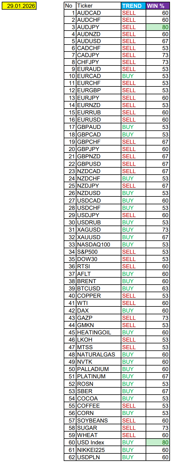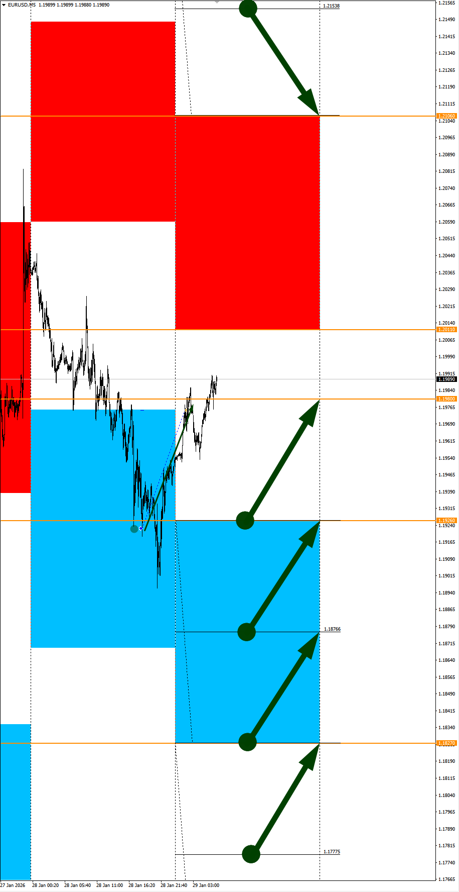 Опубликовано 9 часов назад9 ч. Сезонные тенденции и вероятности на четверг 29.01.2026Здравствуйте Уважаемые трейдеры! С Вами снова Александр Борских. Подготовил для Вас свежую информацию.Очередные сезонные тенденции на четверг 29 января 2026 по основным мажорам финансовых рынков.Весь перечень анализируемых активов указан ниже в общем количестве 62 инструмента. Здесь Вы найдете активы рынка Форекс, популярные активы Московской биржи, не менее популярные активы Чикагской биржи СМЕ и мажор криптовалютного сегмента - Биткоин, за которым следуют все альткоины.Первый блок информации с зонами лимитных покупок и продаж. Данная информация включает в себя не только статистический показатель волатильности каждого актива, но и ближайшие опционные страйки с учетом премий за риск (Для верных расчетов рекомендуется просмотреть теоретическое видео в свободном доступе - Как использовать блок сезонности). А теперь сам блок информации №1:Второй блок информации с направленным вектором движения и вероятностями (внимательно обращаем внимание на цену открытия каждого актива. Обязательно для верных расчетов берем только цену открытия спотового актива). Как использовать вероятности в отношении цены открытия спотового актива - смотрим видео в открытом доступе (Как использовать блок сезонности). Данная информация с вероятностями поможет определить какова вероятность закрытия дня в отношении цены открытия этого же дня.А теперь сам блок информации №2:А теперь примеры построения блоков лимитных позиций и уточнение по сезонности с вероятностями отработки каждого актива по основным мажорам. По остальным активам, просмотрев теоретическое видео (Как использовать блок сезонности) - сможете построить лимитные блоки покупок и продаж самостоятельно. Ниже для примера продемонстрирую на сегодняшний день три основных мажора: Евро (EURUSD), Золото (XAUUSD), индекс НАСДАК (NASDAQ).EURUSDПо Евро сегодня вероятность 60% к закрытию дня закрыть день ниже цены открытия дня 1,1980Зона покупок 1,1926-1,1827 с целью 1,1980. Покупки в приоритете пока фон доллара США слабыйЗона продаж 1,2011-1,2106. Но новые продажи ожидаем от уровня 1,21538 и выше с целью 1,2106. В продажах сокращаем торговый объем раза в 4, т.к. тренд восходящийXAUUSDПо Золоту сегодня вероятность 67% к закрытию дня закрыть день выше цены открытия дня 5512,96Зона покупок 5504,04-5480,22. Но новые покупки отработали с открытия дня от уровня 5468,77 и ниже с целью 5480,22. В покупках сокращаем торговый объем раза в 4, т.к. балансЗона продаж 5524,46-5548,09. Но новые продажи отработали на азии от уровня 5560,04 и выше с целью 5548,09. В продажах сокращаем торговый объем раза в 4, т.к. баланс. На малых депозитах исключаем работу с продажами в период возможной эскалации военного конфликта между США и Ираном!NASDAQПо индексу сегодня вероятность 53% к закрытию дня закрыть день выше цены открытия дня 26146,00Зона покупок 26059,38-25809,25 с целью 26146,00. Часть покупок активно от уровня 26059,38 с целью 26146,00. Новые покупки ожидаем от уровня 25934,50 и ниже с целями на графике. Покупки в приоритете пока фон доллара США слабыйЗона продаж 26231,52-26420,25. Но новые продажи ожидаем от уровня 26514,85 и выше с целью 26420,25. В продажах сокращаем торговый объем раза в 4, т.к. тренд восходящийА теперь новостная лента ожиданий аналитических агентств и разбор отдельных показателей на сегодняшний день, чего ожидать на основных торговых сессия